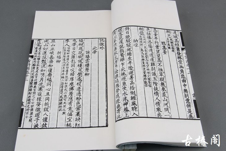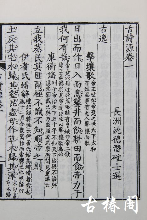 《古诗源》编成后三百多年来风行不废,但刻印俱精者凤毛麟角。康熙己亥年是书首刻于沈德潜家宅竹啸轩,写刻上板,书法精湛,墨色浓郁,开卷即令人赏心悦目,为最初印本,非后来翻刻本可比。扉页牌记用云母笺刷印,在雕版印刷史上是罕见的。沈德潜自刻本,却常采用此种云母笺来制作扉页牌记,成为沈德潜刻本的标记,实乃清三代之精刻名品。乙未之秋,扬州古椿阁据沈德潜家写刻本限量原大影印,板框尺寸悉准原书,并把原书云母纹扉页全彩印附于书前,以飨古诗的广大拥趸,籍以表达对古诗道的崇仰。