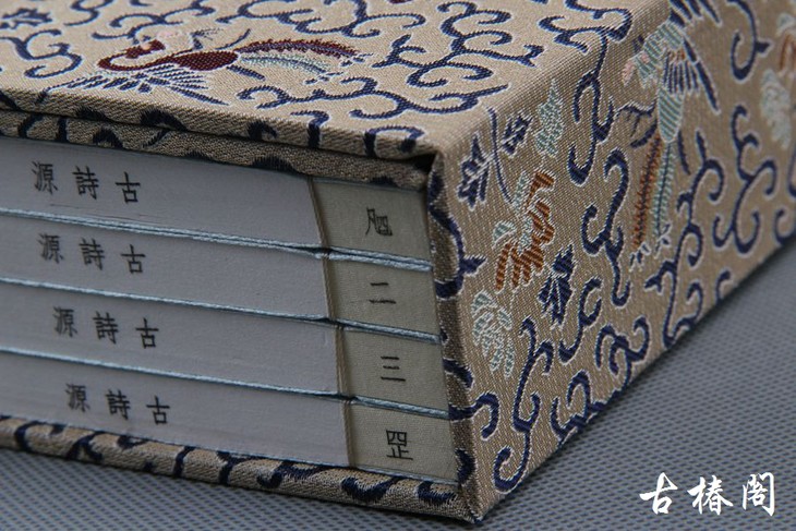 此书由古椿阁旗下邗江古籍印刷厂三十年经验的老师傅纯手工制作,工艺精良,内页采用泾县手工宣纸(古椿阁从来不用机器宣纸)。因为古诗是指唐以前的诗歌,浪漫主义色彩浓厚,在文化符号上常见有朱雀青龙飞凤等图腾。精品花绫封面和宋锦函套用料选用的朱雀云纹和飞凤草木纹,也是体现一种凤舞九天的神话气质。