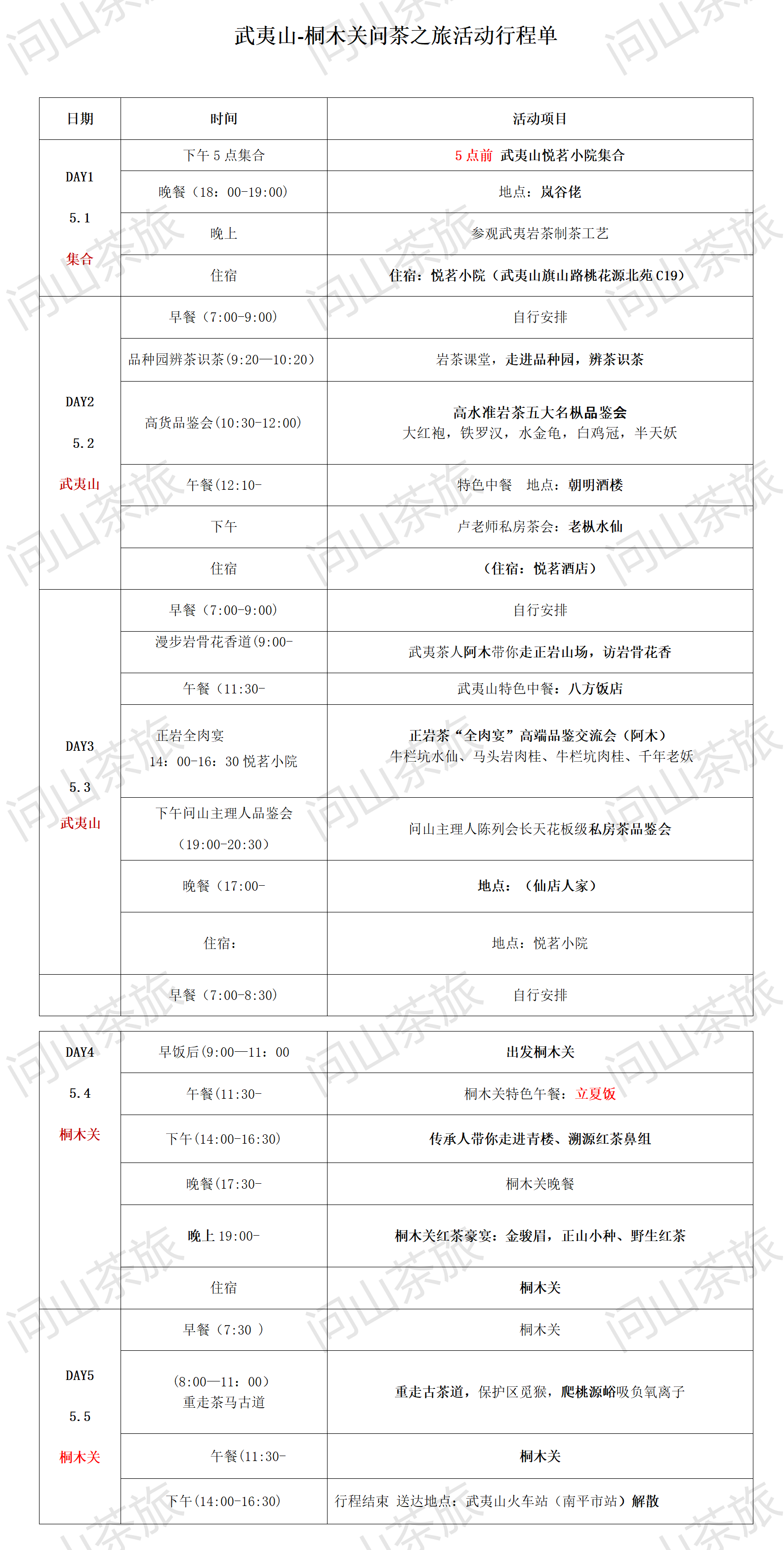 大交通:本次茶旅活动不包含大交通费用,需要您自行购买往返武夷山的机票或火车票。五一期间出游人数较多,建议您提前规划行程,购买合适的交通工具。
