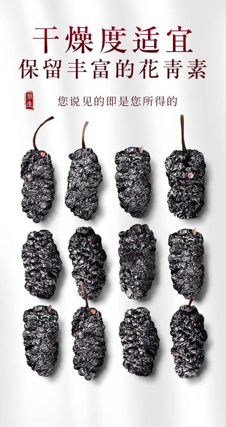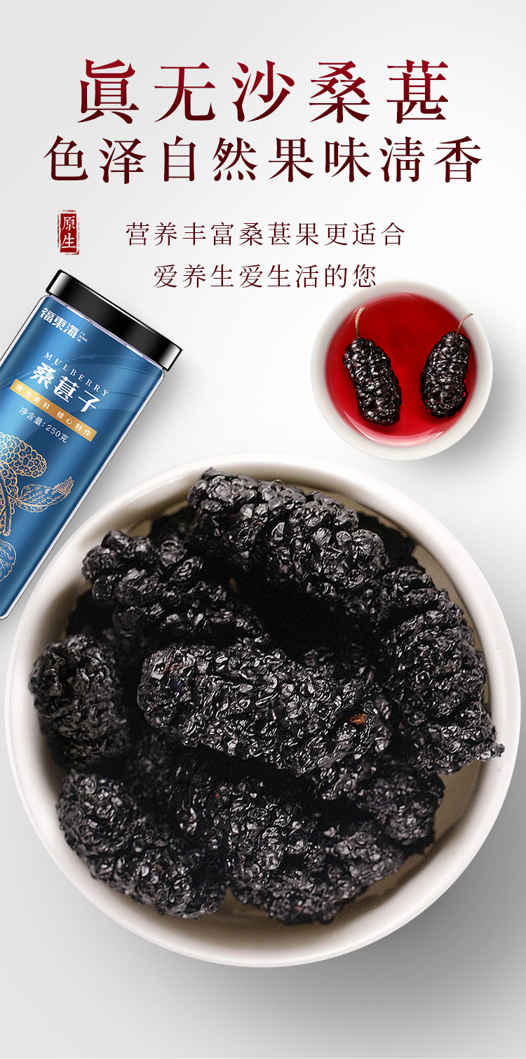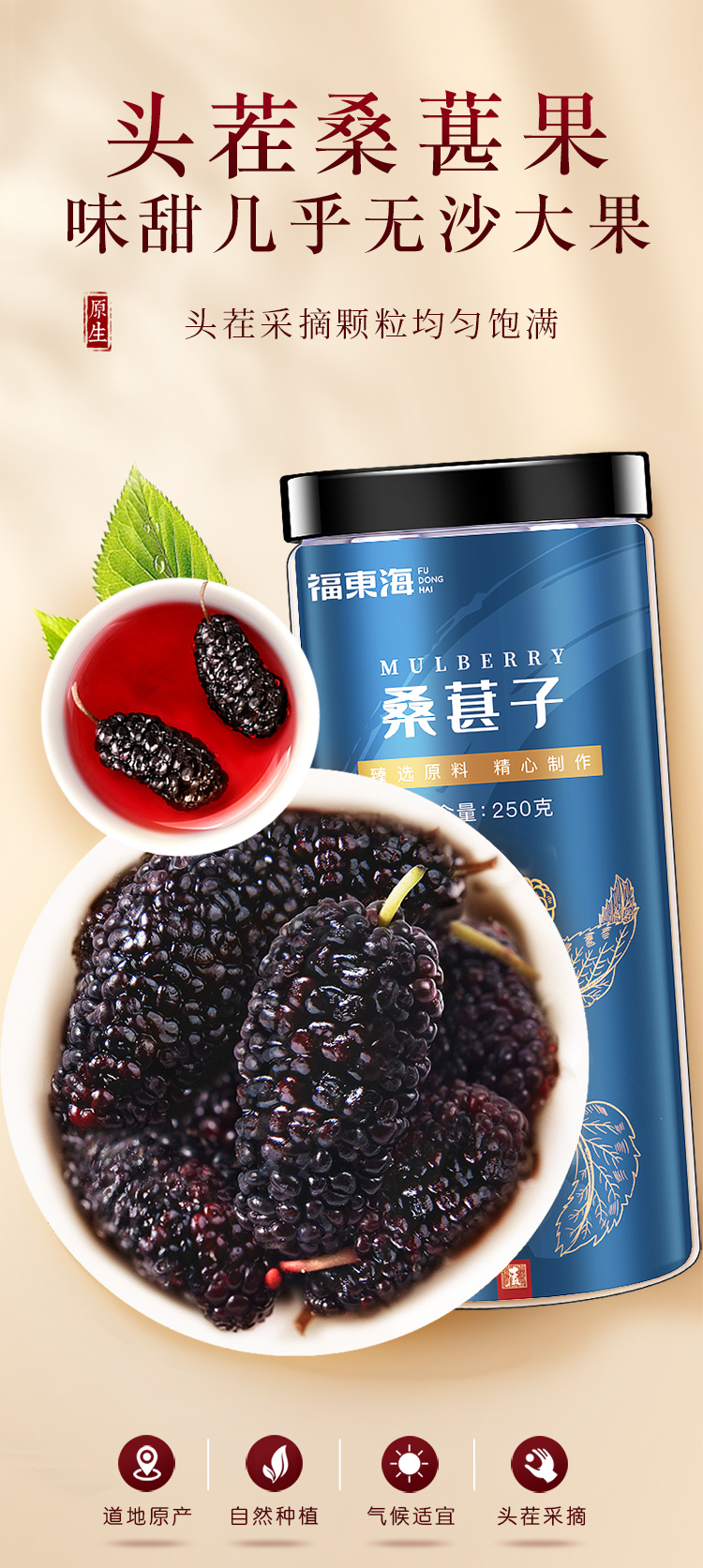 福东海拥有千亩桑葚种植基地,当地土地肥沃,富有丰富的硒,经过严格的管理,不喷农药,坚持自然生长无任何污染,使得桑葚质量更高。当成熟的桑葚蓄满了紫黑色的果汁时,会由专人挑选个大饱满的头茬桑葚进行人工采摘,坚决不用落地果,而是选出深紫黑的甜度高、汁水足、外形饱满的桑葚进行制作。新鲜采摘下来的桑葚被迅速送到生产车间,再经过手工挑选进行多次清洗、沥干,采用低温烘干工艺保证果干的营养物质不受破坏,最后进行灭菌消毒,确保食品的健康安全。桑葚干在制作过程中没有添加额外的糖分,每一颗都是自然的味道,从原料到成品,每一罐桑葚子都经历了数道严苛检验,所以福东海的桑葚干不必再经过清洗,可直接食用,锁鲜包装更是将桑葚的营养成分牢牢锁住,不易变质,还原自然味道,大人小孩都可以放心食用。