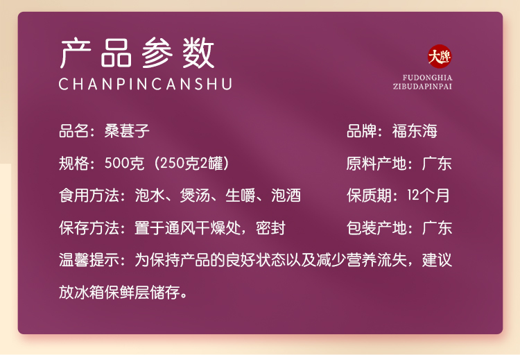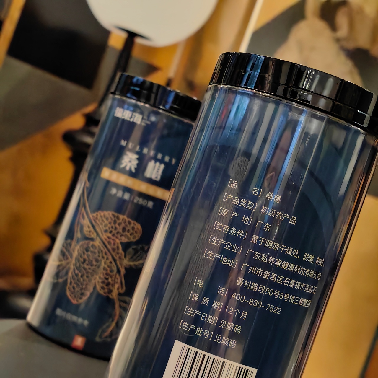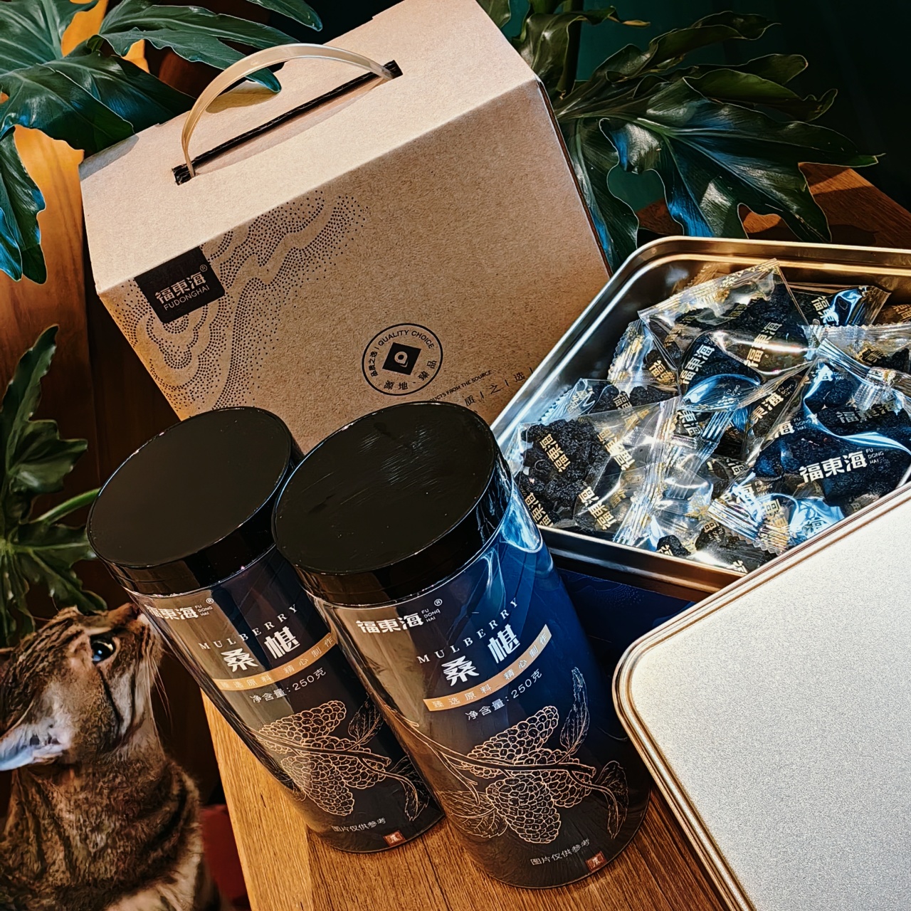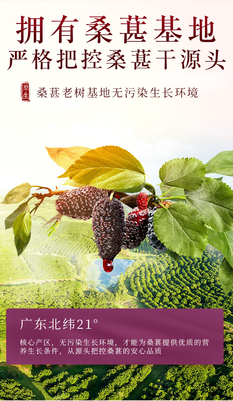 福东海拥有千亩桑葚种植基地,当地土地肥沃,富有丰富的硒,经过严格的管理,不喷农药,坚持自然生长无任何污染,使得桑葚质量更高。当成熟的桑葚蓄满了紫黑色的果汁时,会由专人挑选个大饱满的头茬桑葚进行人工采摘,坚决不用落地果,而是选出深紫黑的甜度高、汁水足、外形饱满的桑葚进行制作。新鲜采摘下来的桑葚被迅速送到生产车间,再经过手工挑选进行多次清洗、沥干,采用低温烘干工艺保证果干的营养物质不受破坏,最后进行灭菌消毒,确保食品的健康安全。桑葚干在制作过程中没有添加额外的糖分,每一颗都是自然的味道,从原料到成品,每一罐桑葚子都经历了数道严苛检验,所以福东海的桑葚干不必再经过清洗,可直接食用,锁鲜包装更是将桑葚的营养成分牢牢锁住,不易变质,还原自然味道,大人小孩都可以放心食用。