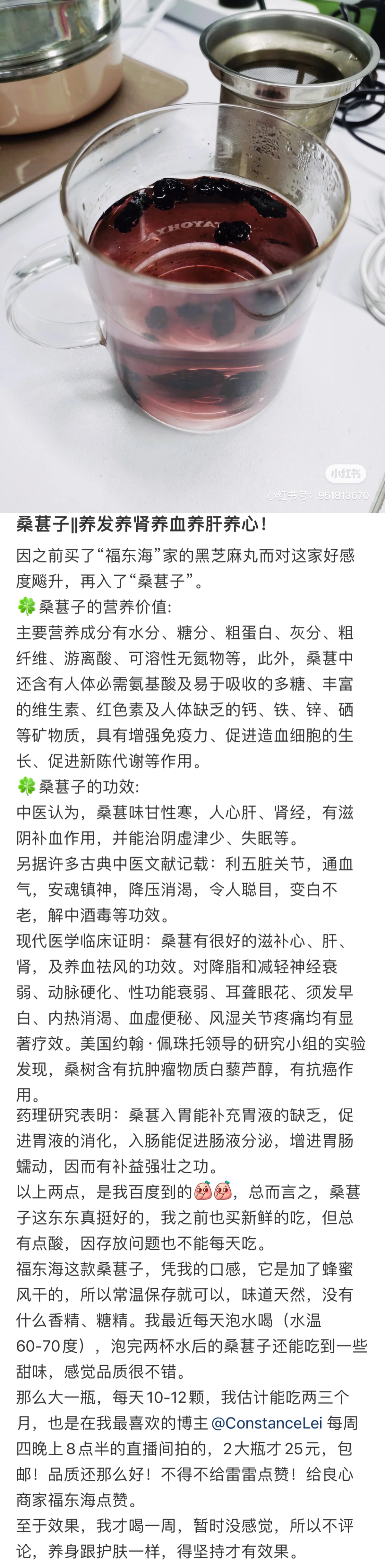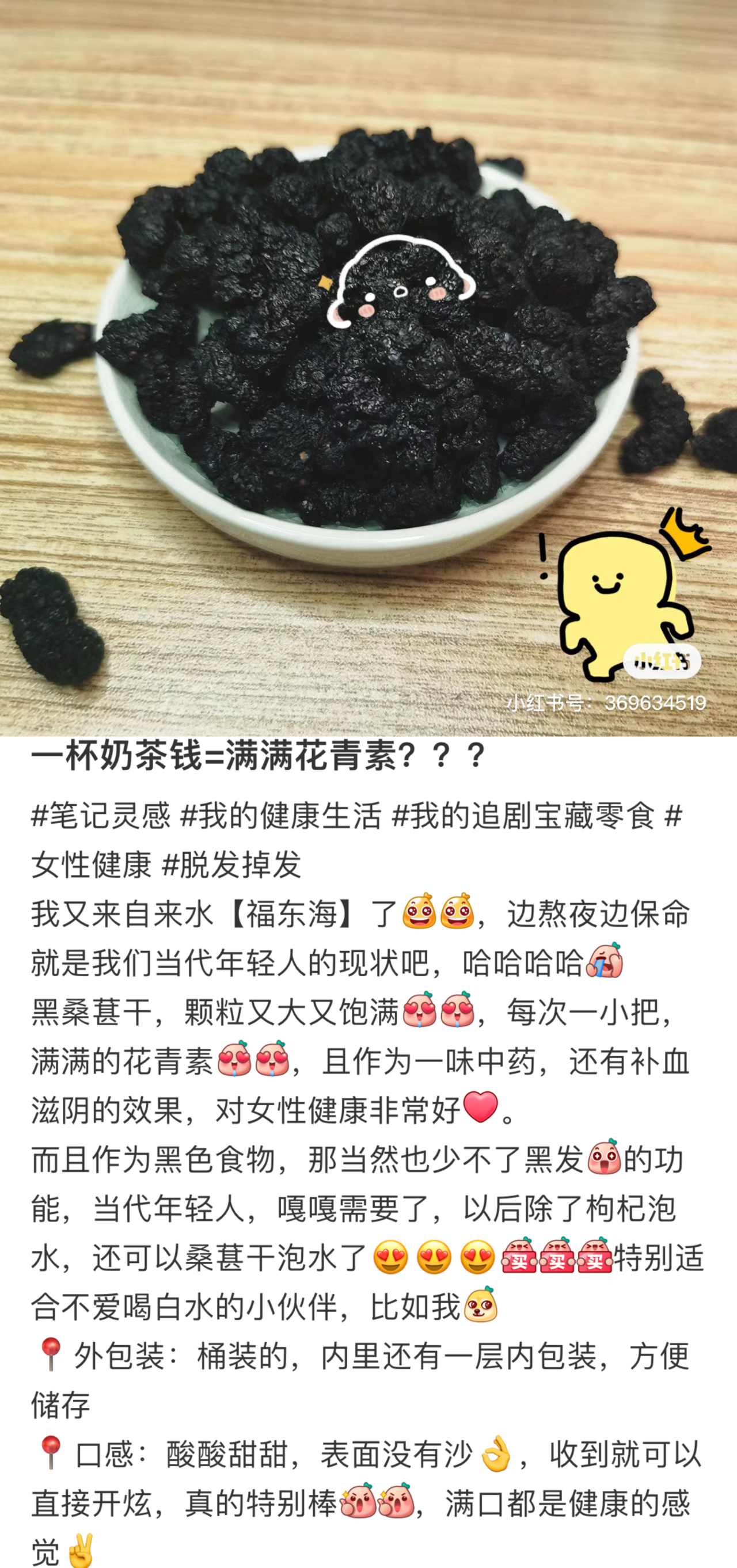 佛系小养生的果干清单又增加啦!福东海的桑葚子,富含维生素C、维生素E、维生素K、钾、钙、铁和纤维等多种营养成分,可以当零食吃,也可以泡水喝,搭配苹果醋还能抗炎抗氧化,熬夜、加班、不停长痘痘的老粉都给我备上!