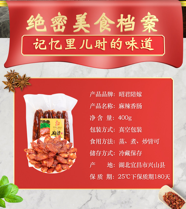 【宜昌助农馆】昭君旅游精选麻辣香肠真空包装400g