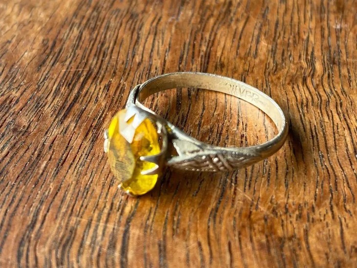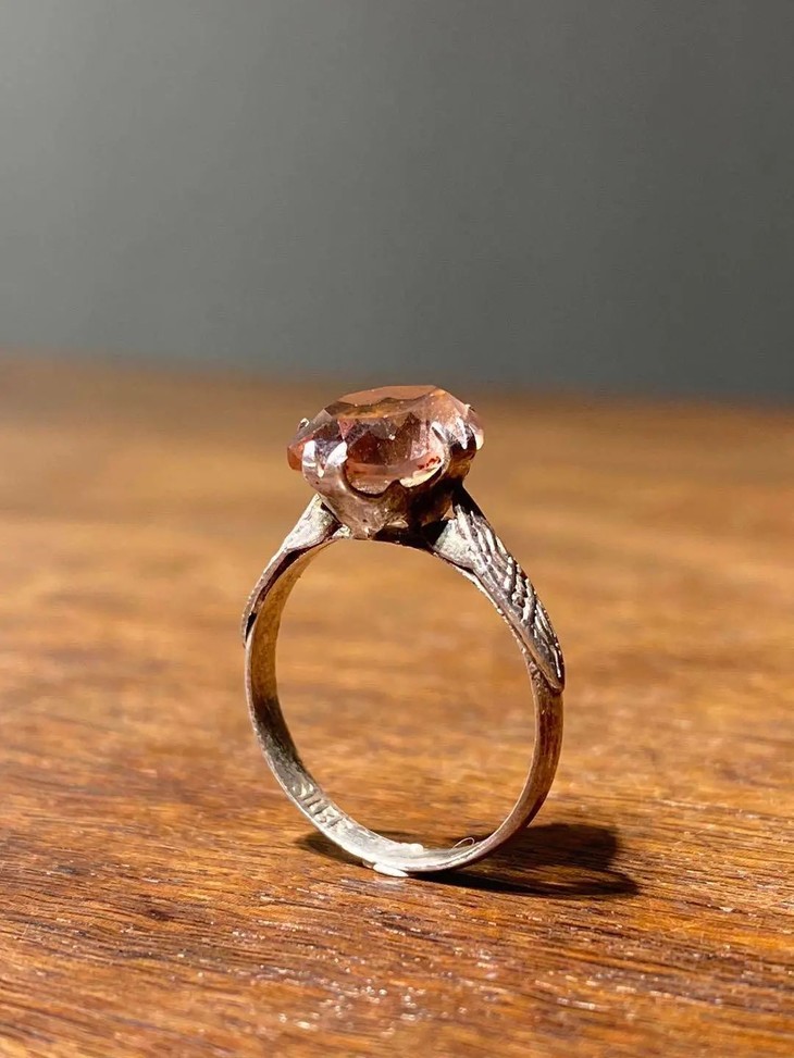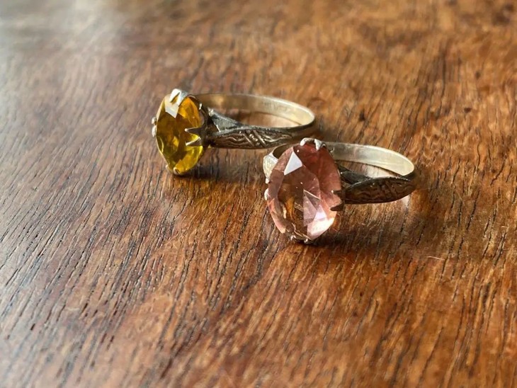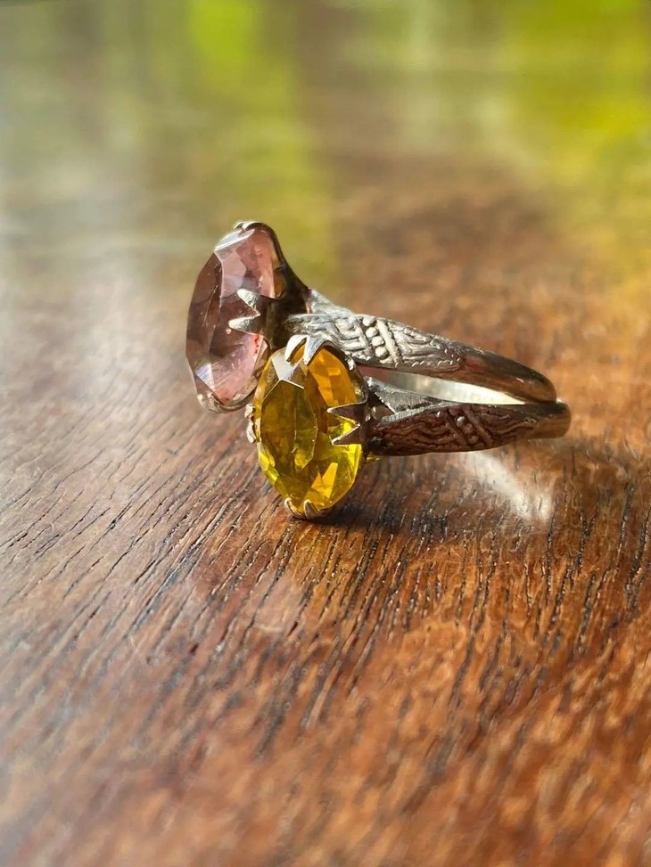 有色半宝石一个黄色,另一个粉红色镶银戒指两件,半宝石应是碧玺或是人造钻石。