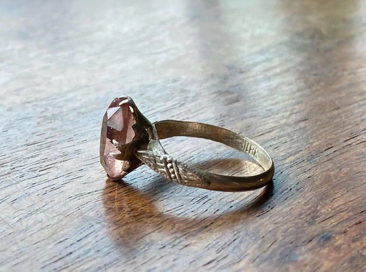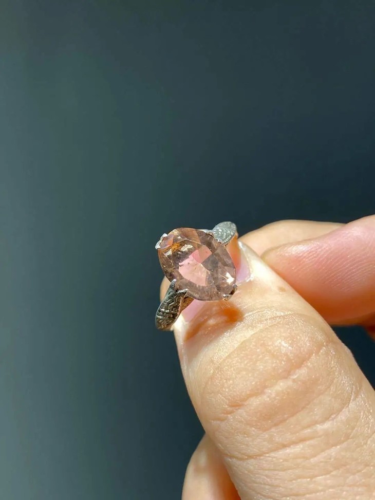 尺寸:共两只戒指:1. 粉宝石戒指(固定圈口):内圈直径:1.7厘米;粉宝石长:1.15厘米;宽度:0.85厘米;重量:1.9克, 2. 黄宝石戒指(固定圈口):内圈直径:1.75厘米;黄宝石长:1厘米;宽度:0.75厘米;重量:1.9克