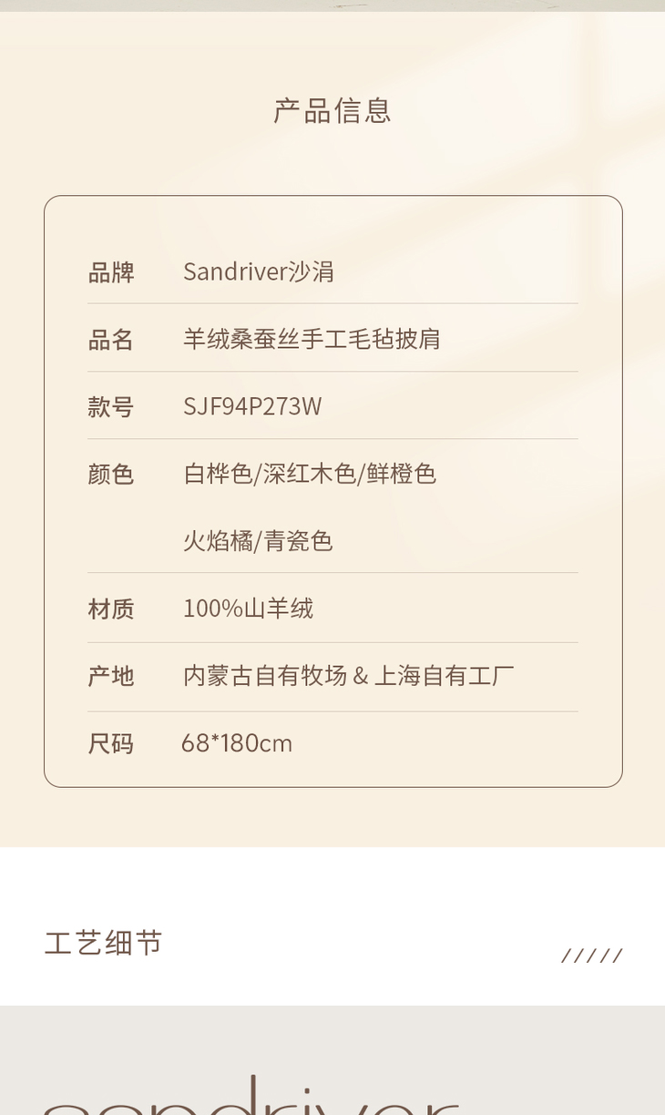 历年在巴黎时装周亮相,享誉世界的艺术羊绒品牌[Sandriver 沙涓]由羊绒布道者郭秀玲女士创立。阿拉善自有牧场纯种羔羊绒,日本国宝设计师小筱顺子,上海自有基地精工细作。承载羊绒情怀,坚持匠人品质。
