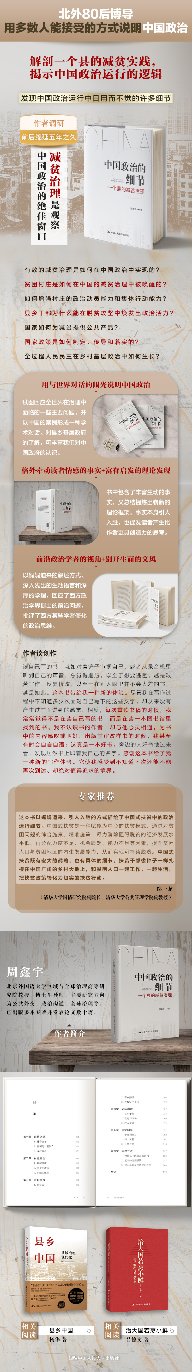 这本书以娓娓道来、引人入胜的方式描绘了中国式扶贫中的政治运行细节。中国式扶贫是一种以赋能为中心的扶贫模式,通过对贫困问题的综合施策、精准施策,统筹消除阻碍脱贫的经济发展水平低、再分配力度不足、机会匮乏、能力不足等因素,提升贫困人口与贫困地区的内生发展能力,从而实现可持续脱贫。中国式扶贫既有宏大的战略,也有具体的细节,扶贫干部像种子一样撒播在中国广阔的乡村大地上,和贫困人口一起工作,一起生活,把扶贫政策转化为切实的扶贫行动。