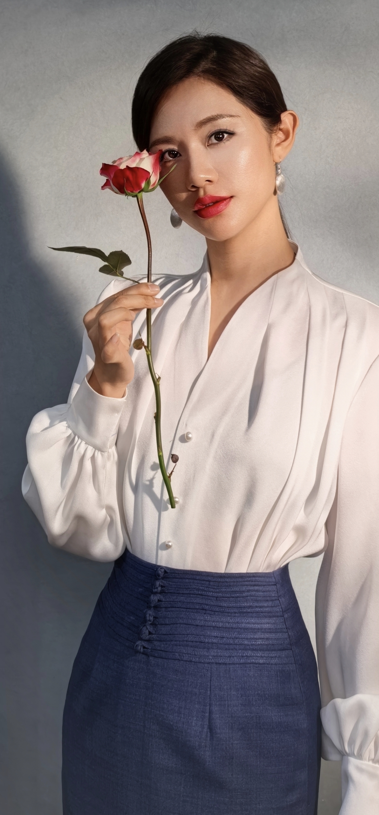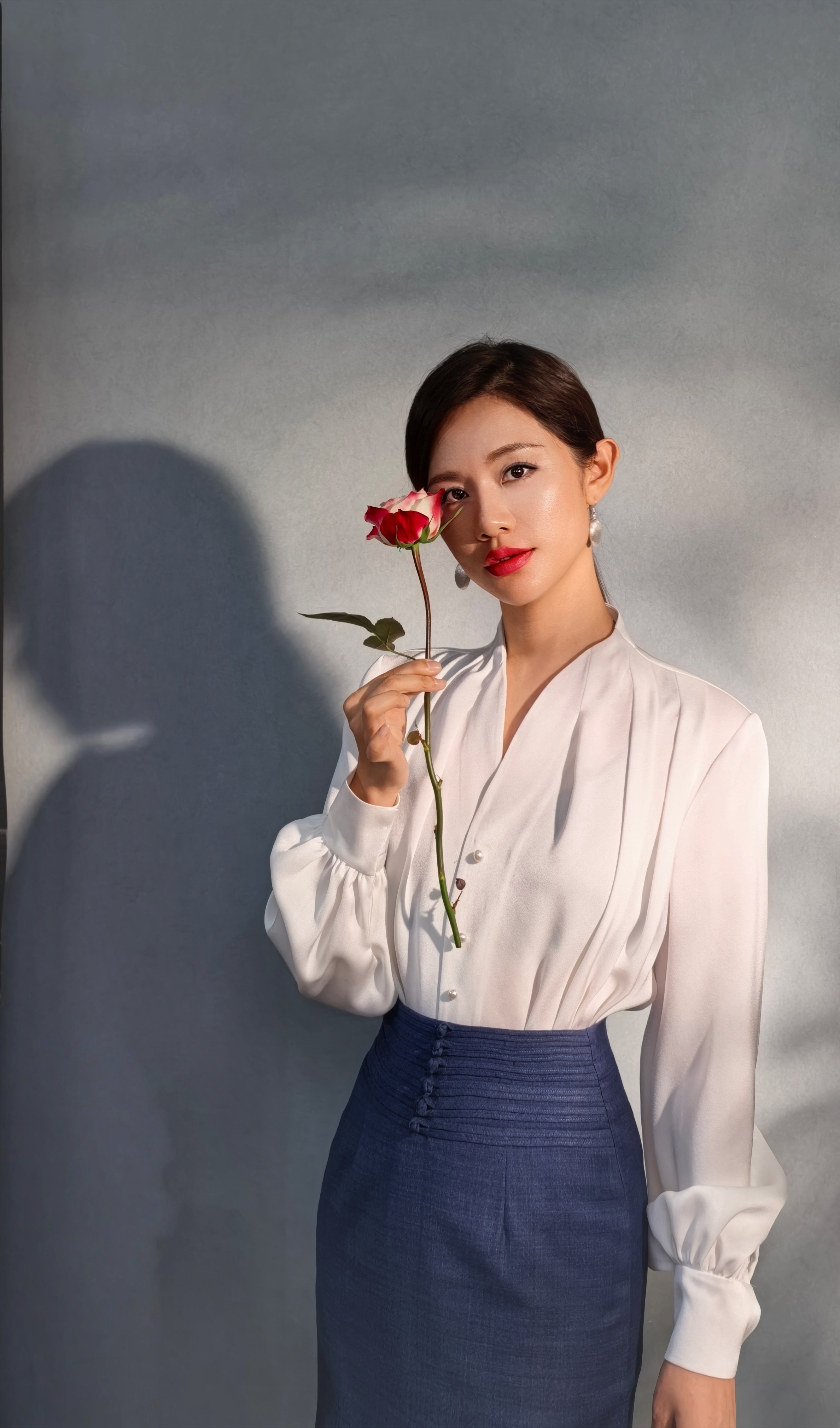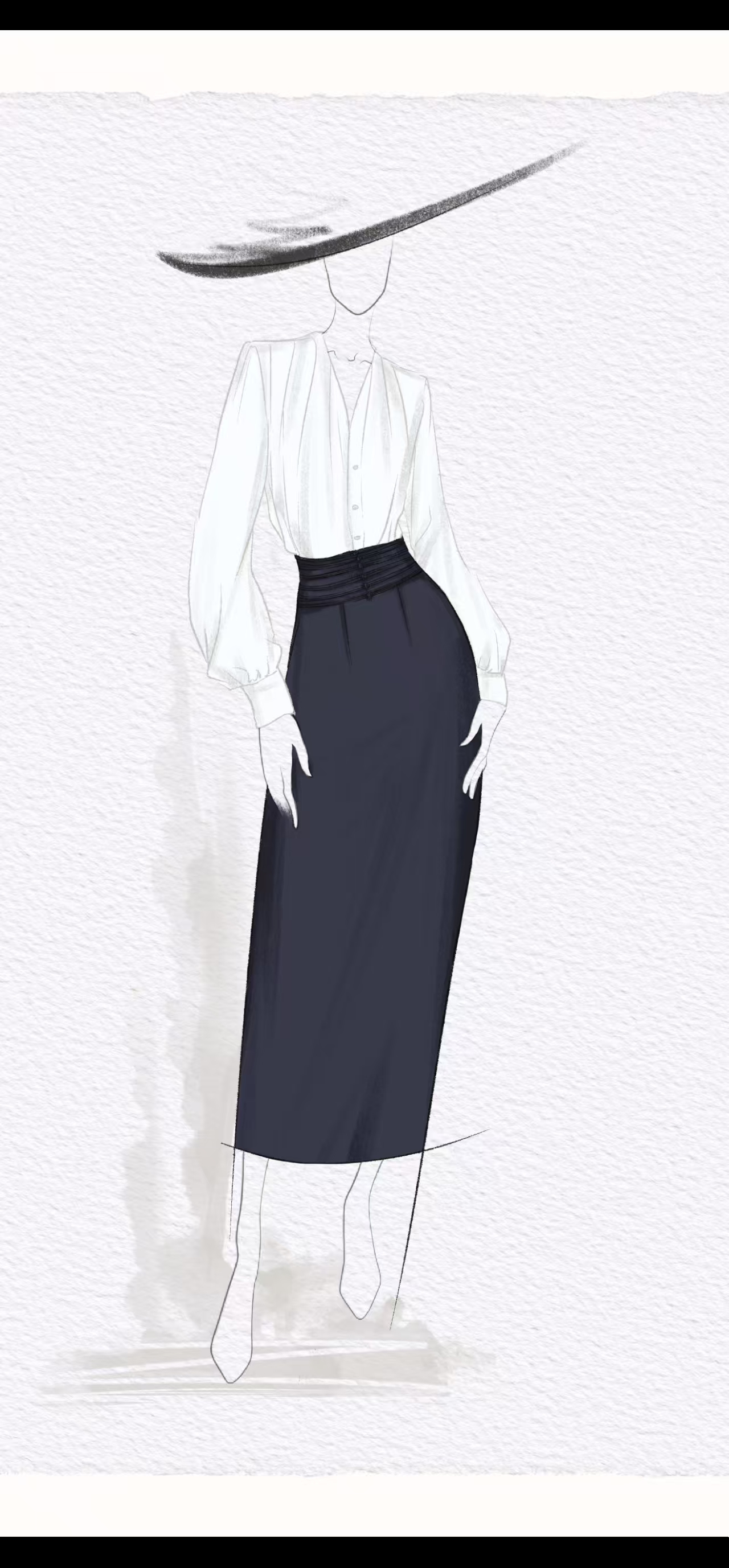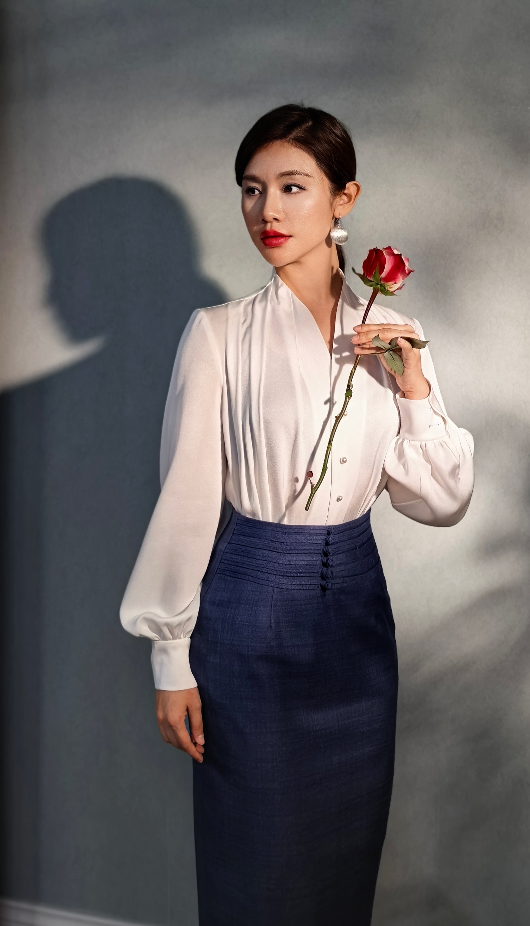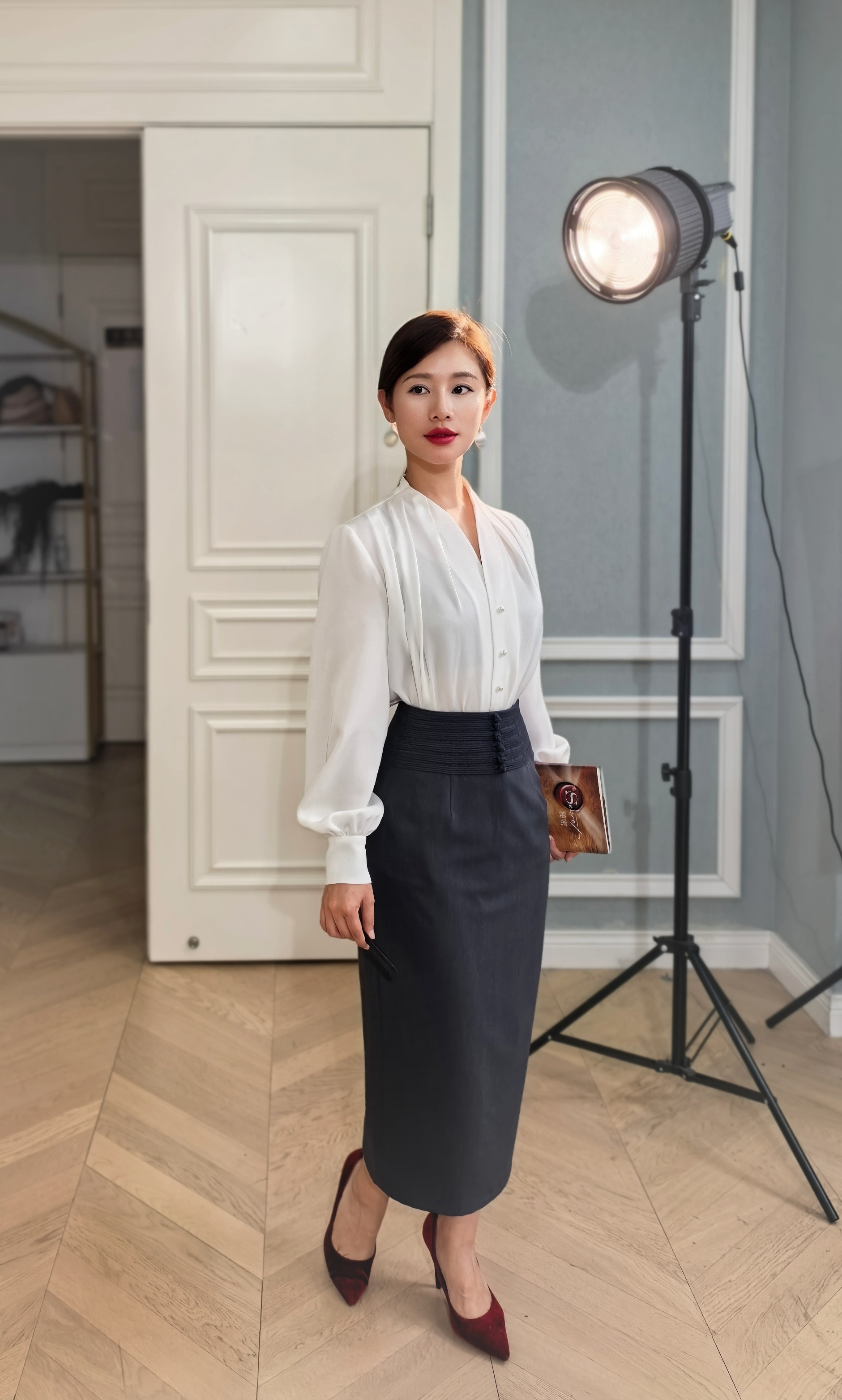 搭配公式:醋酸白衬衫 + 深蓝色手工一字扣包臀裙+皮鞋