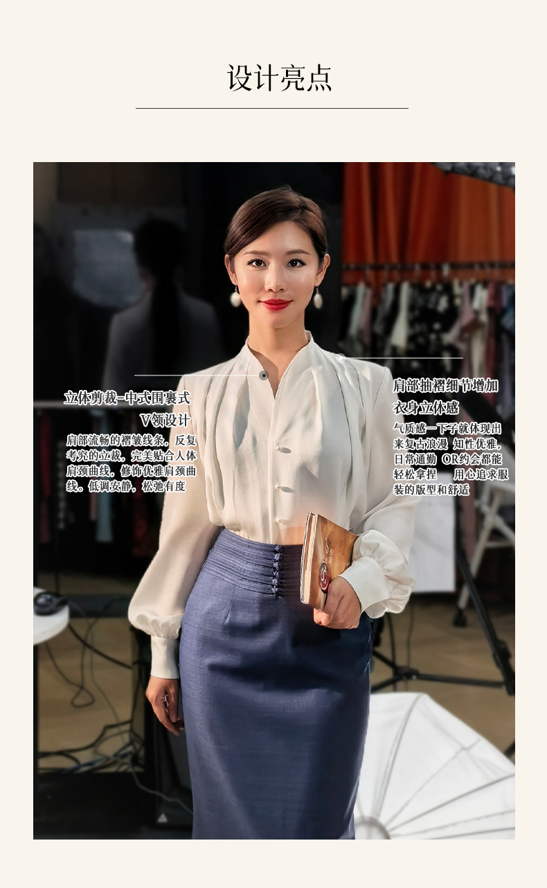 • 肩部褶皱取法秦汉曲裾层叠之美,八道立体剪裁弧线似山岚起伏,既托起当代女性的英气,又留有“美人如花隔云端”的朦胧诗性。