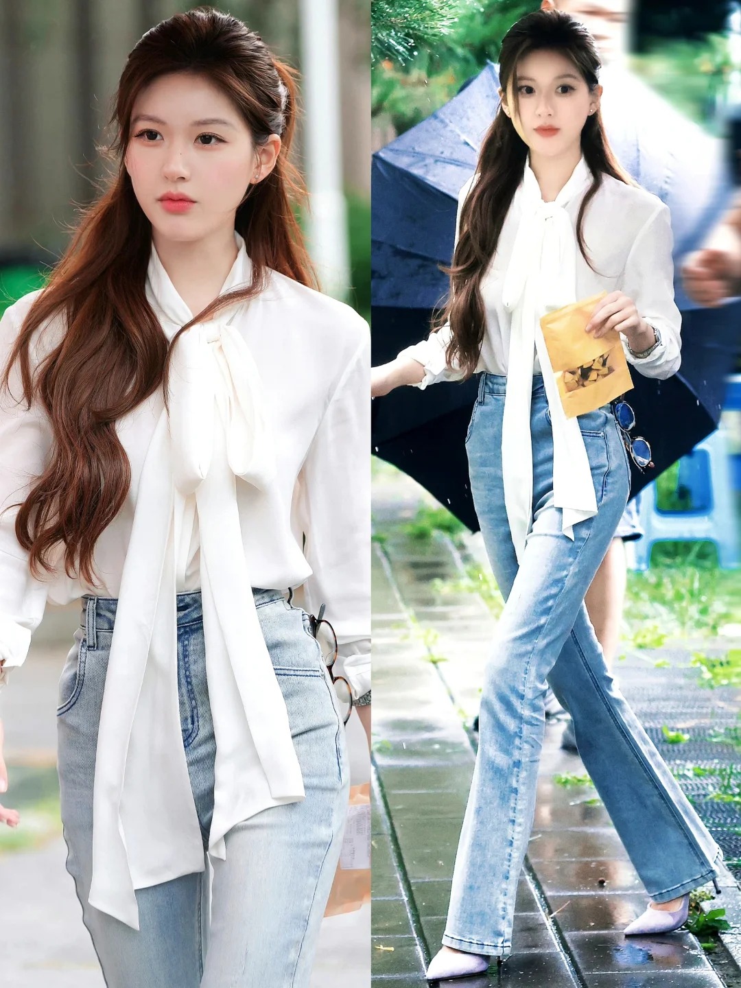 搭配公式:缎面白衬衫 + 深蓝牛仔 + 高跟皮鞋