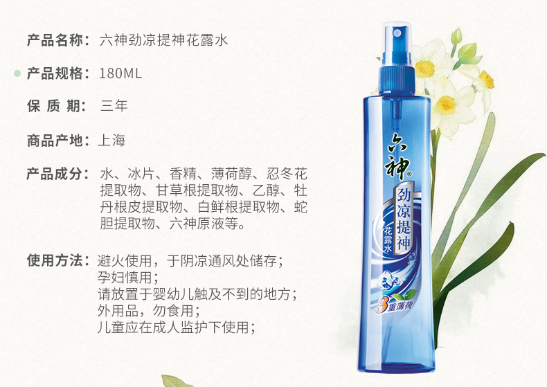 六神劲凉提神花露水3重薄荷180ml夏季清凉滋润花露水