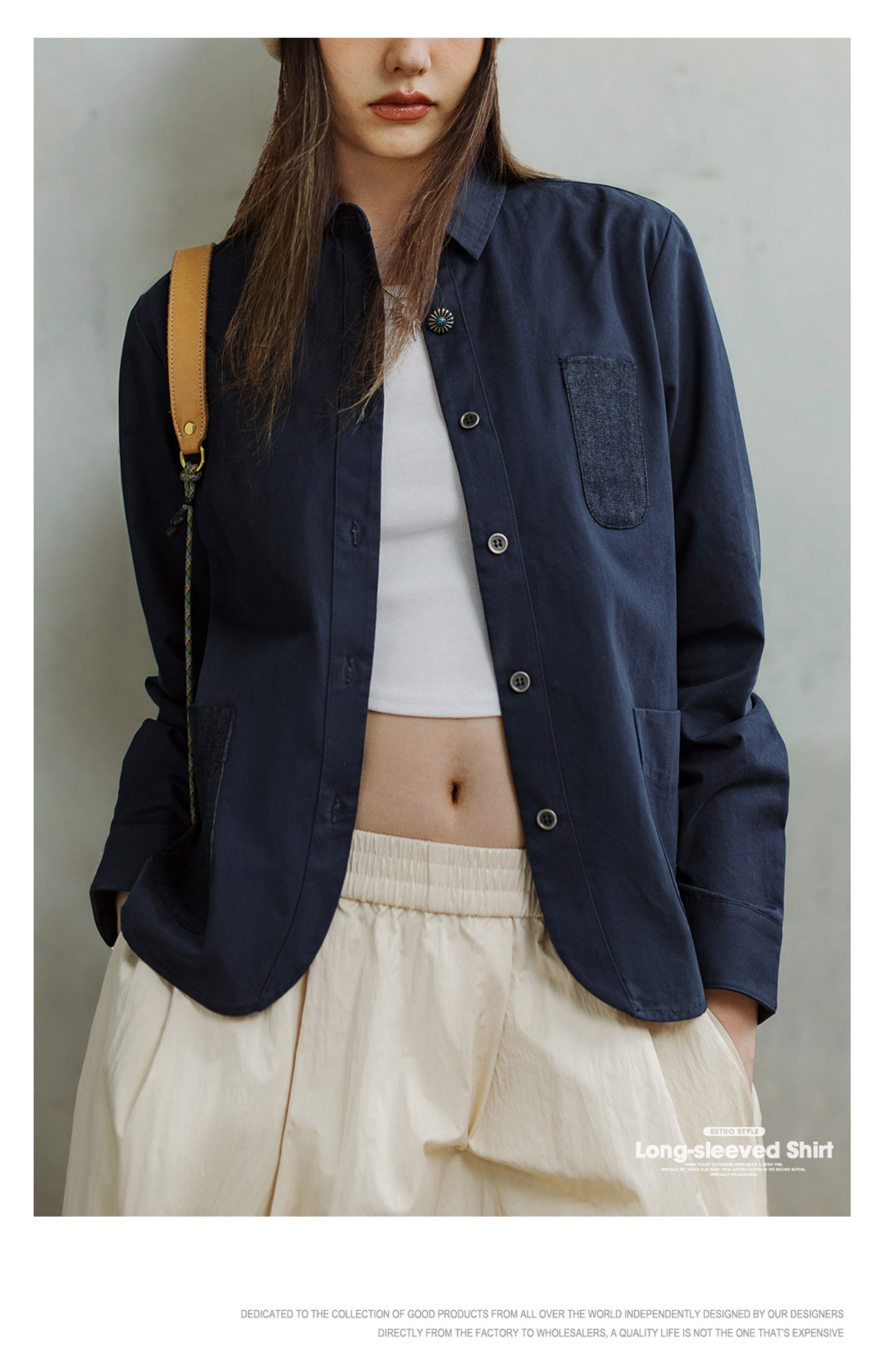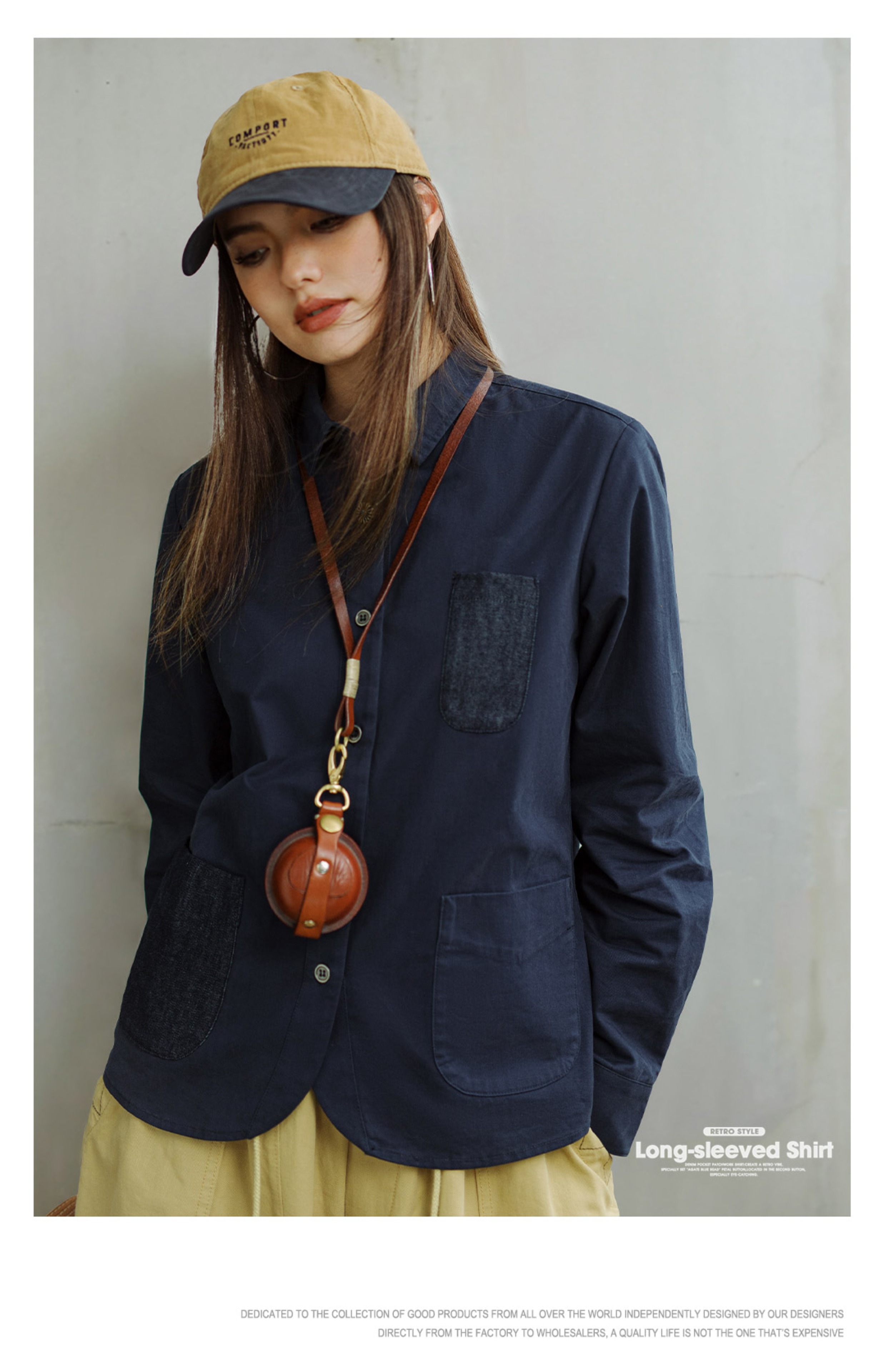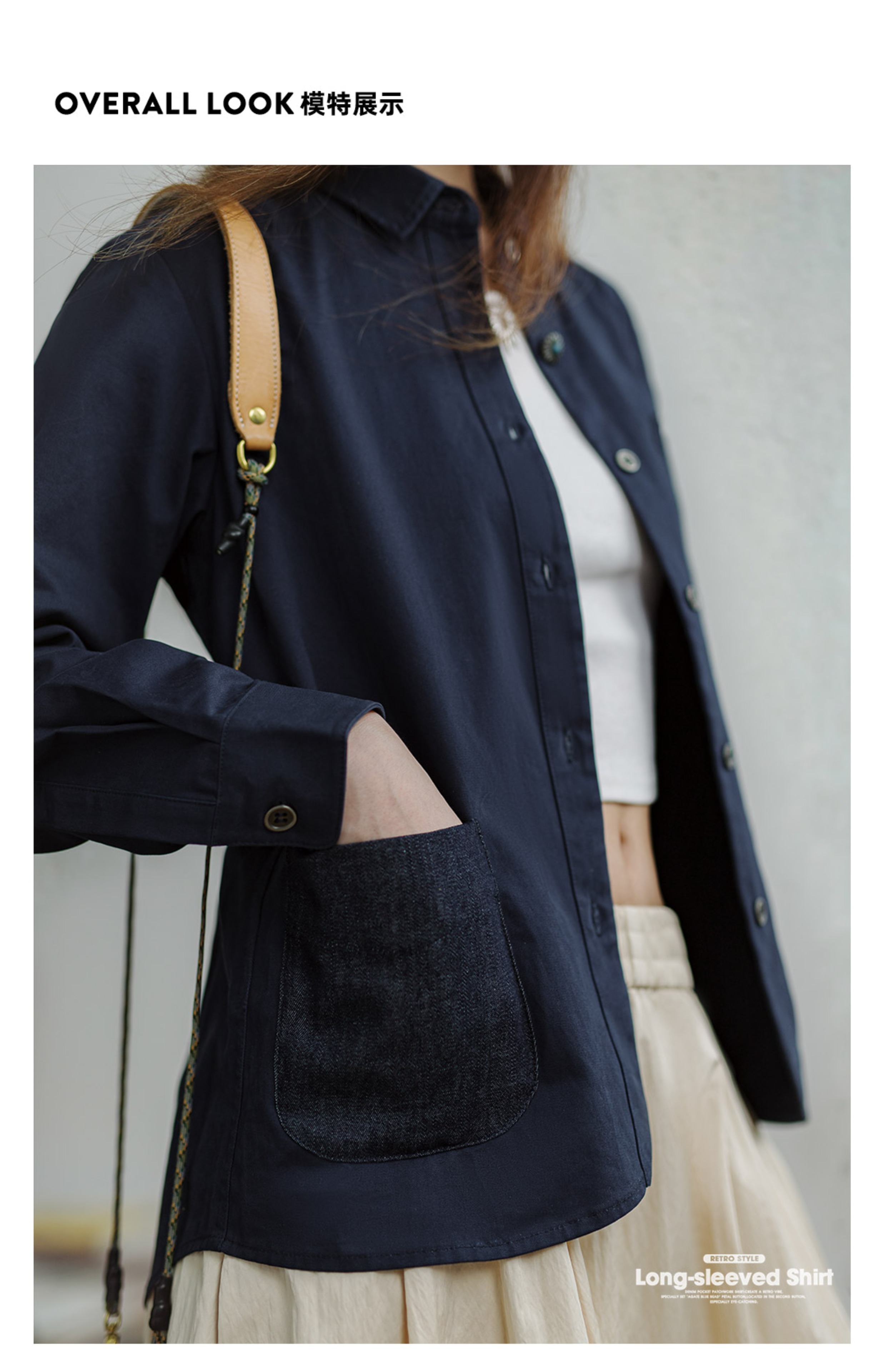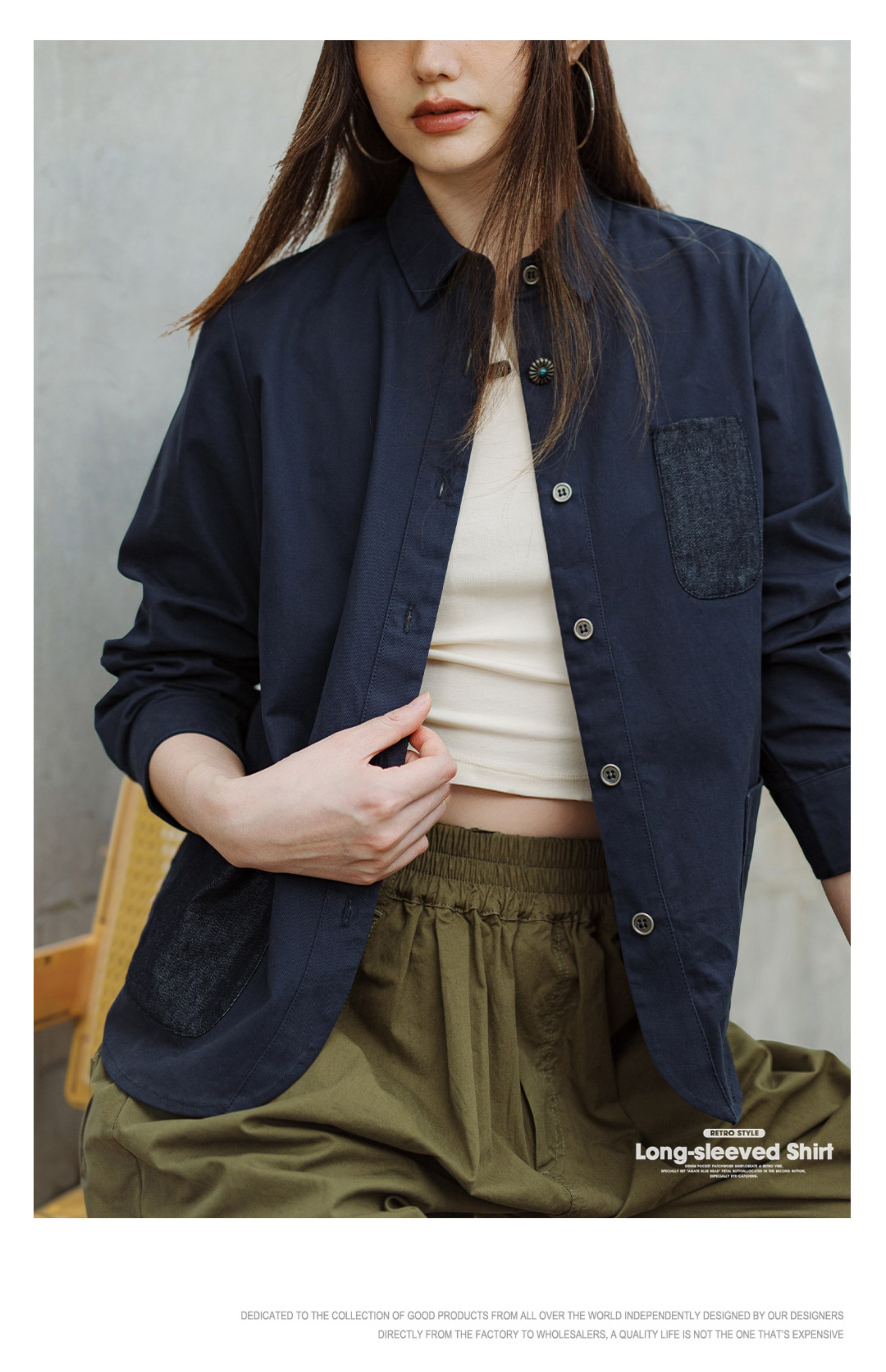 马登复古牛仔口袋拼接衬衫设计感休闲纯棉外套百搭叠穿上衣春秋女