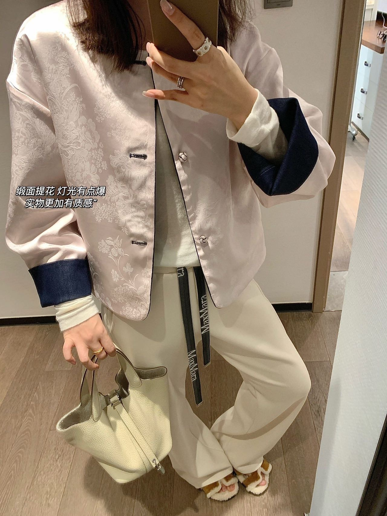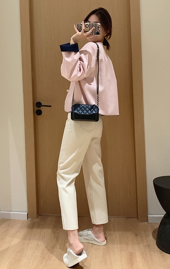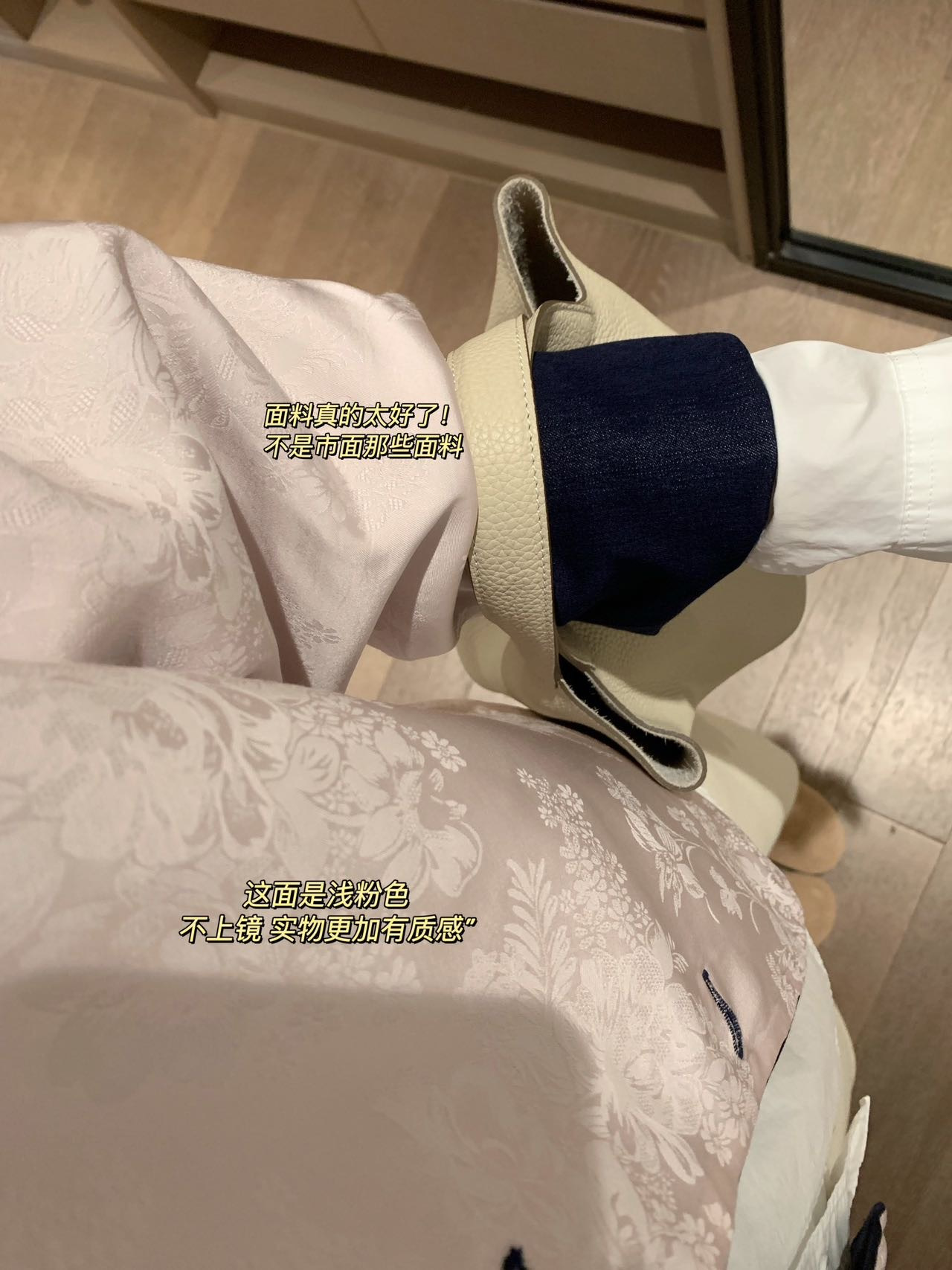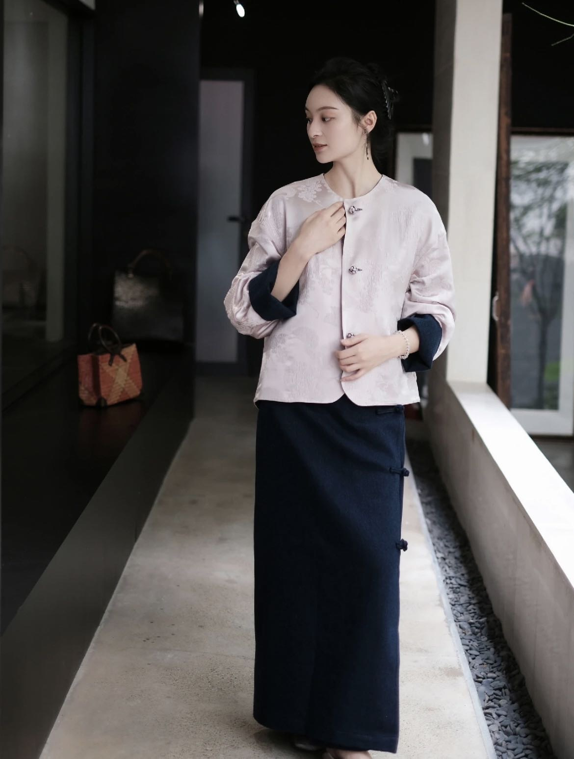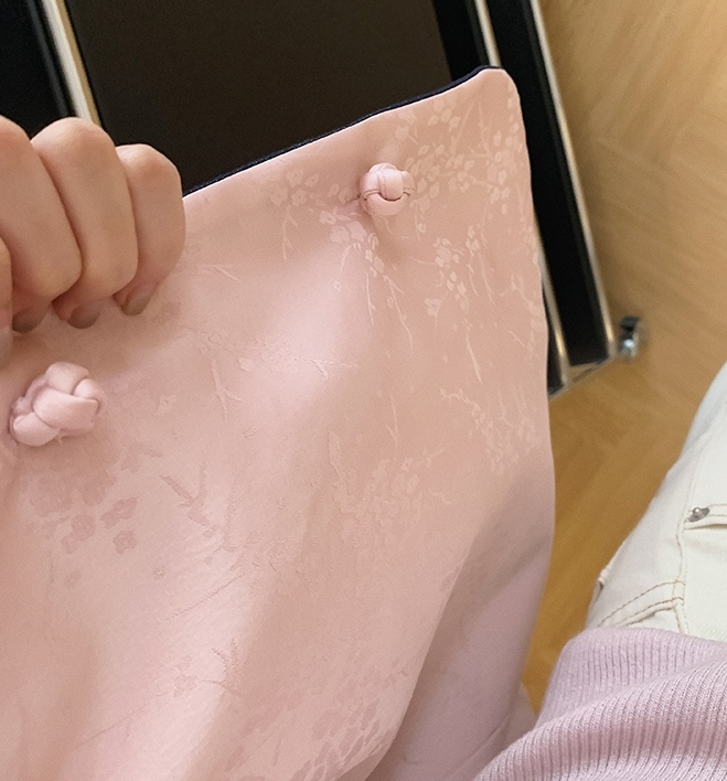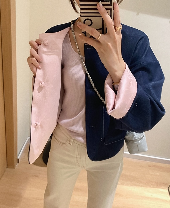 整件主打色为牛仔面,撞搭了粉色的国风缎面提花面料