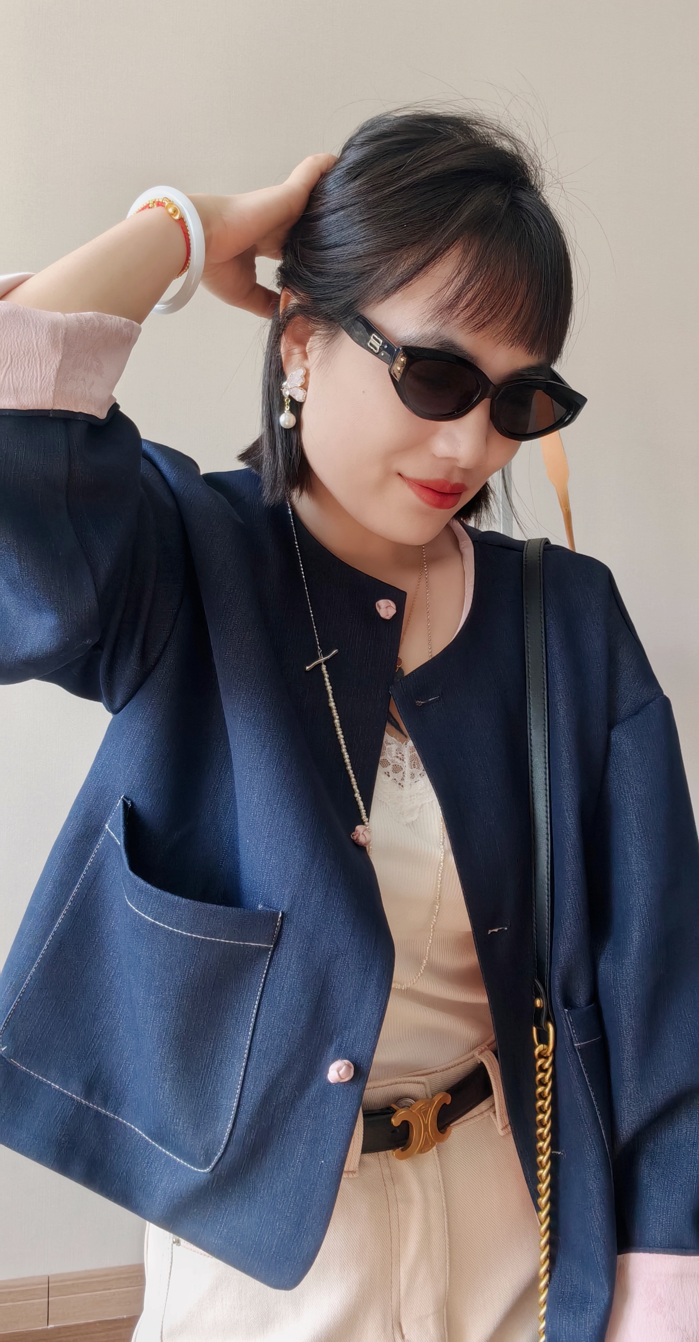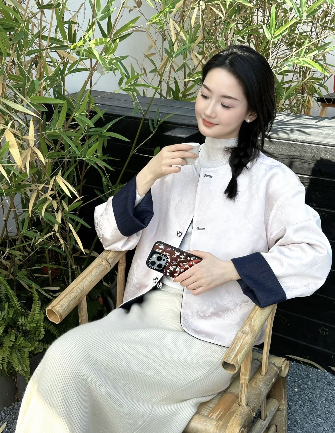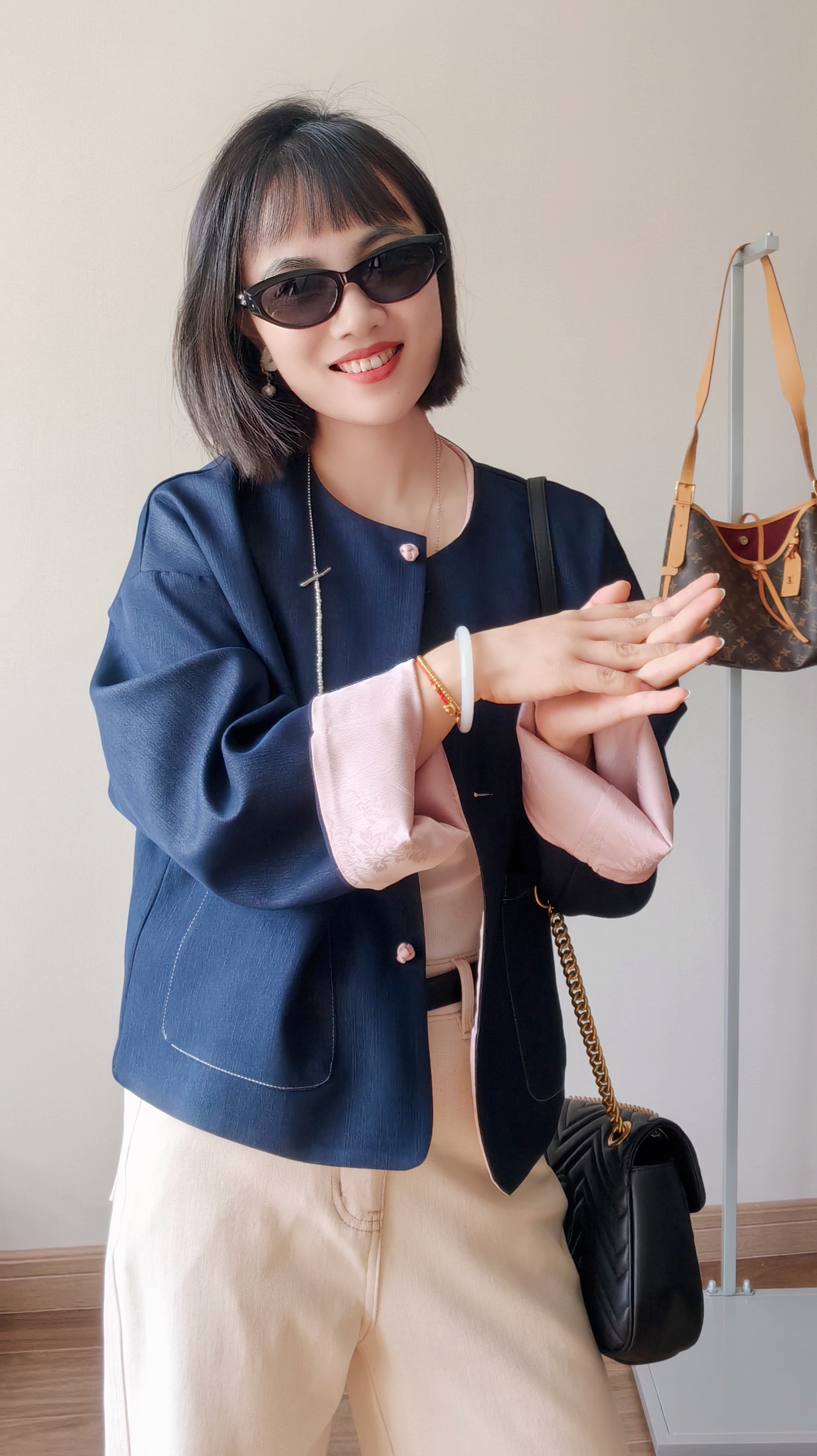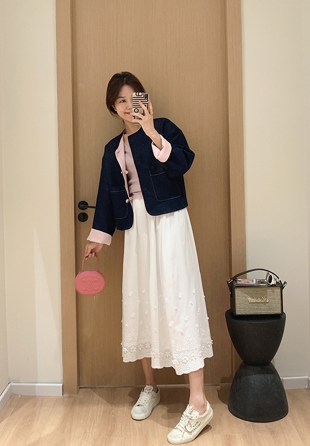 整件主打色为牛仔面,撞搭了粉色的国风缎面提花面料