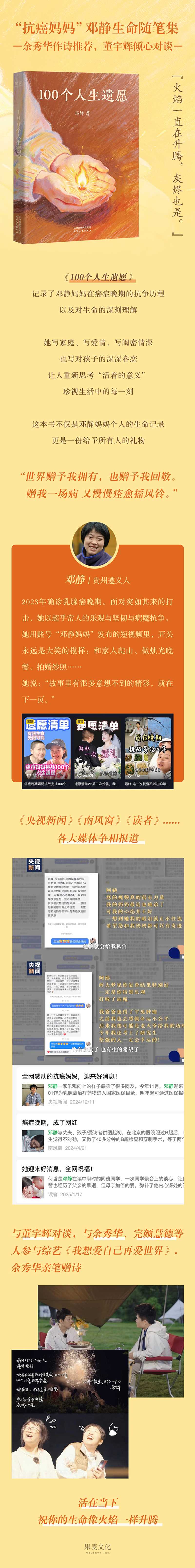 收录了邓静妈妈在癌症晚期的抗争历程、对生命的深刻理解、以及对家庭、对亲情等的深情体悟,包含;人生遗愿、;重生计划、;生命回声三大部分。