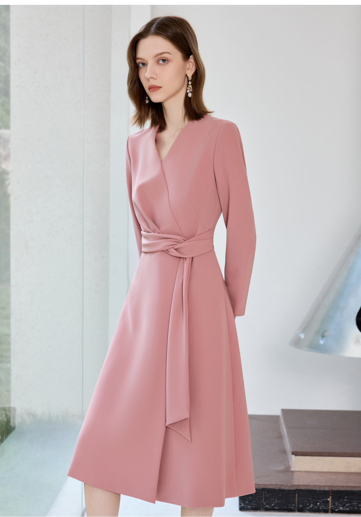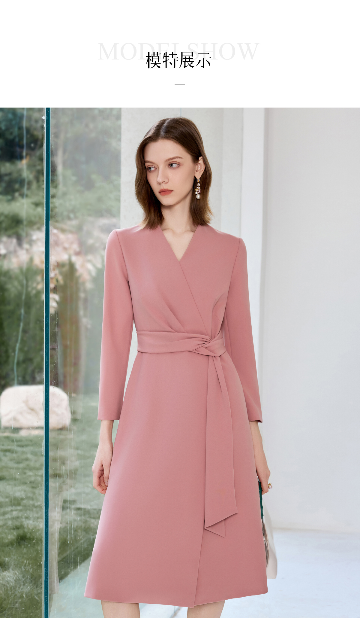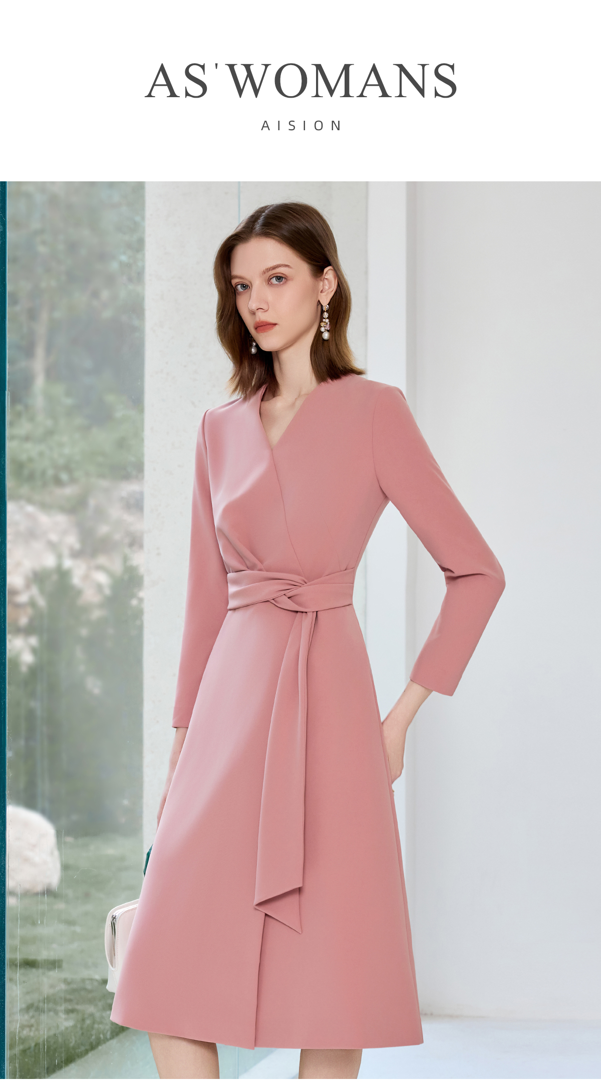 艾尚臣粉色V领收腰连衣裙女秋季新款垂感轻奢女神范通勤系带长裙
