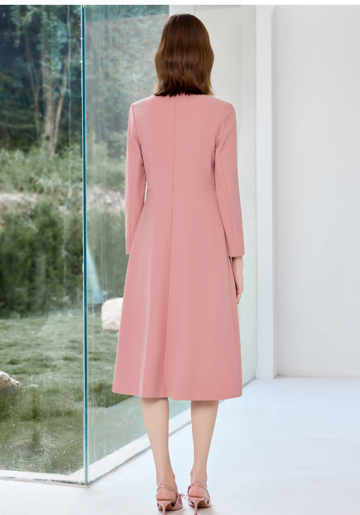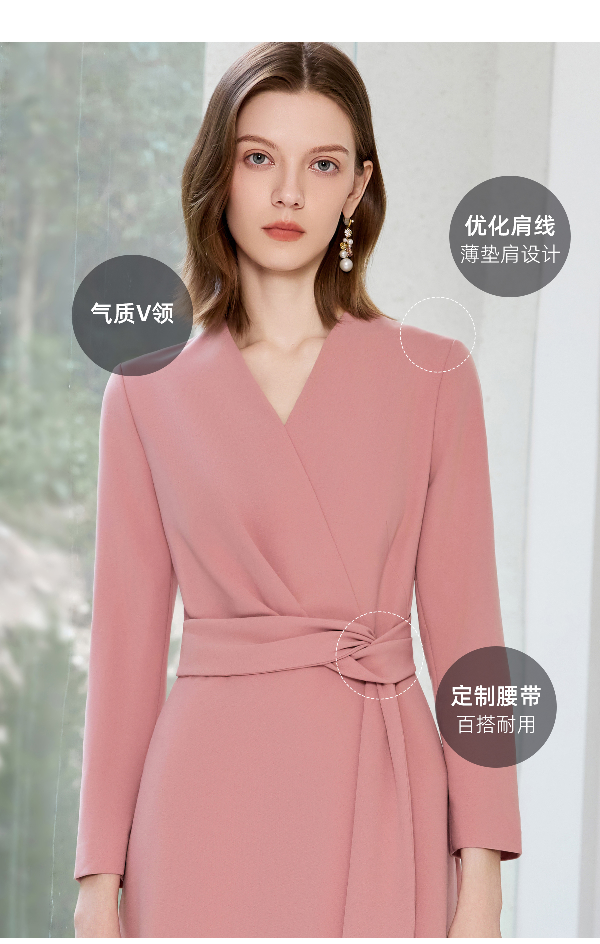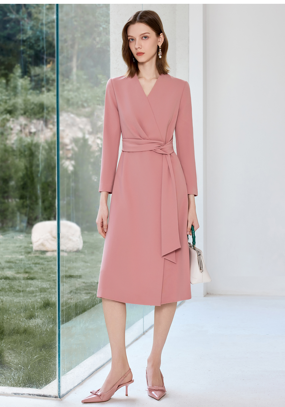 艾尚臣粉色V领收腰连衣裙女秋季新款垂感轻奢女神范通勤系带长裙