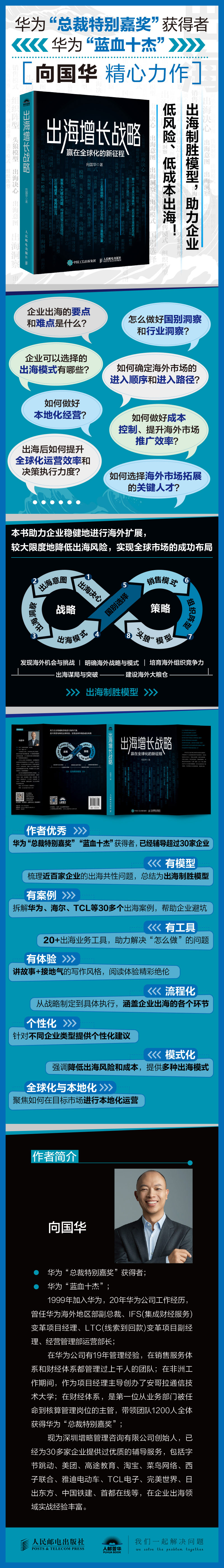 这是一本为企业出海提供实战指导的书。本书以出海制胜模型(OWM)为框架,共分为上下两篇:上篇讲述了出海战略如何制定,具体包括坚定出海决心、明确出海意图、做好出海洞察、选择出海模式四项内容;下篇解释了出海策略如何落地,具体包括做好国别选择、调整销售模式、构建组织阵型和用对“头狼”模型四项内容。这八个核心要素相互联系,构成了企业出海的完整路径,可以帮助企业实现低风险、低成本出海,并顺利完成全球化布局。