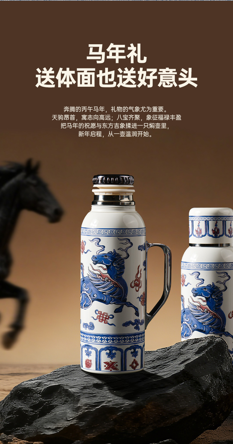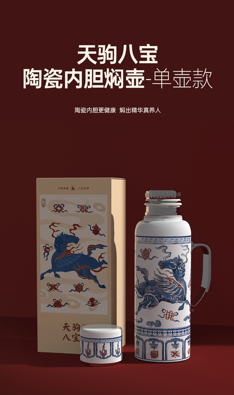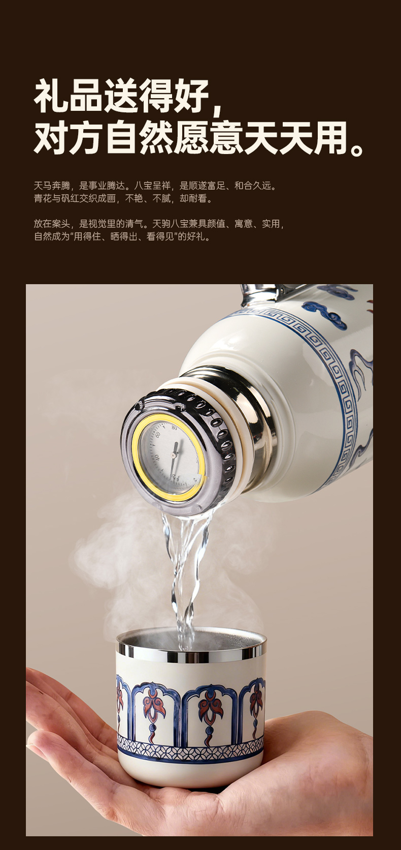 FXQ【天马奔腾保暖壶】天驹八宝陶瓷内胆焖壶 机械测温塞 陶瓷内胆 独立茶仓过滤网 360°倒水不挑角度 大容量保温杯中式礼盒装