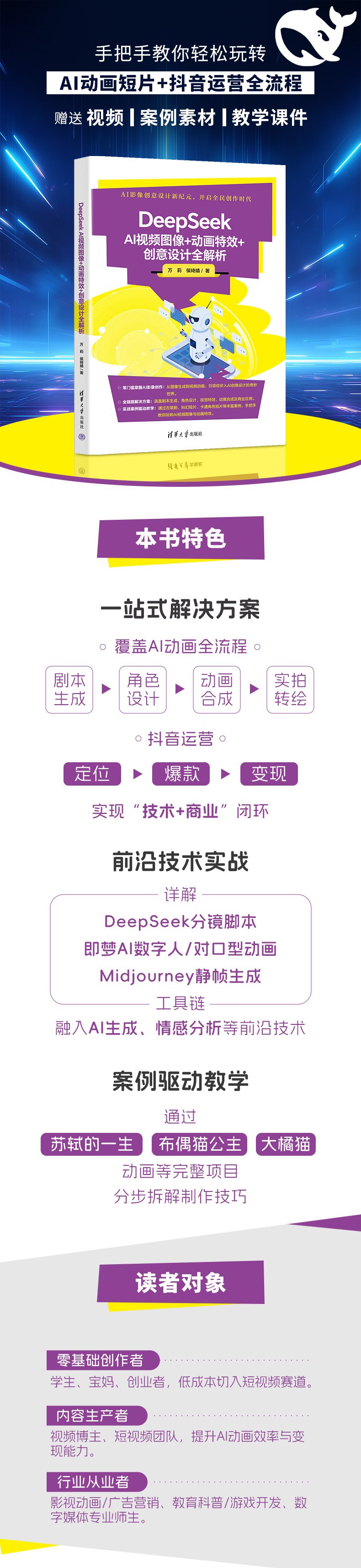 本书特色?一站式解决方案:覆盖AI动画全流程(剧本生成→角色设计→动画合成→实拍转绘)与抖音运营(定位→爆款→变现),实现“技术十商业”闭环。?前沿技术实战:详解DeepSeek分镜脚本、即梦AI数字人/对口型动画、Midjourney静帧生成等工具链,融入AI生成、情感分析等前沿技术。?案例驱动教学:通过“苏轼的一生”“布偶猫公主”“大橘猫”动画等完整项目,分步拆解制作技巧。读者对象?零基础创作者:学生、宝妈、创业者,低成本切入短视频赛道。?内容生产者:视频博主、短视频团队,提升AI动画效率与变现能力。?行业从业者:影视动画/广告营销、教育科普/游戏开发、数字媒体专业师生。