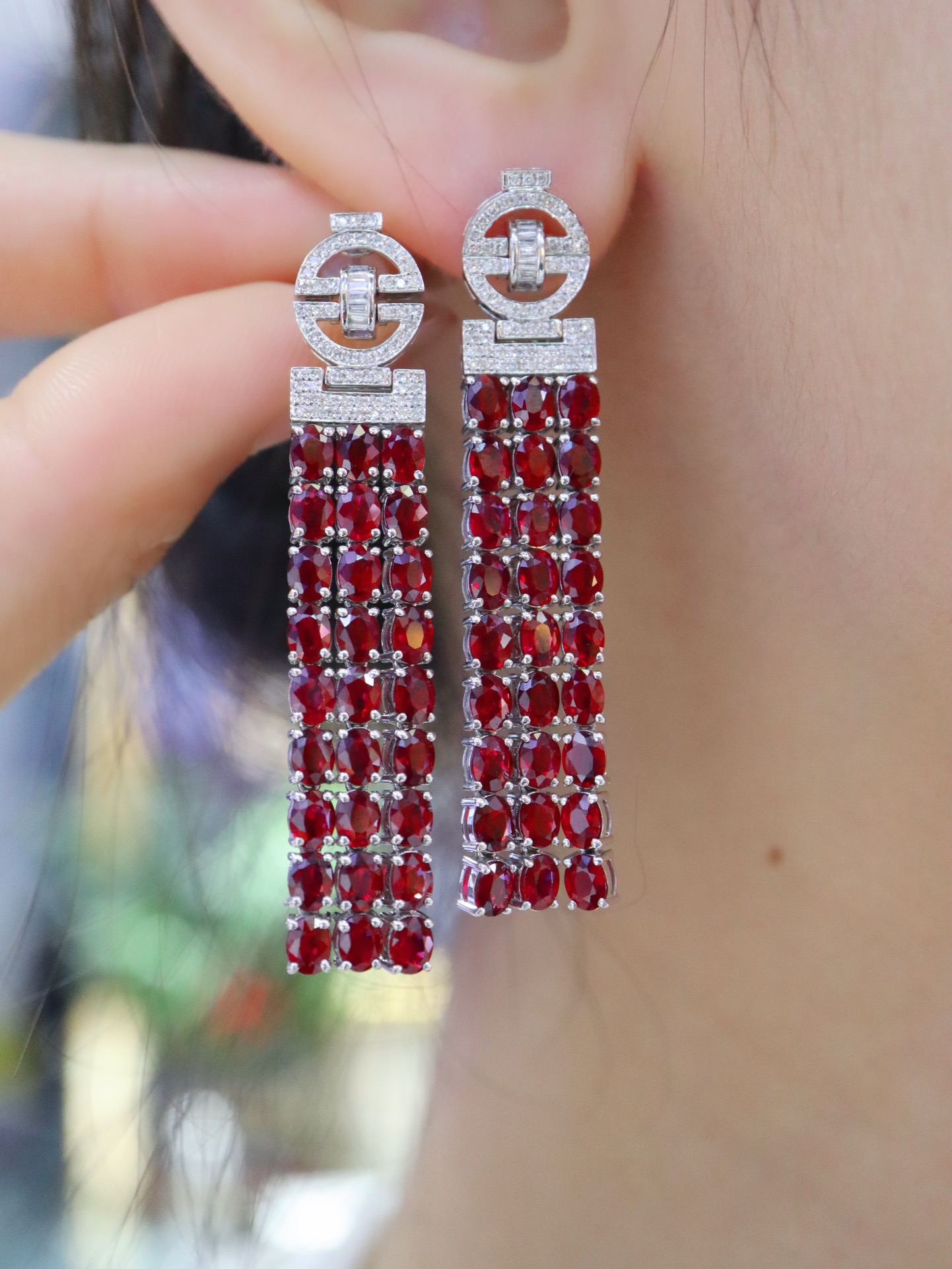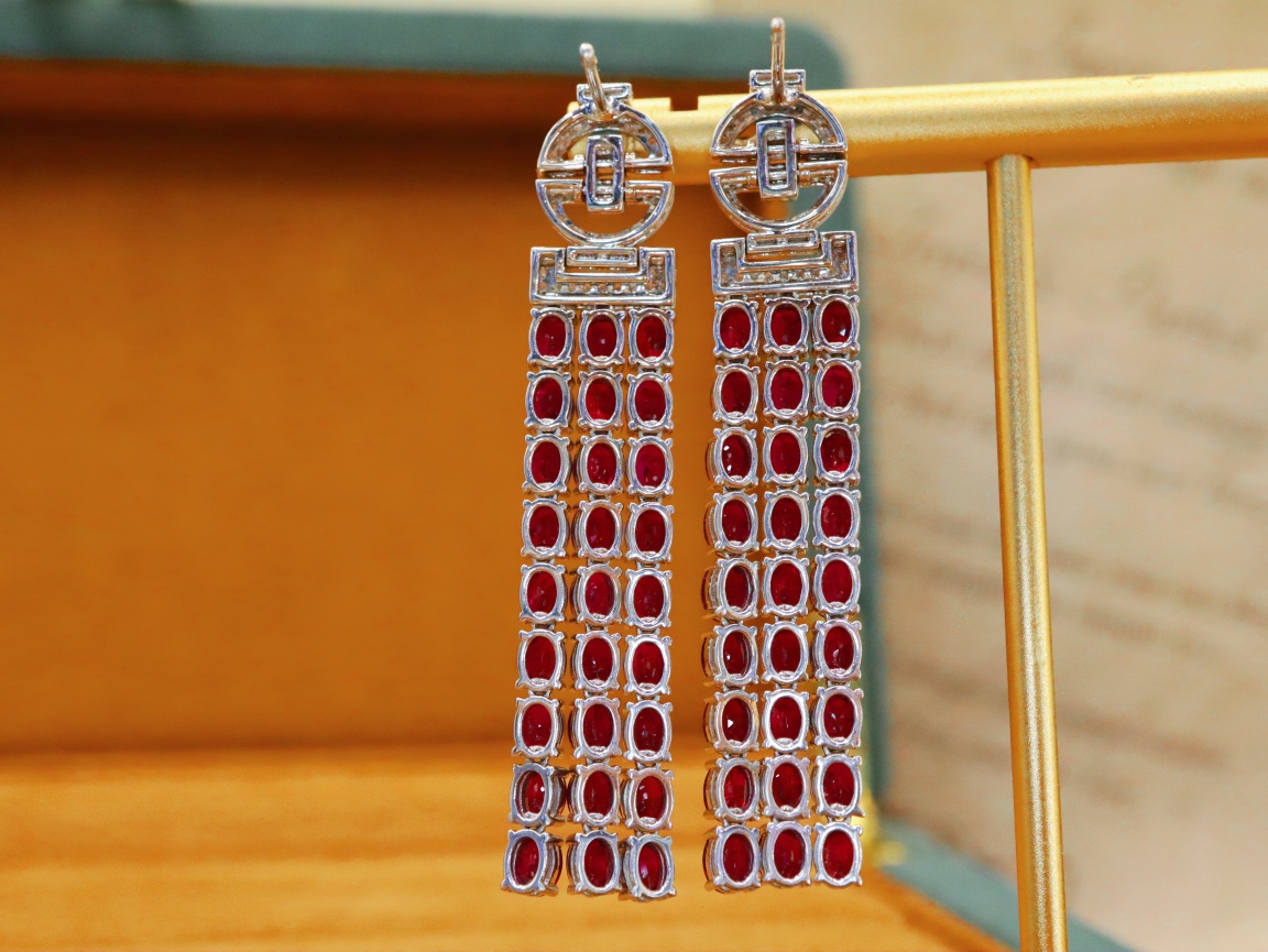 523004 鸽血红红宝石耳钉 石重:11.27ct;总重:14.57g;钻石:0.474ct/144颗 18K白金 真金真钻石💎 超值价:24580