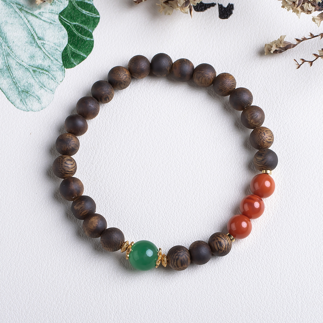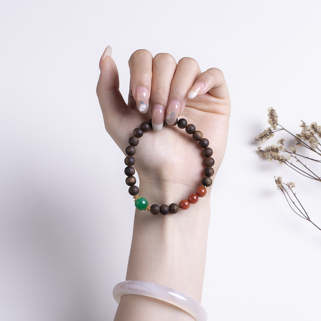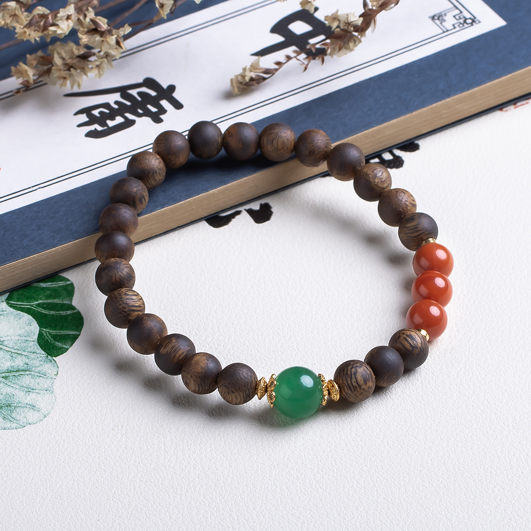 xy0504沉香+碧玉南红好运三连手串,天然沉香约7.5mm,原色原味,香味自然清甜,一颗满色碧玉+三颗满色肉南红,红红火火,好运三连,吉祥纳福。
