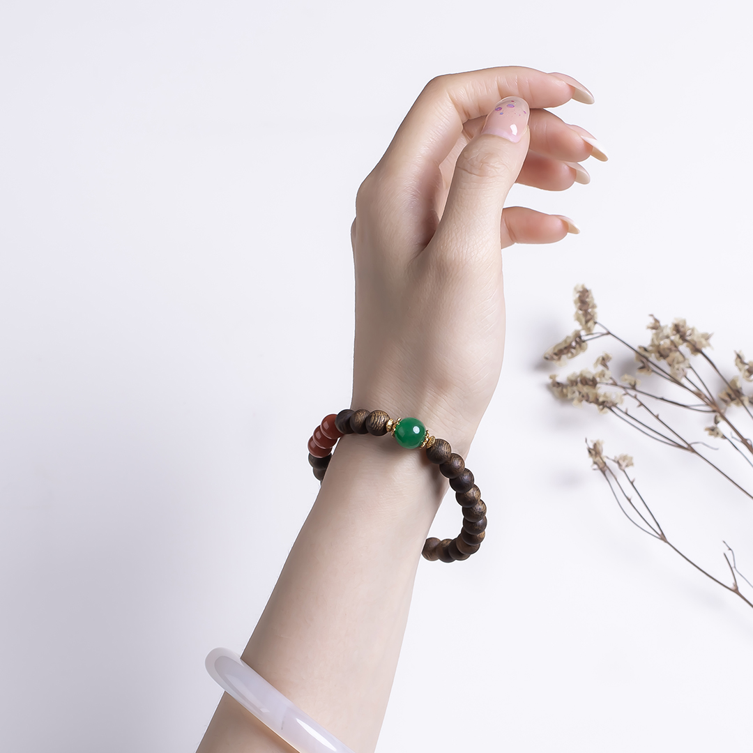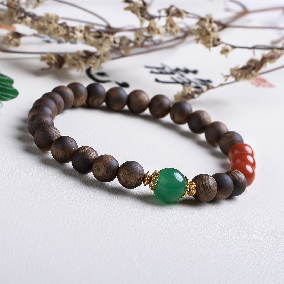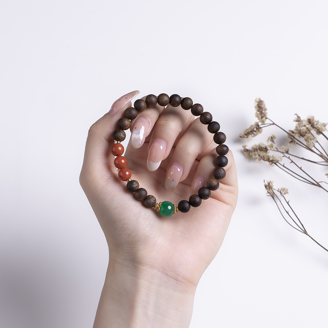xy0504沉香+碧玉南红好运三连手串,天然沉香约7.5mm,原色原味,香味自然清甜,一颗满色碧玉+三颗满色肉南红,红红火火,好运三连,吉祥纳福。