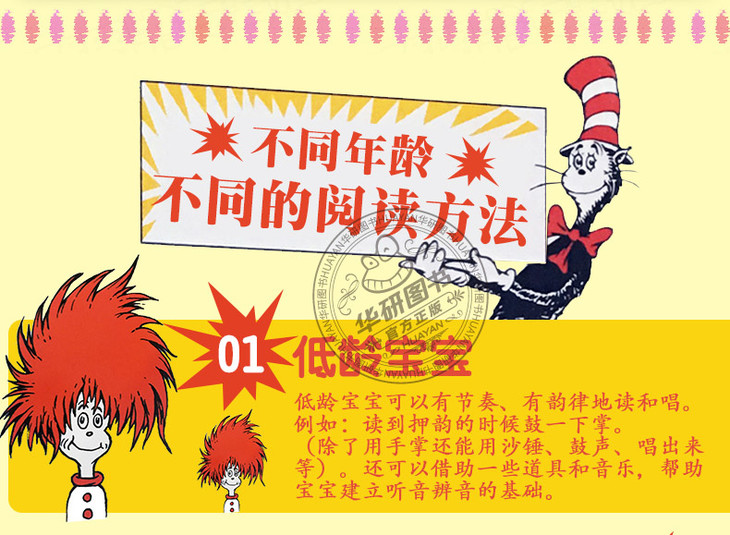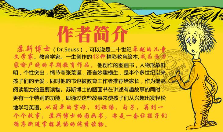 苏斯博士,二十世纪非常受欢迎的儿童作家,教育学家,其创作的绘本故事在英语世界家喻户晓。Dr. Seuss作品的风格常利用一些无意义或荒唐的事做为重要的出发点来从事创作,身边看来不起眼的事,经过他的丰富的想象力,就会创作出一本与众不同的童书。其笔下的人物看起来有点怪怪的,但每个人物都有鲜明独特又可爱的个性。看了Dr. Seuss的书会不知不觉地大声朗读起来,因为他的书充满了节奏和韵律,念起来非常顺口,可加深印象。