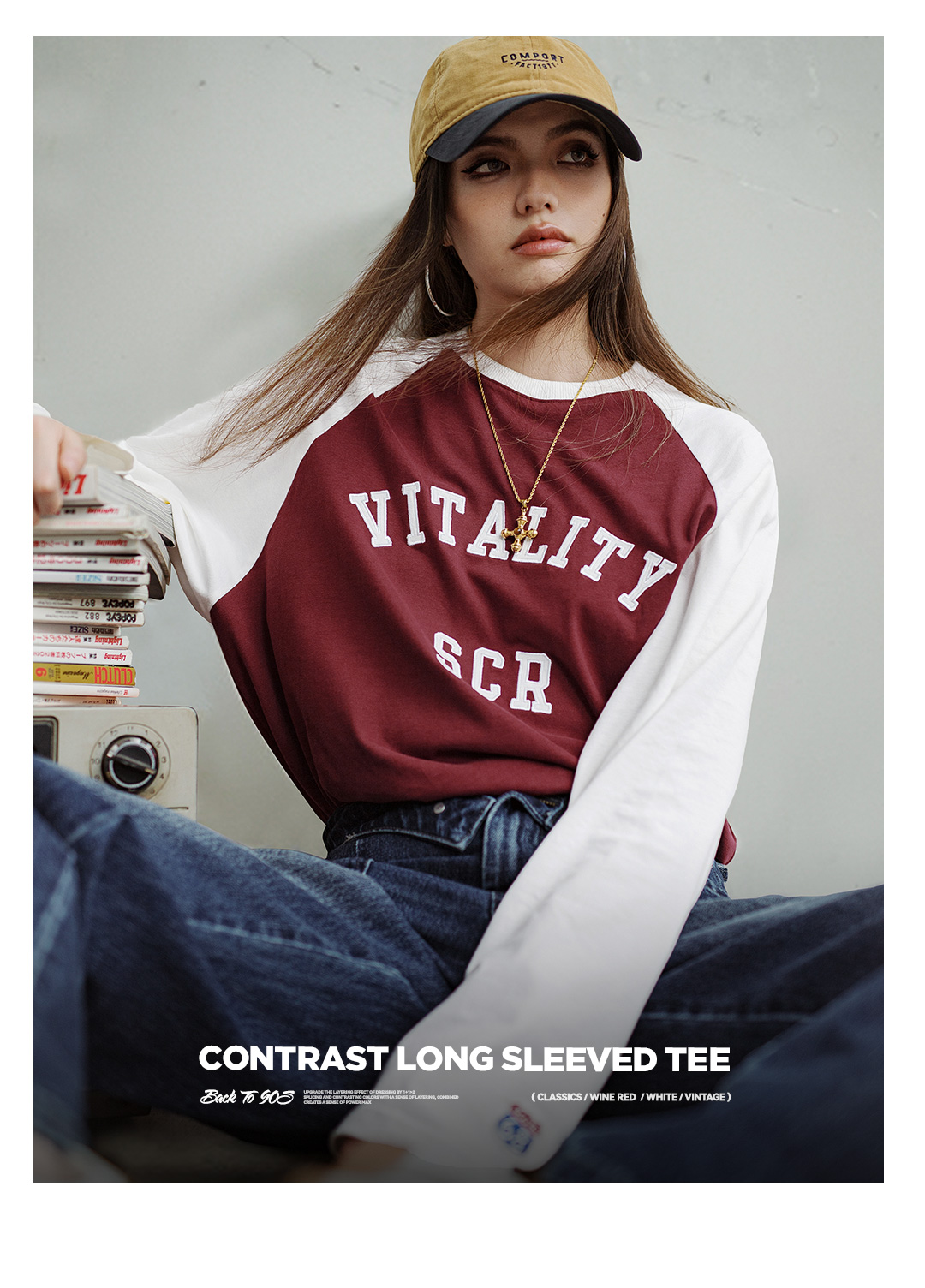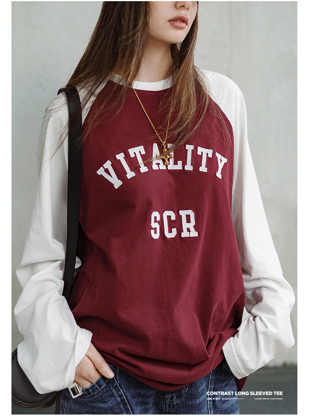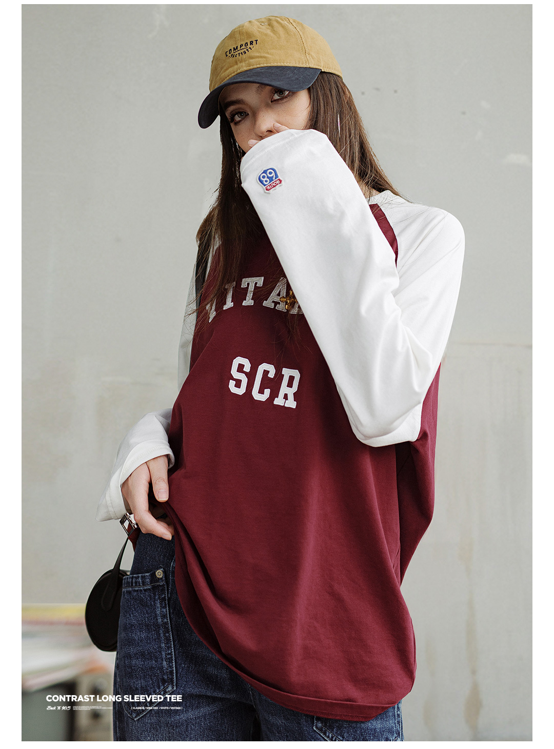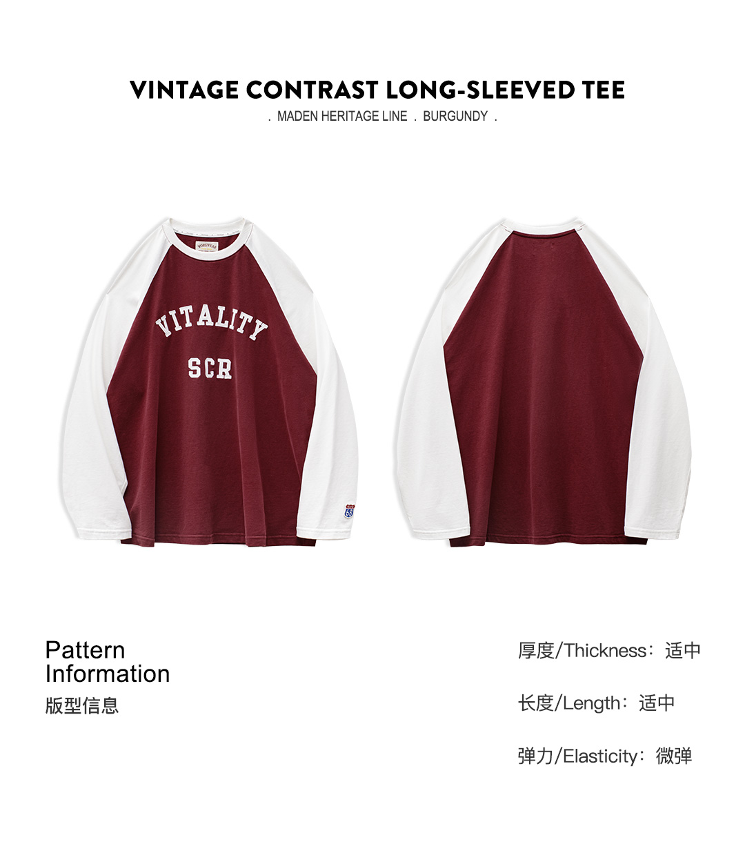 马登美式酒红色插肩长袖T恤撞色纯棉宽松圆领上衣内搭打底春秋女