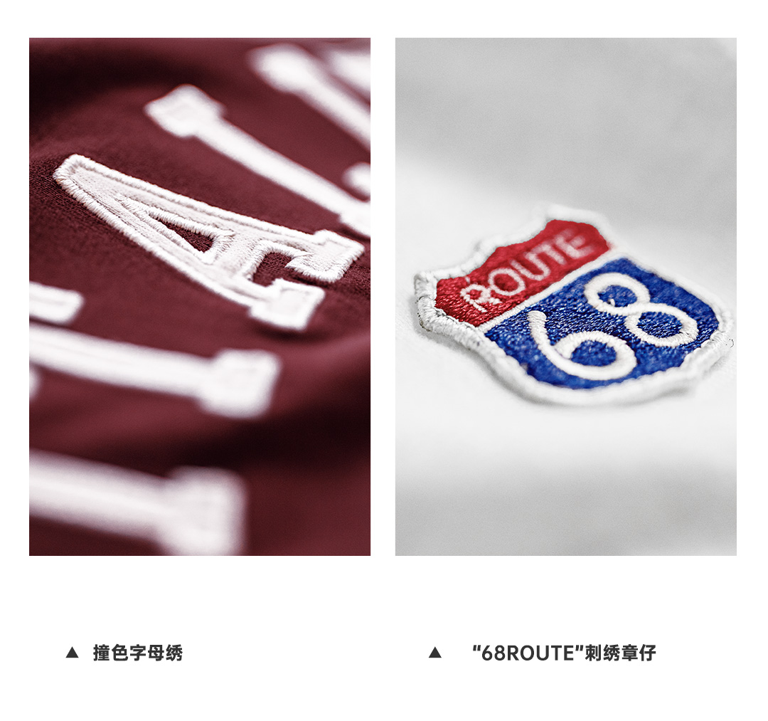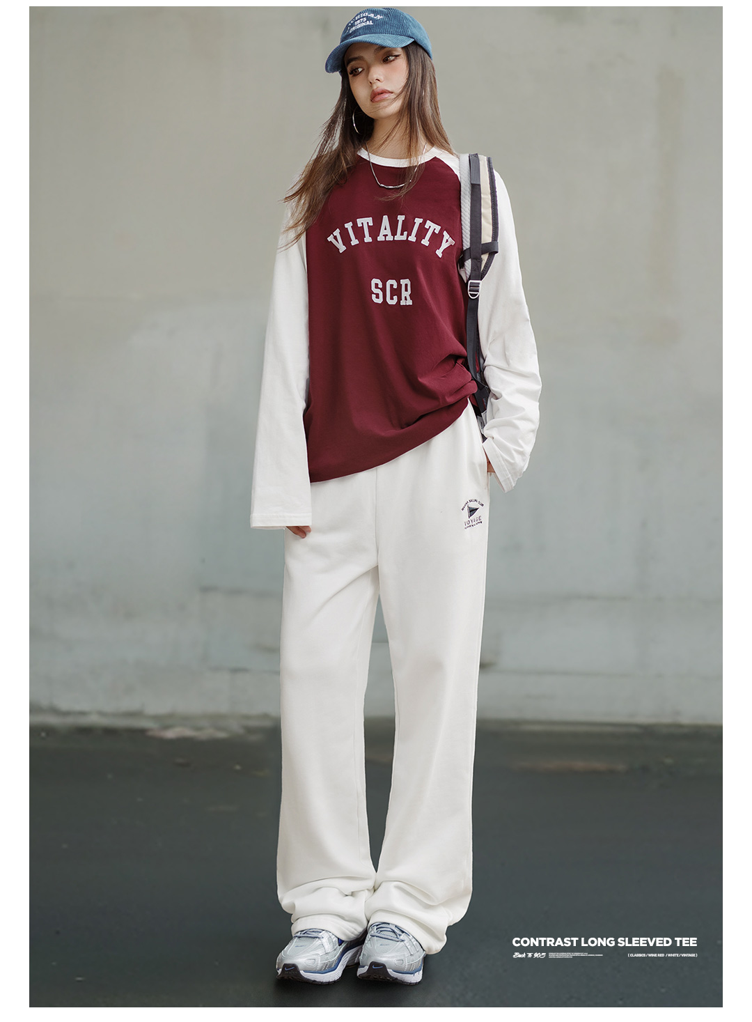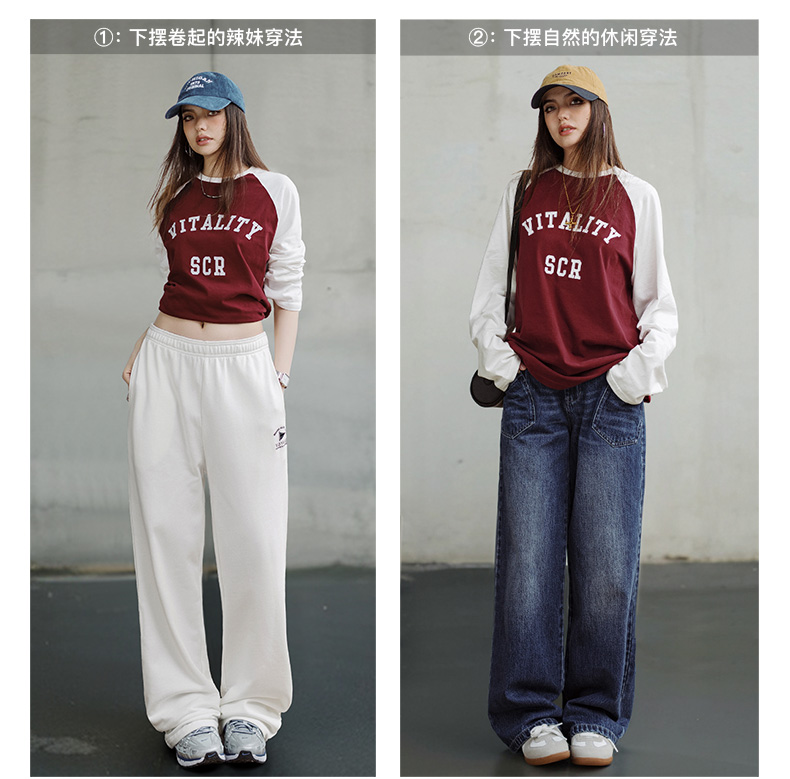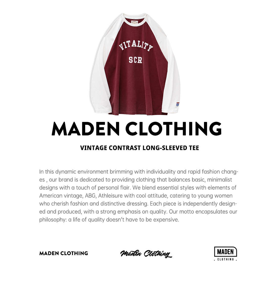 马登美式酒红色插肩长袖T恤撞色纯棉宽松圆领上衣内搭打底春秋女