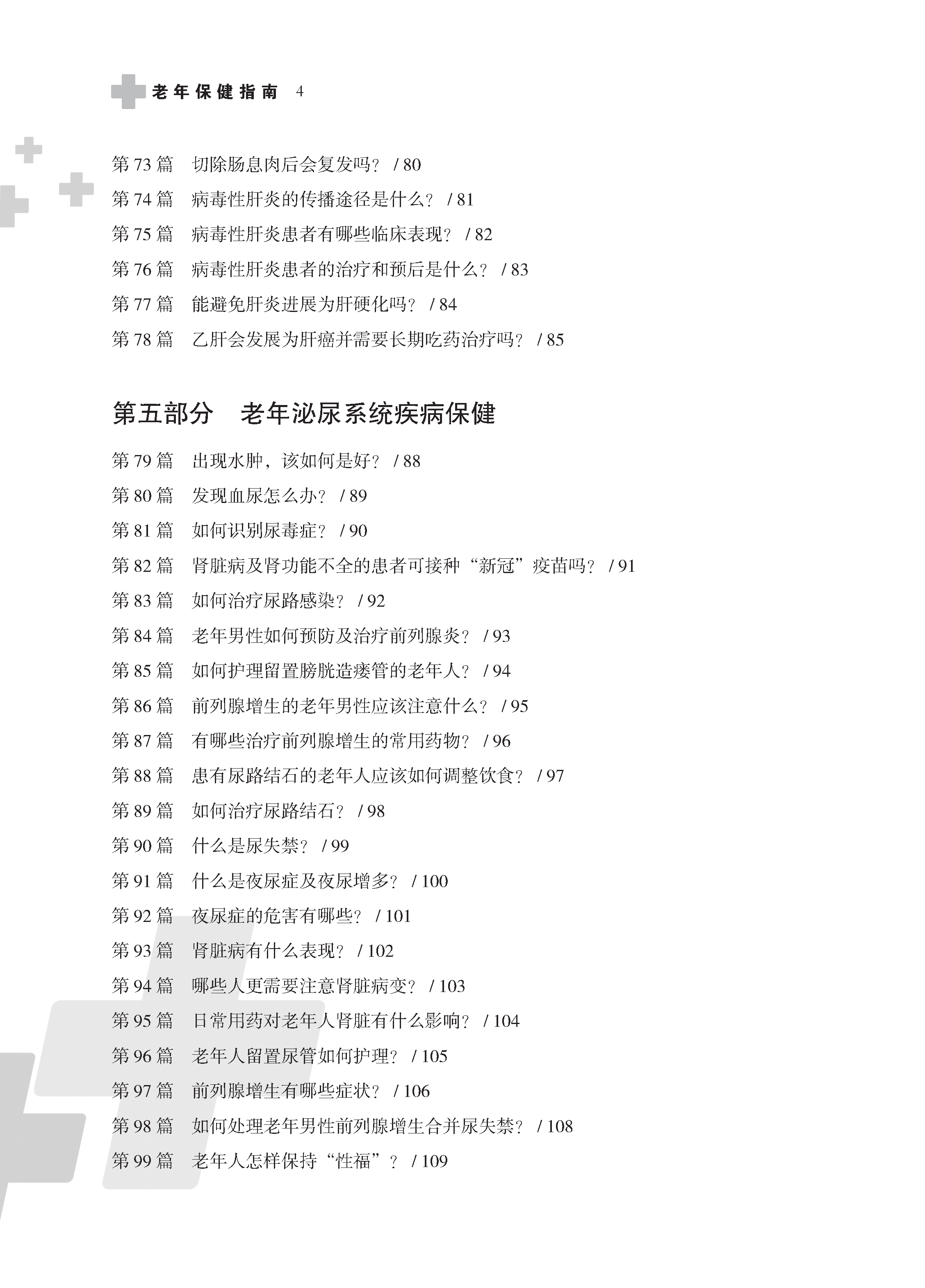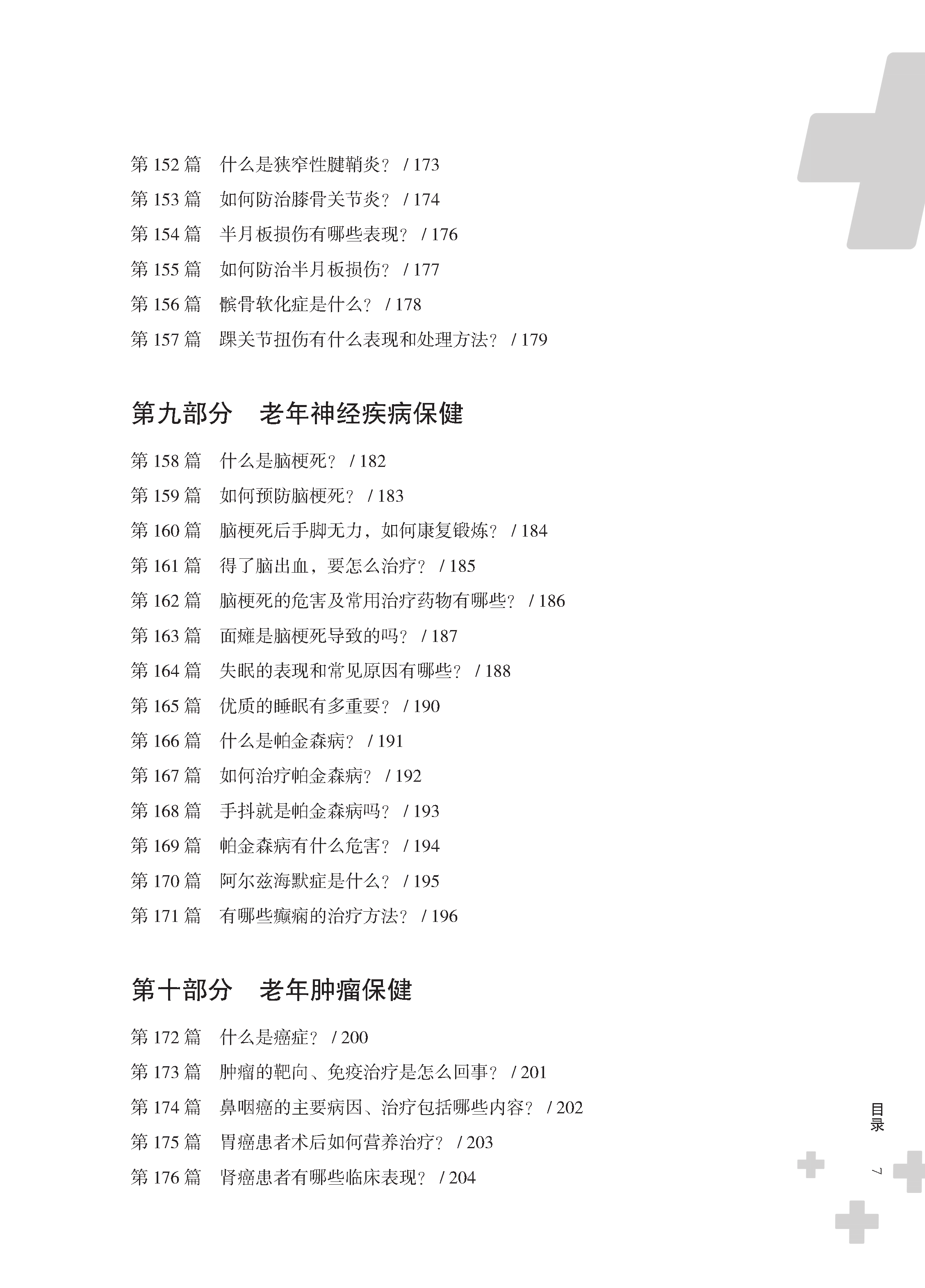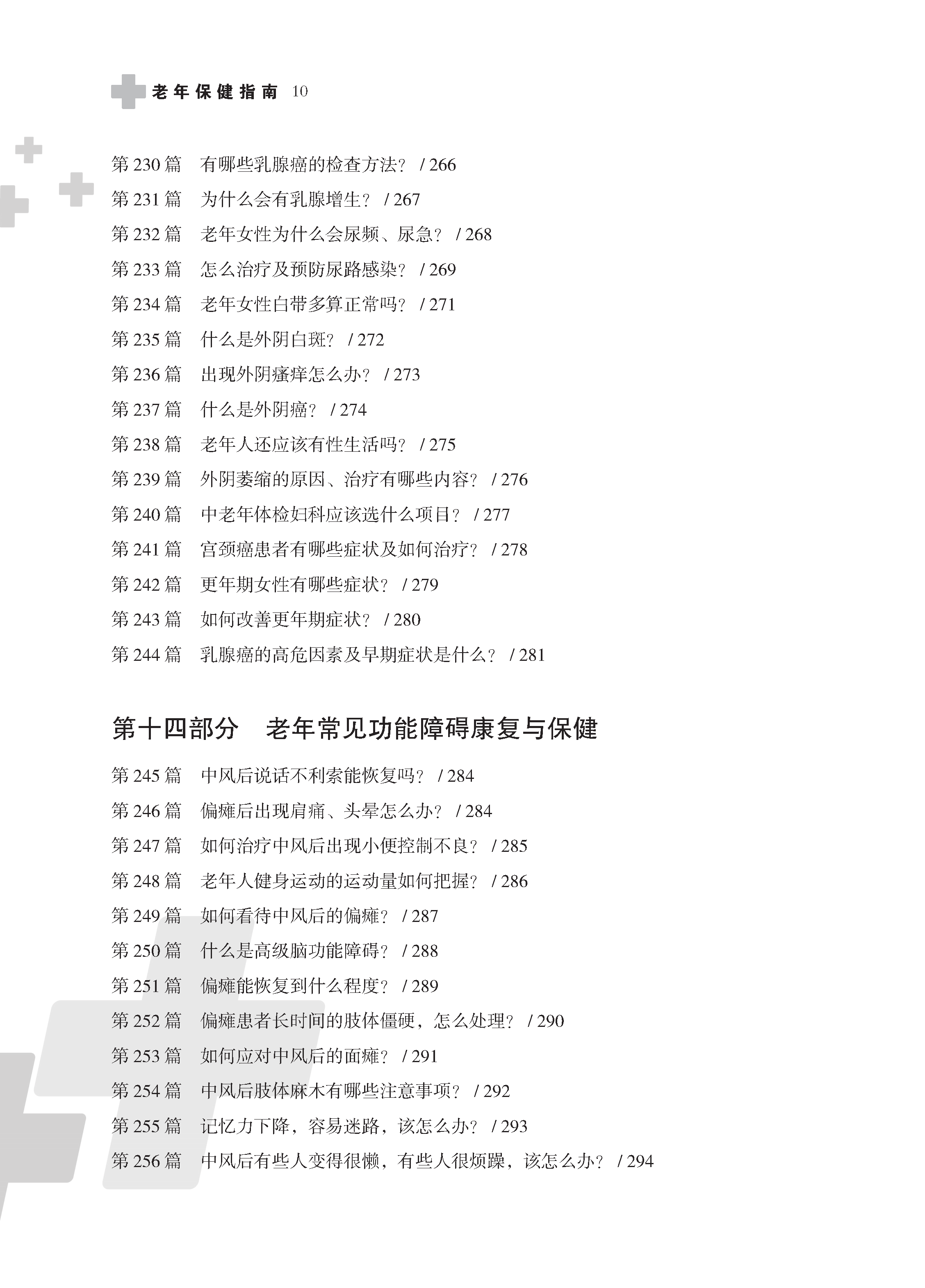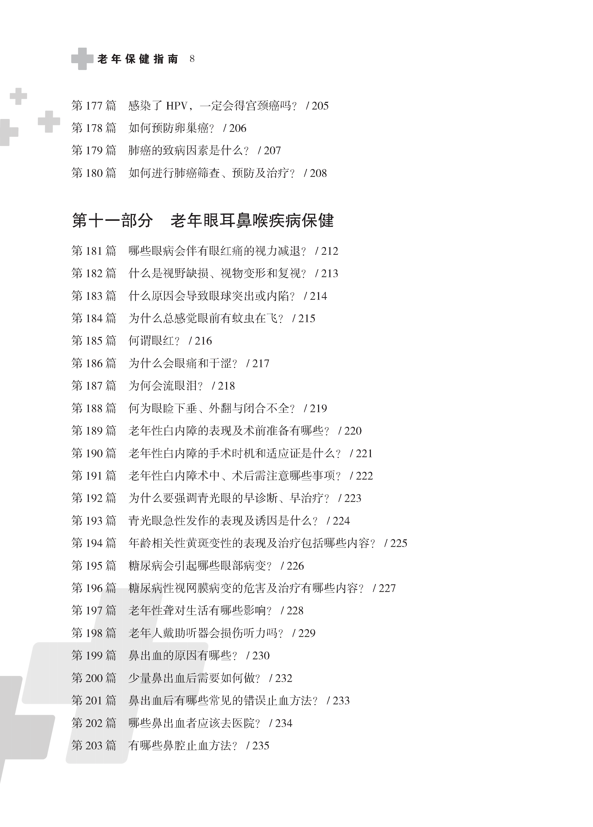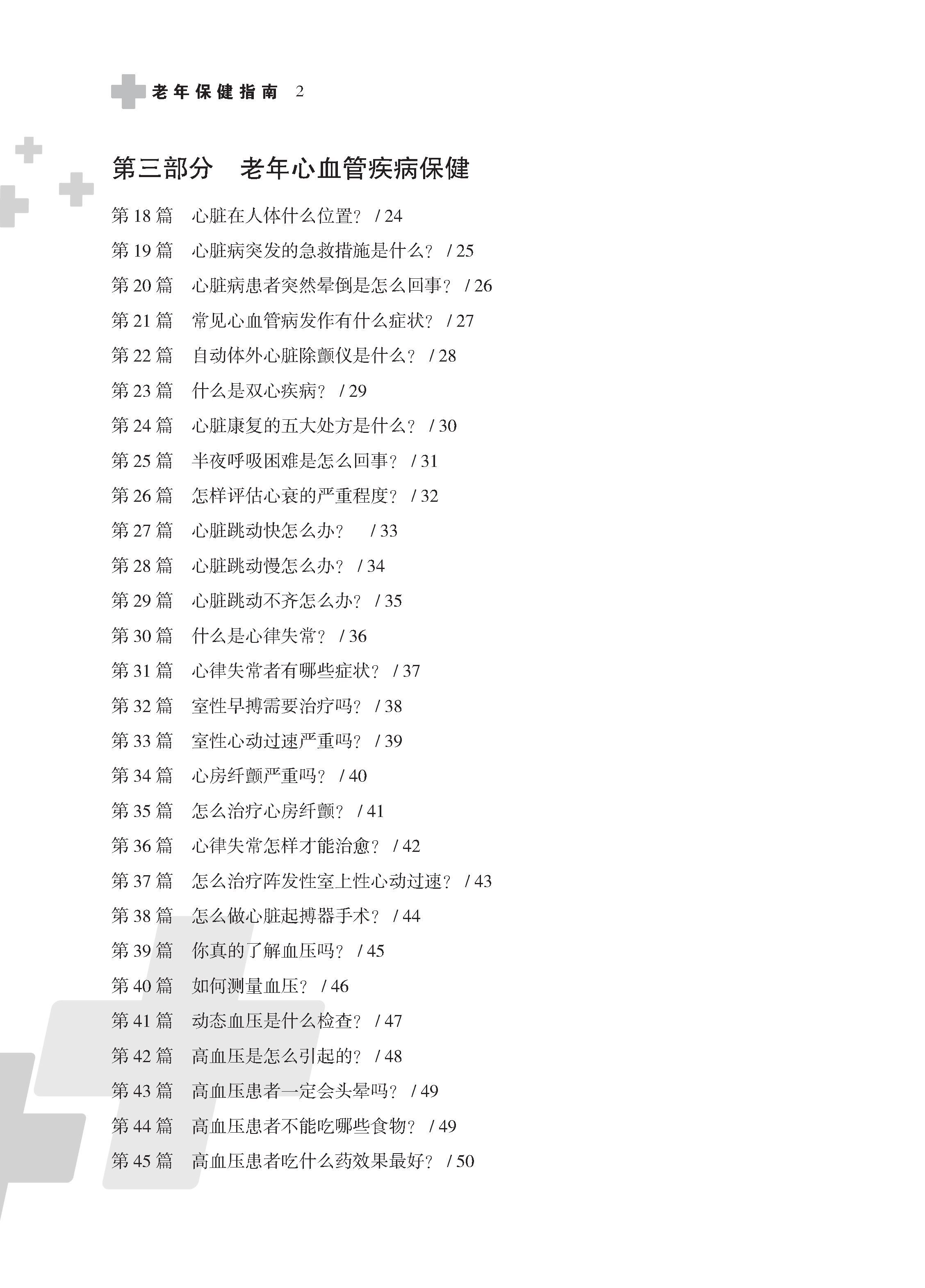 本书针对老年人的心理和生理特点,涵盖老年呼吸疾病保健、老年心血管疾病保健、老年消化系统疾病保健、老年泌尿系统疾病保健、老年血液疾病保健、老年内分泌和代谢性疾病保健、老年骨关节系统疾病保健、老年神经疾病保健、老年肿瘤保健、老年眼耳鼻喉疾病保健、老年皮肤疾病保健、老年妇科疾病保健、老年常见功能障碍康复与保健、老年饮食营养保健、老年药物保健、老年护理保健、老年中医保健17个部分内容,既帮助读者了解和认识老年疾病,又指导大家如何预防和保健老年疾病。
