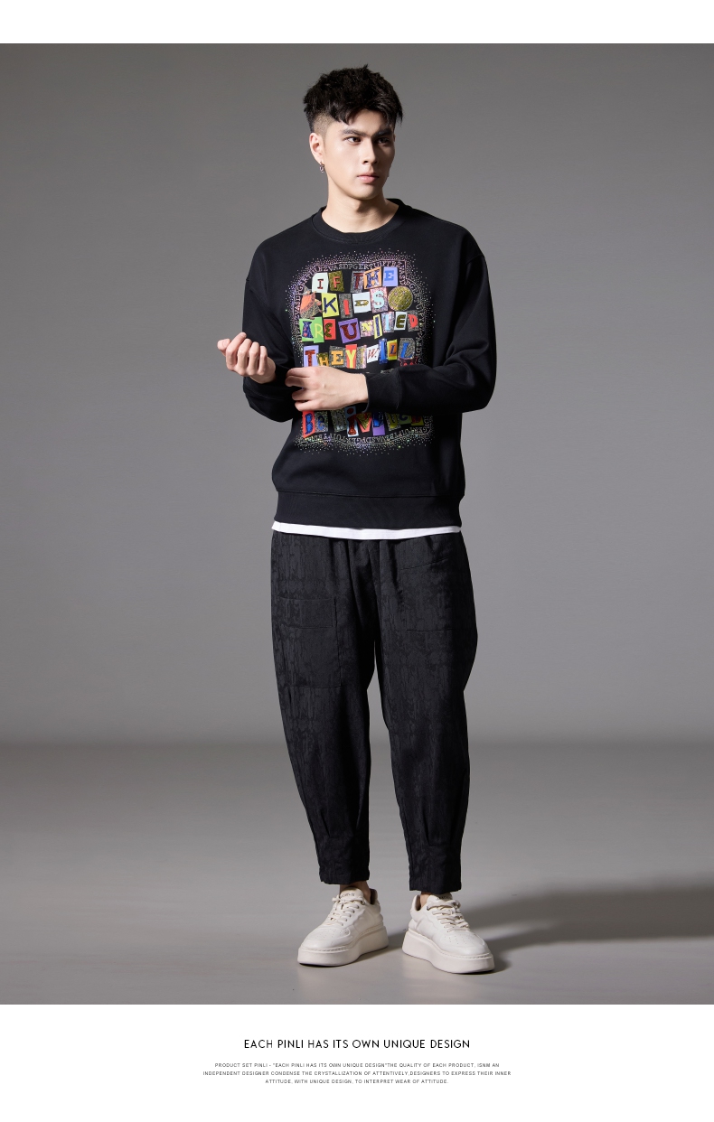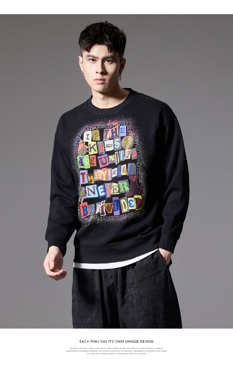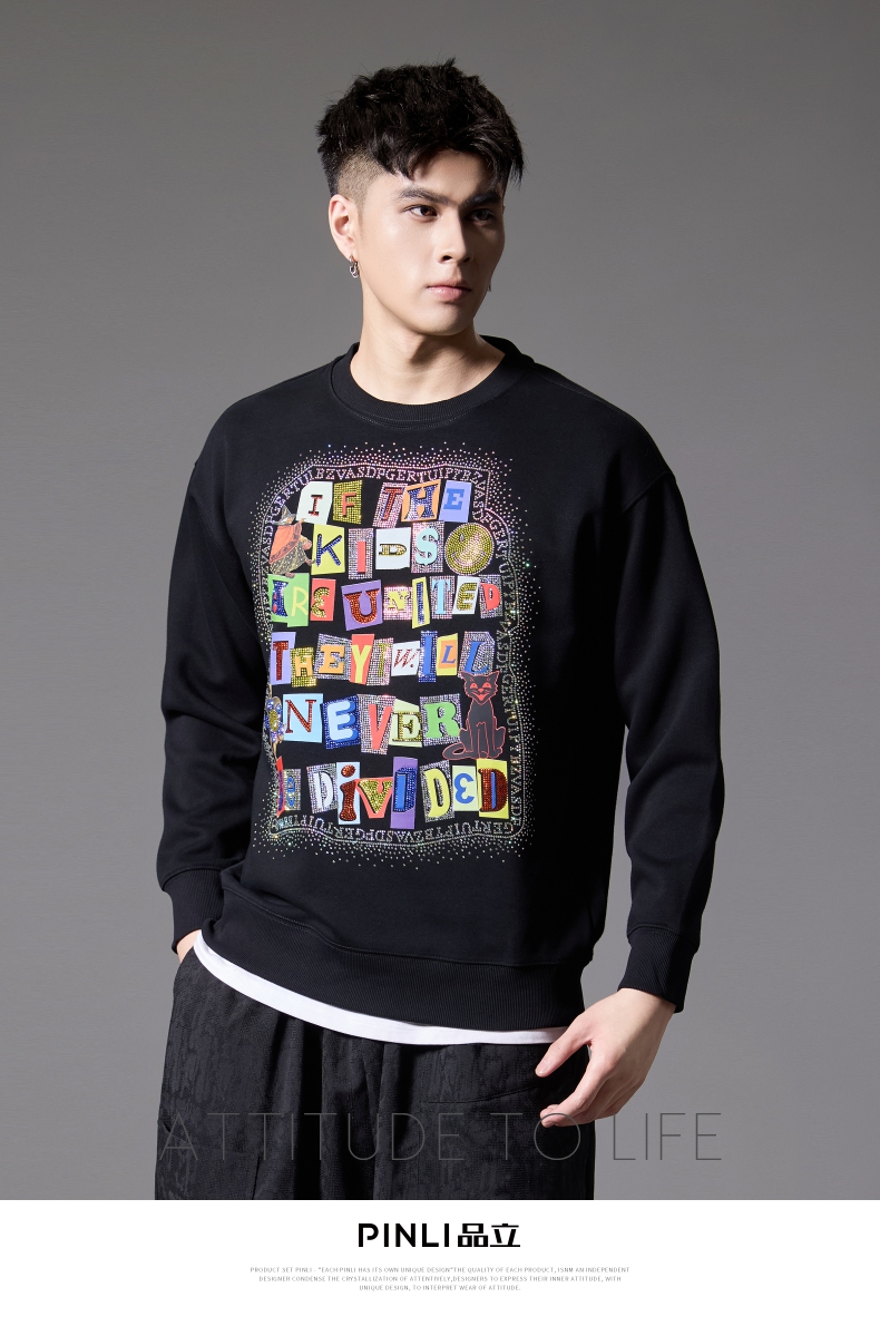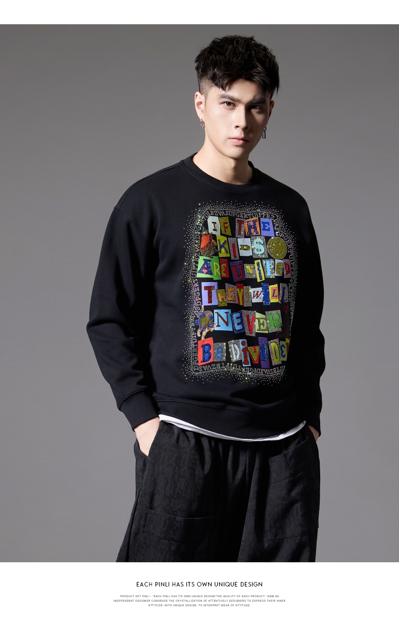 PINLI品立2024秋季新款字母烫钻圆领卫衣潮牌休闲百搭套头男上衣BG243109011