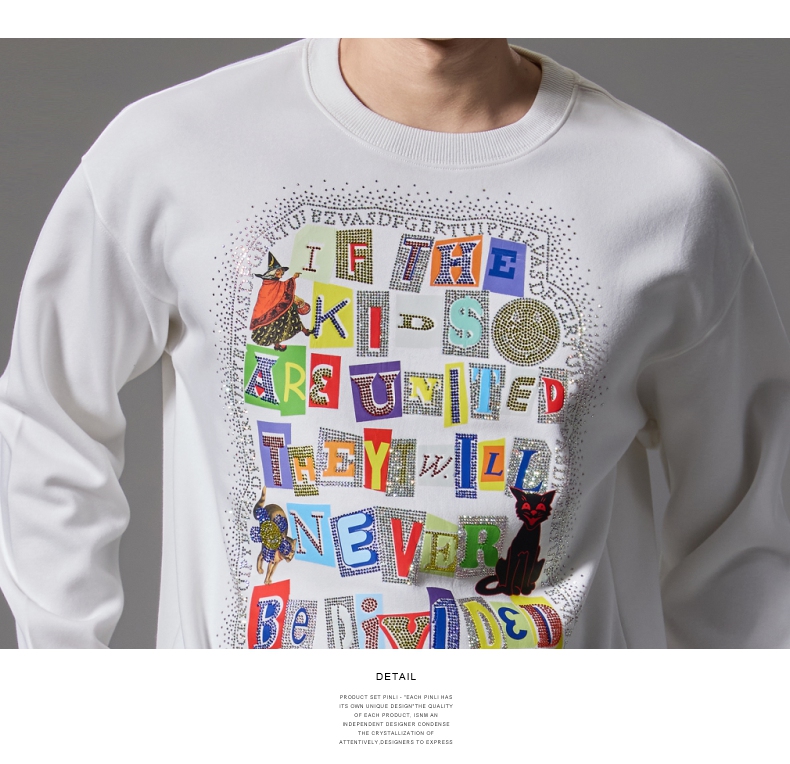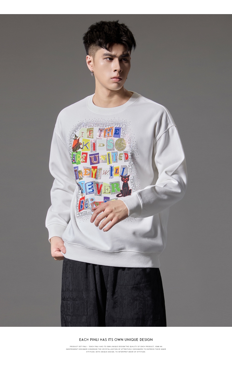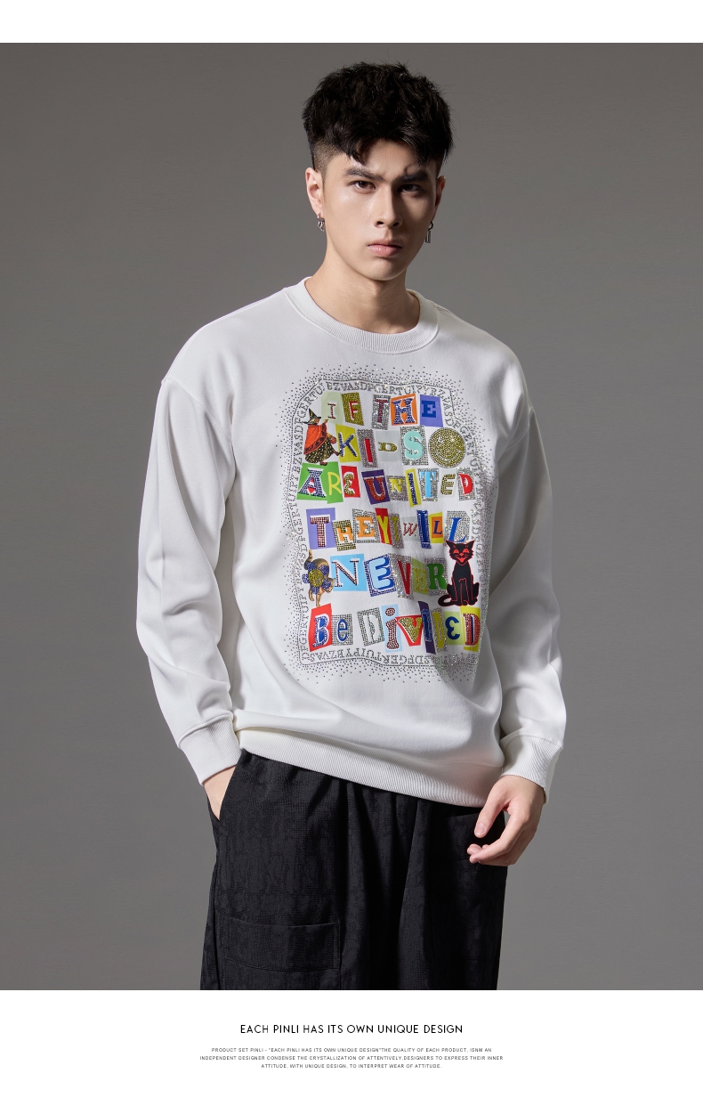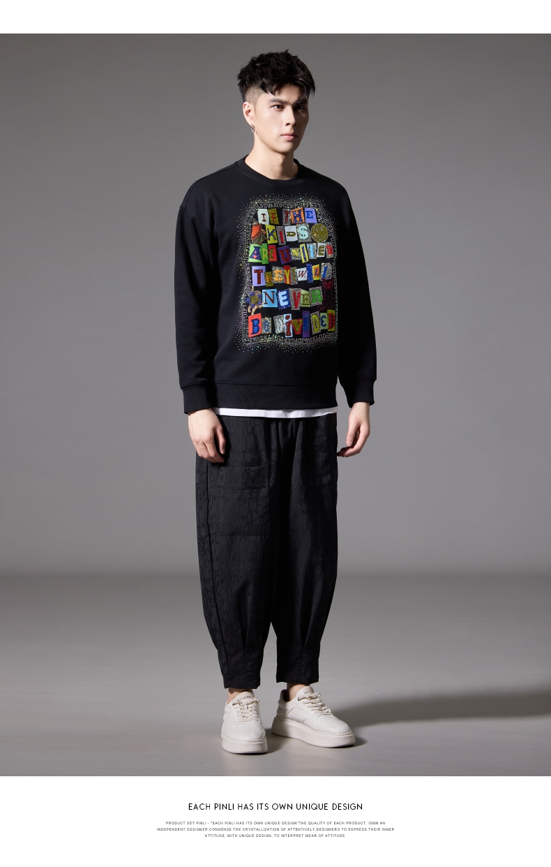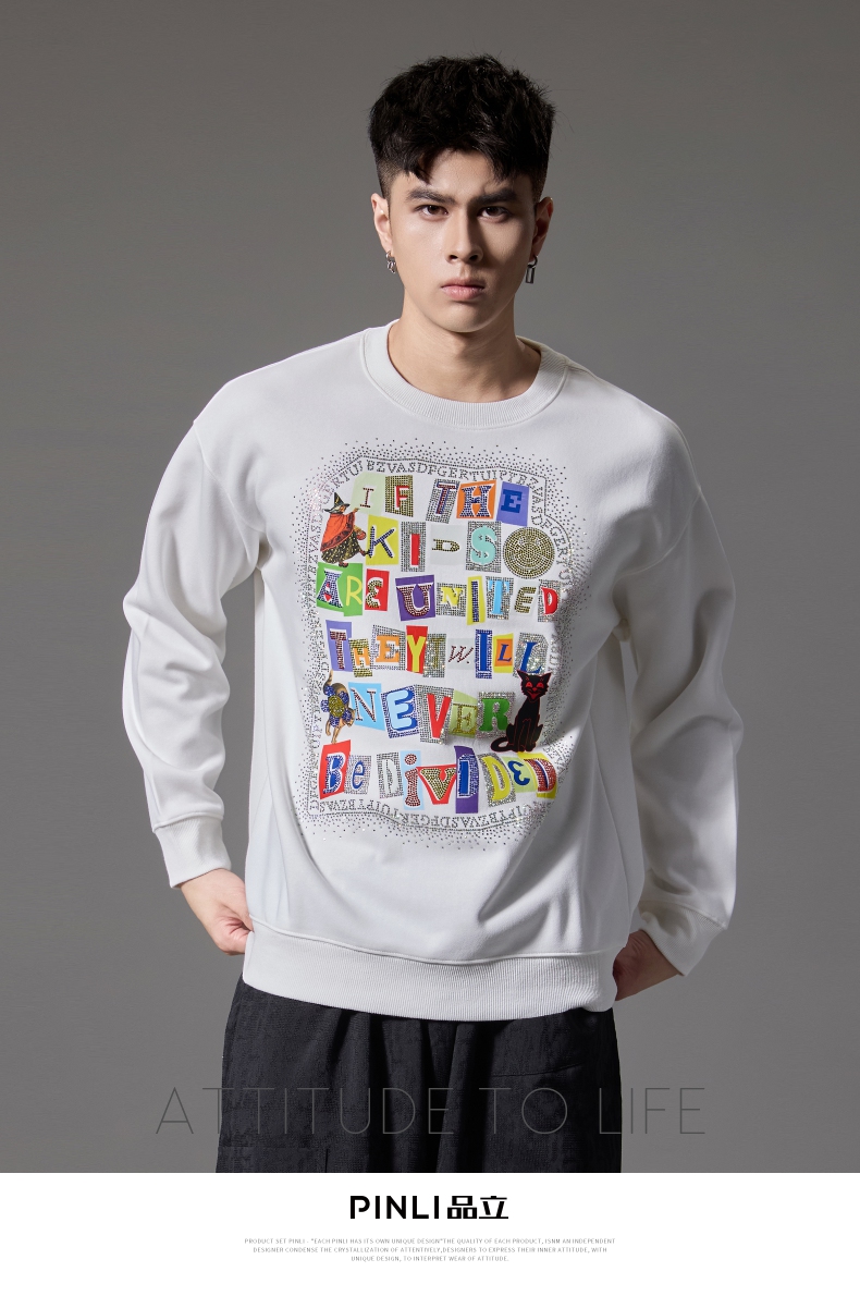 PINLI品立2024秋季新款字母烫钻圆领卫衣潮牌休闲百搭套头男上衣BG243109011