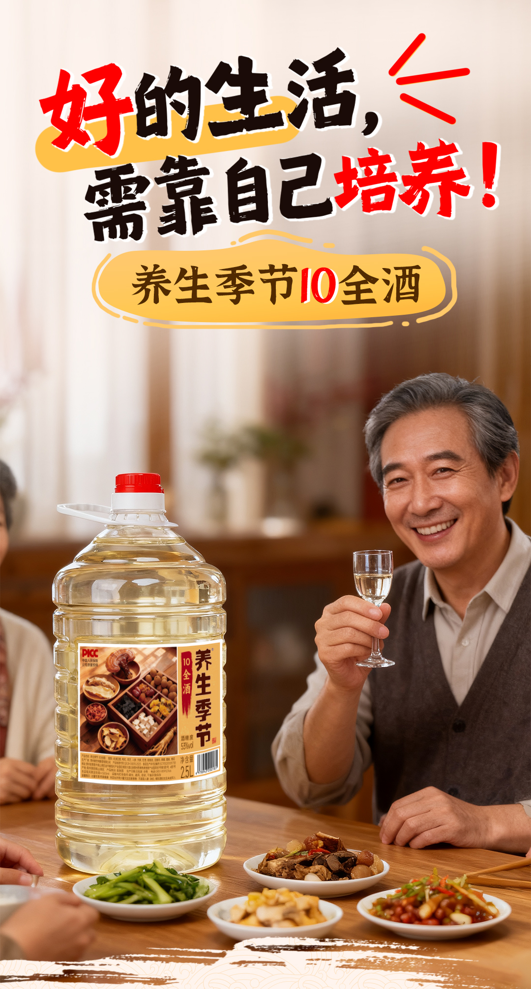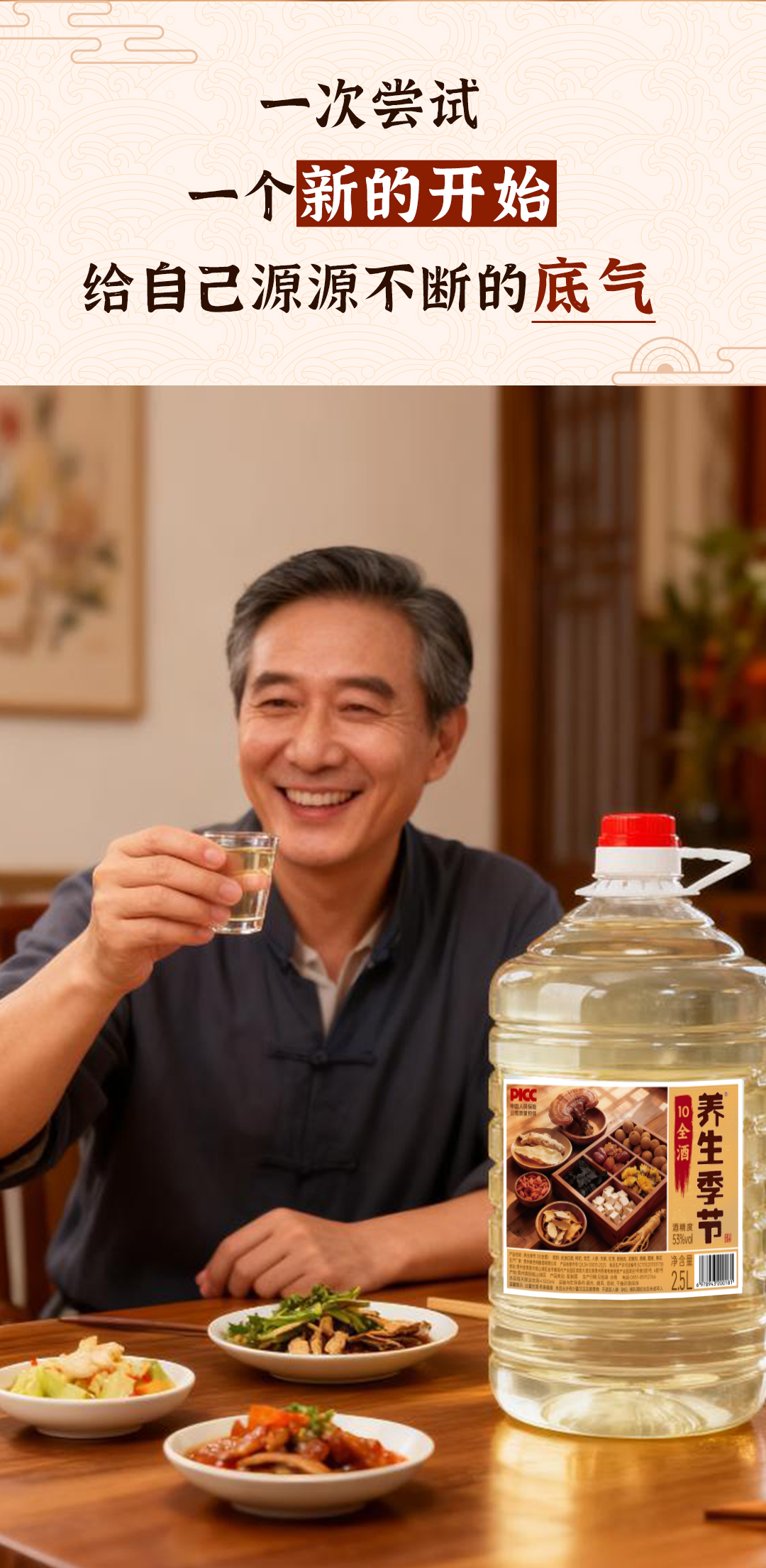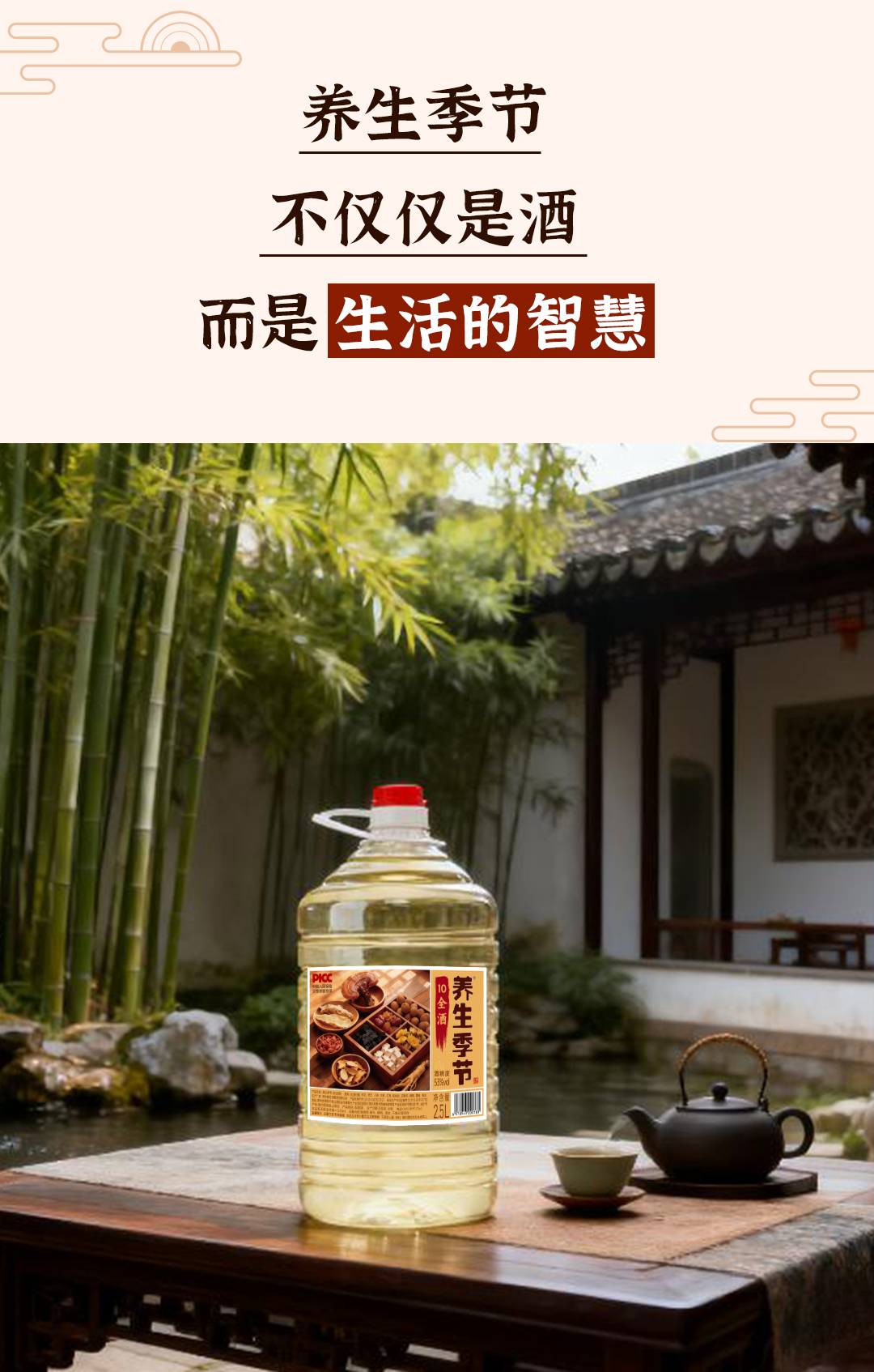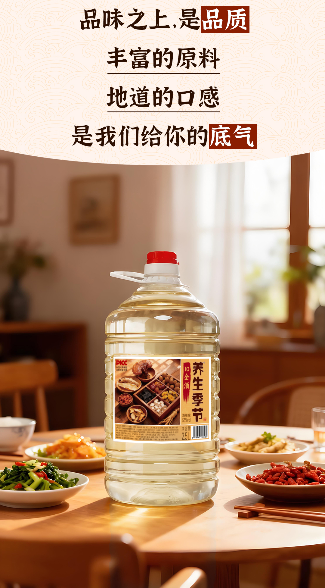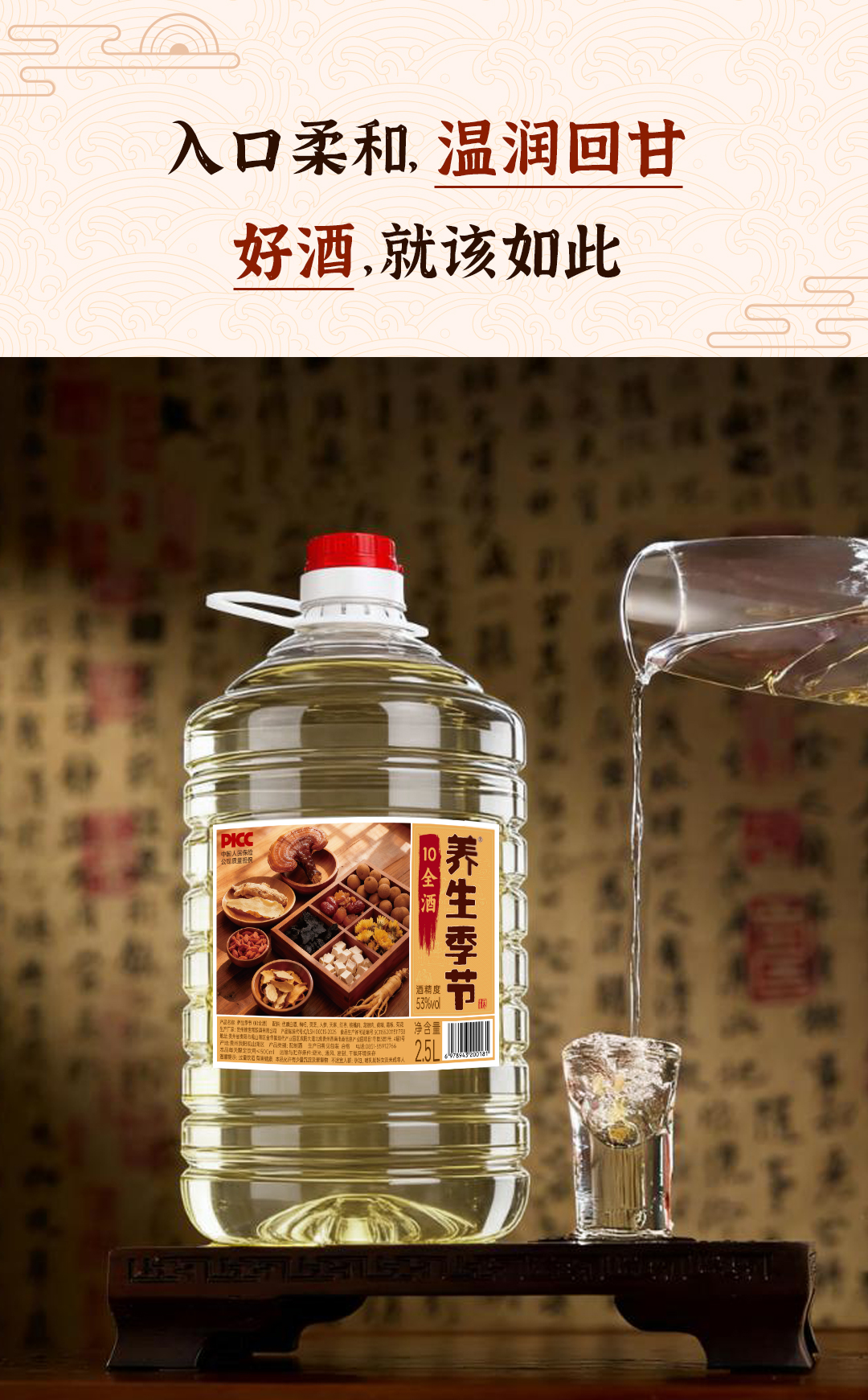养生季节(10全酒)2.5L桶装,精选枸杞、灵芝、人参、天麻、黄精、菊花共十味药材入酒,科学配比,充分侵泡 每一滴都恰到好处