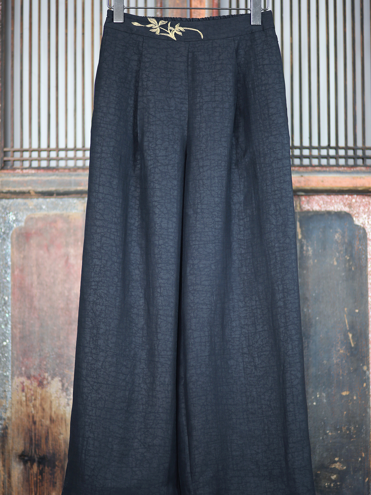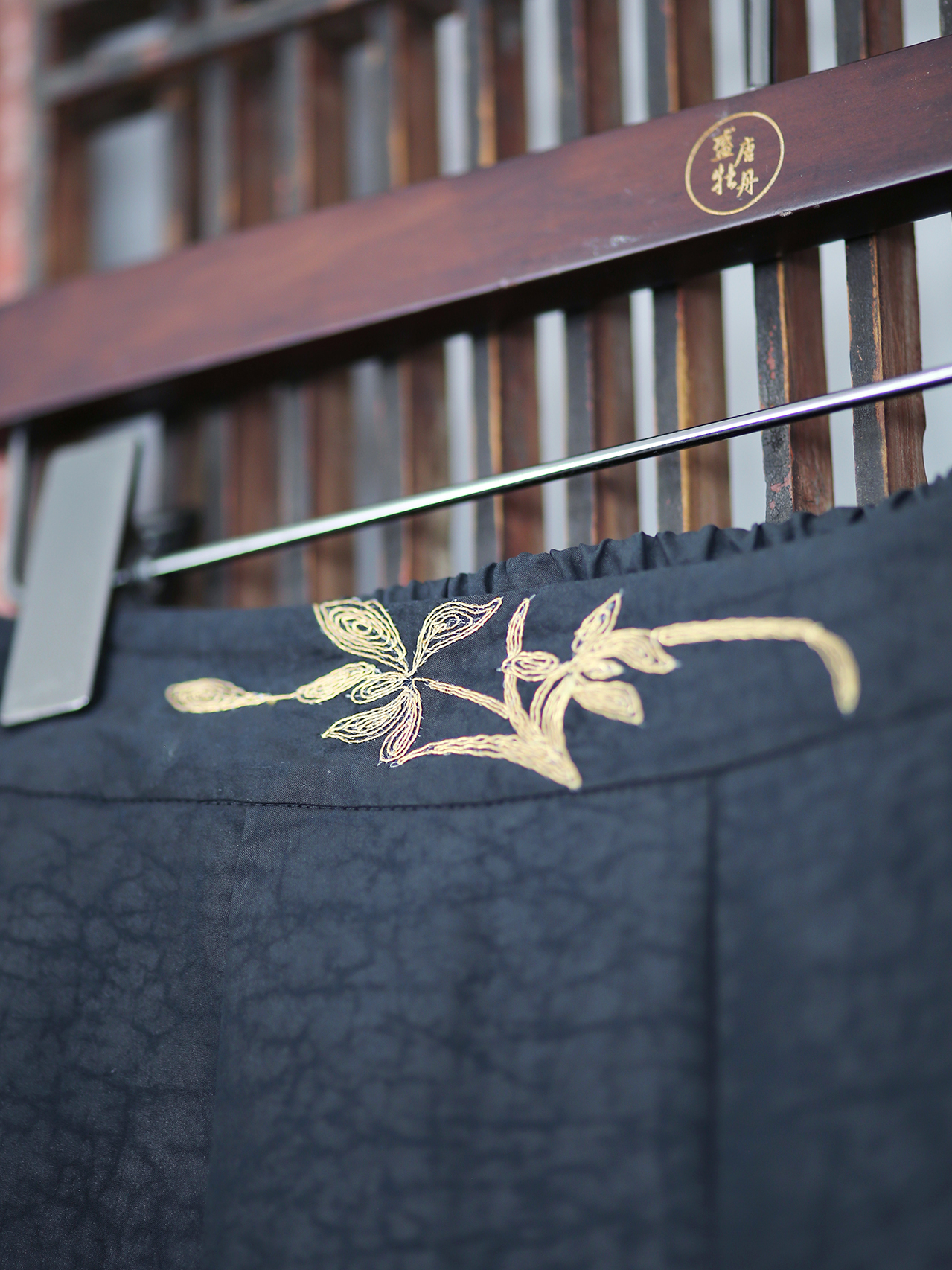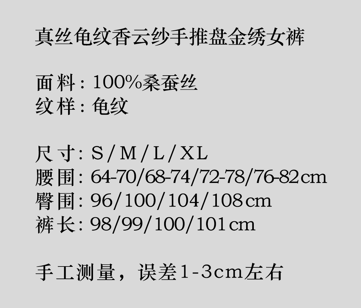 盛唐牡丹| 真丝龟纹香云纱手推盘金绣女裤
