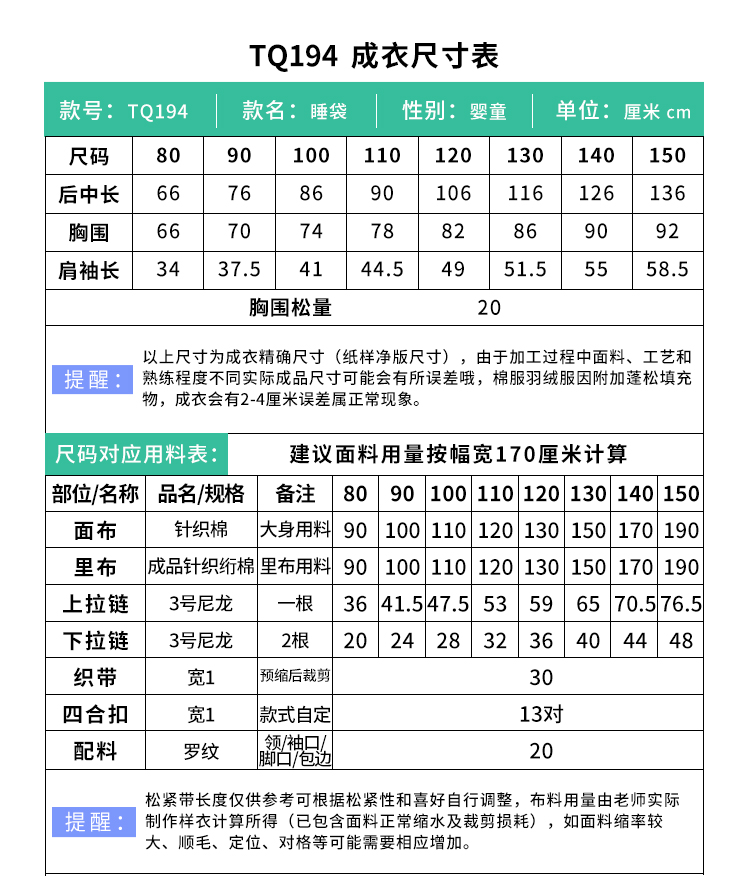 裁缝学苑TQ194婴儿睡袋纸样儿童加厚儿童分腿二合一防踢被童装样板