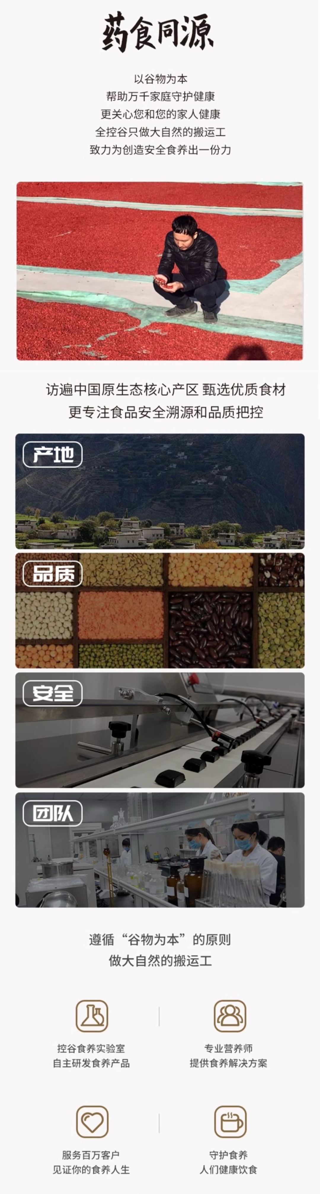 全控谷,以“谷物食疗·健康养生”为核心理念,专注于研发、生产及销售健康养生产品。品牌依托中医养生文化,结合现代营养学,推出控谷黑糕、控谷红糕等药食同源产品,覆盖代餐、养生零食等功能领域。其采用低温烘焙技术和16条自动化生产线,日产能达32000袋,并严格把控原料采购与生产检测,确保品质安全。品牌以“还食品一方净土”为使命,致力于推动健康食品行业的规范化发展,助力消费者实现科学养生。