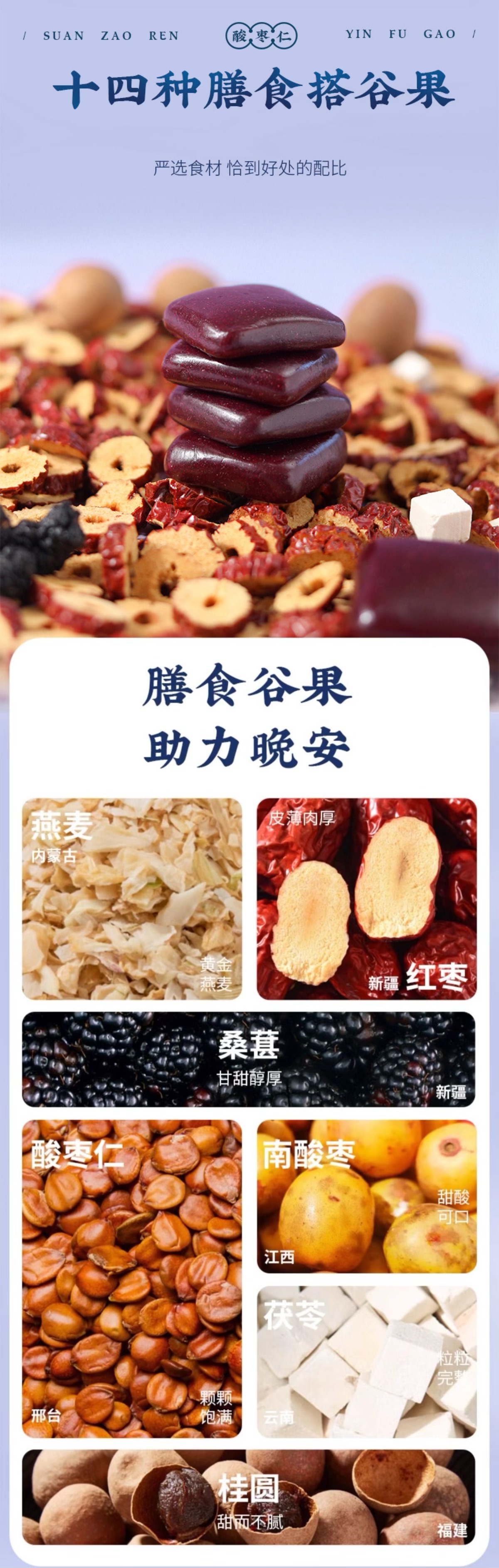 全控谷的酸枣仁银苓糕,更是在张仲景酸枣仁汤基础上升级,由14味食材制成,每一味都大有来头:酸枣仁与南酸枣双剑合璧,宁心安神效果加倍;百合、代代花共同清心解郁,缓解焦虑情绪;桂圆、红枣补益心脾;茯苓、甘草调和诸药,让配方更温和;金银花清热解毒,山楂促进消化,桑葚滋阴补血,燕麦提供能量还能促进胃肠蠕动!同时还特别添加了γ-氨基丁酸,就是晚安糖里的GABA,兼具镇静安神、疏肝解郁之效,无依赖风险,吃得安心又放心!酸枣仁银苓糕在制作上也十分考究,低温烘焙工艺锁住食材营养,更没有过度添加!