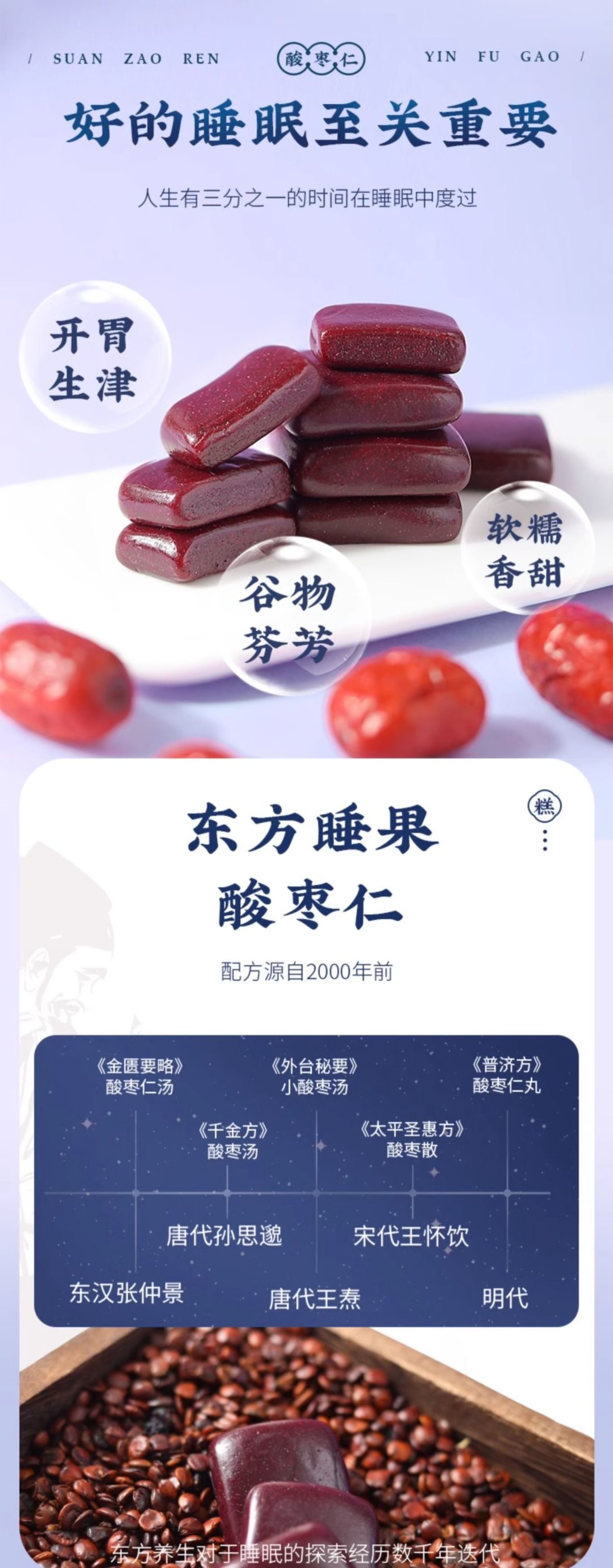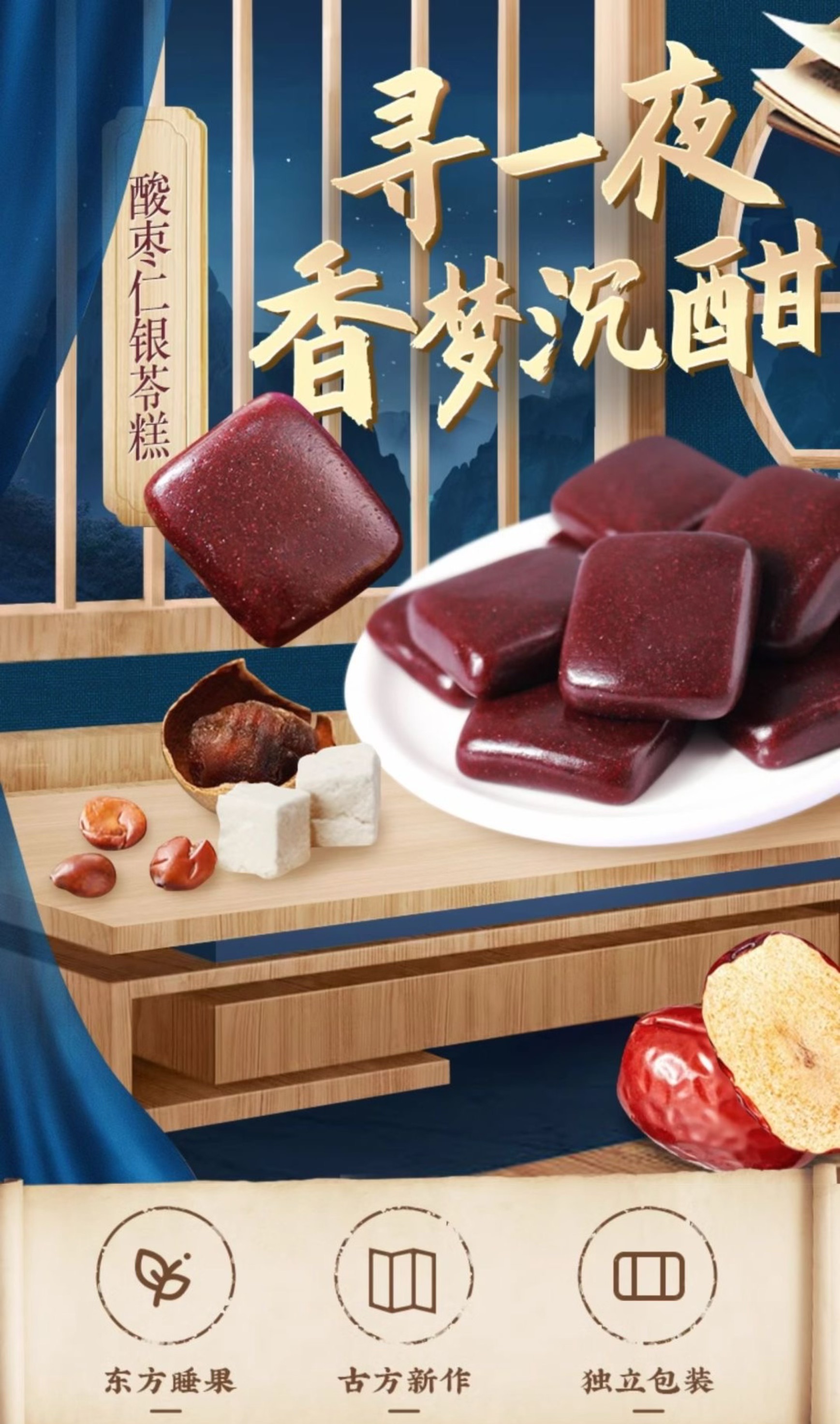酸枣仁银苓糕,口感软糯,既有谷物清香,又有红枣甘甜,多种风味完美融合!开袋即食的独立定量包装,比自己泡酸枣膏方便很多哦,而且水份少,睡前吃也不像喝汤药那样容易起夜!如果正在被低睡眠质量困扰,是真的可以吃吃,让自然的力量助你找回香甜美梦,重获精神饱满的生活状态!
