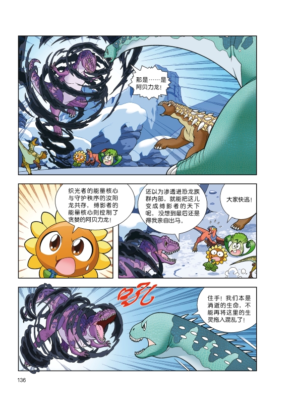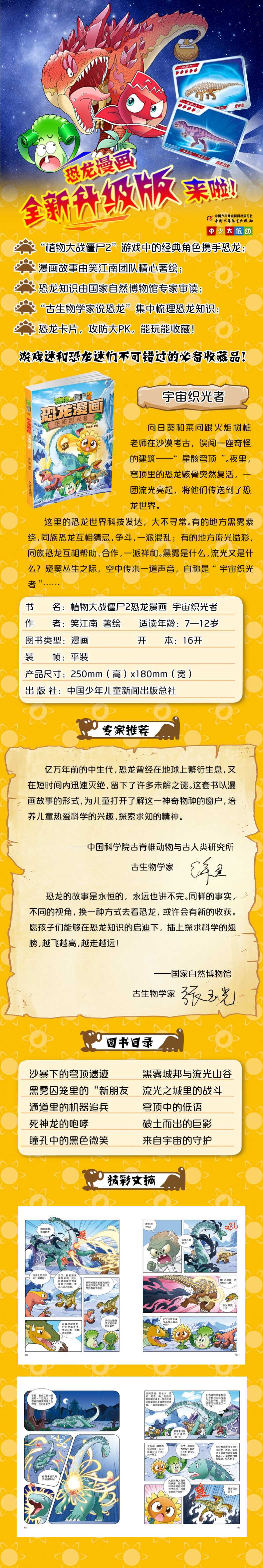 ?2、以多格漫画的形式,讲述植物与恐龙一起冒险的故事,情节跌宕起伏,引人入胜;知识点植入自然巧妙、不教条,且经过专家严格审读,难度适中,小读者在轻松读故事的同时,还能了解准确的恐龙知识。