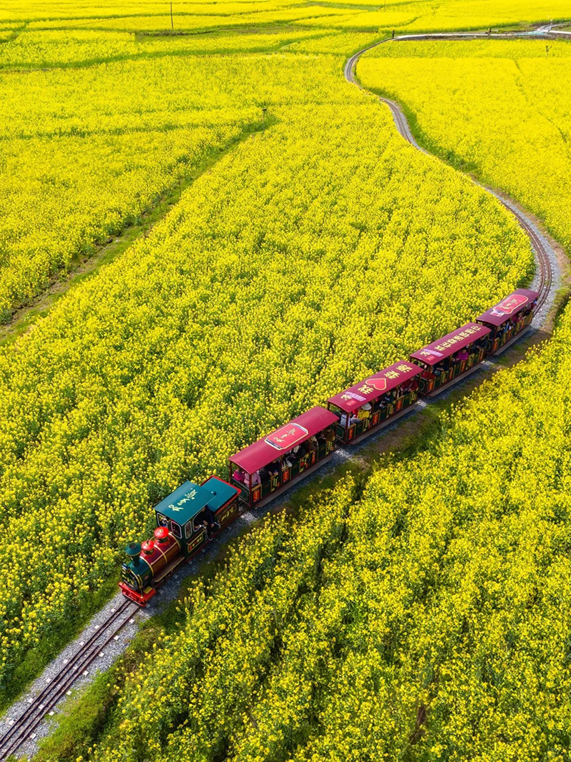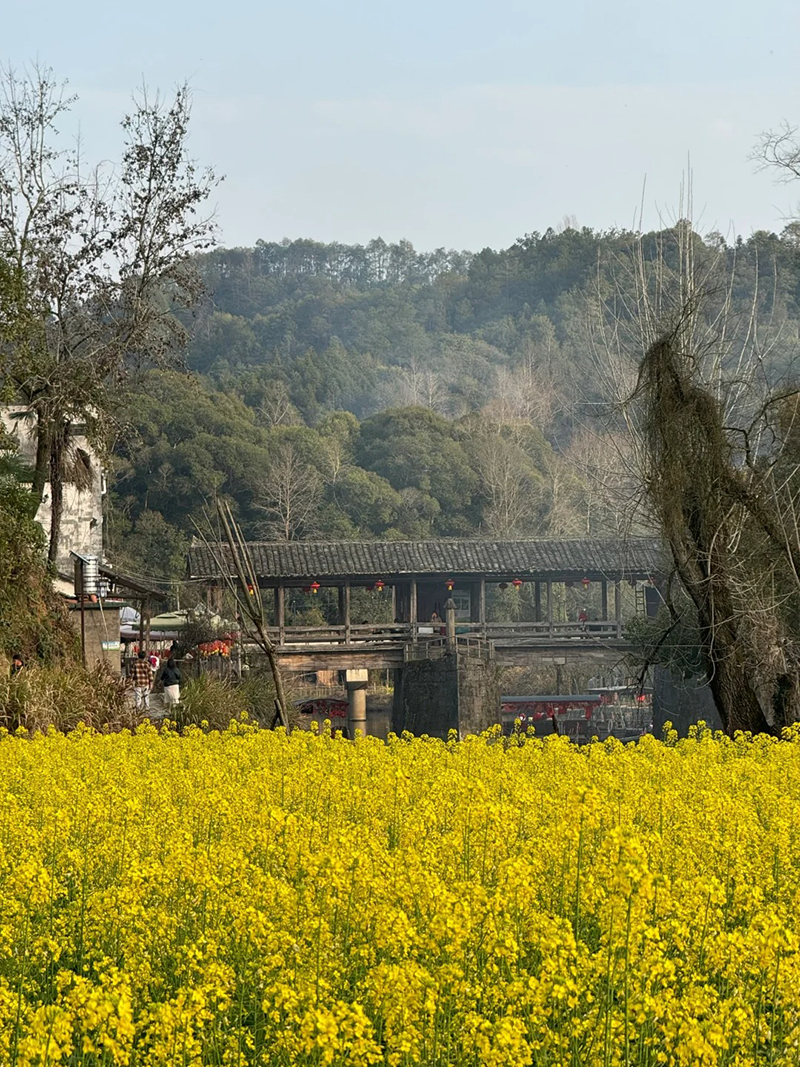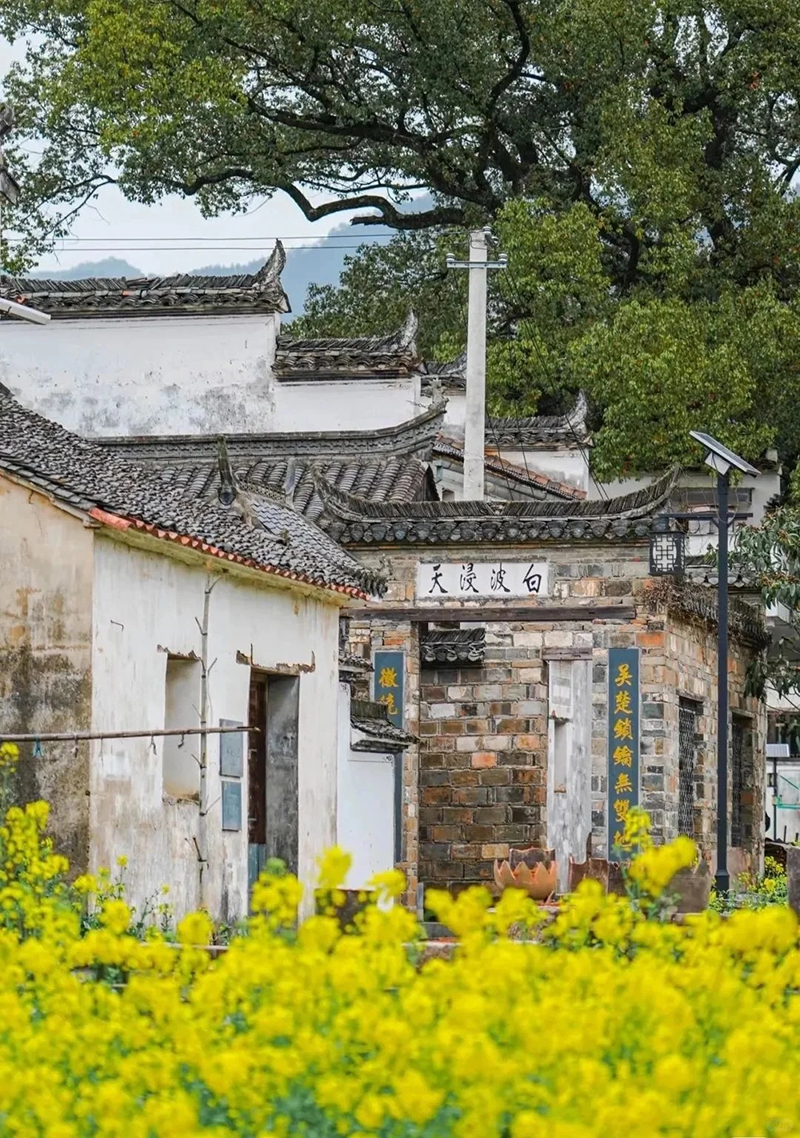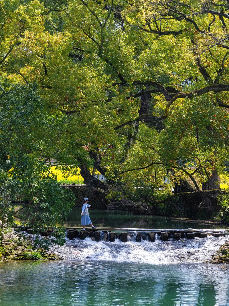 古樟号称“天下第一樟”,需要10个人环绕才能抱住。这颗古樟虽显得沧桑,但树冠枝繁叶茂,一直被当地人视为“树神”。青砖黛瓦的徽派建筑错落有致,与古樟相互映衬,仿佛在诉说着古老的故事。蓝天白云下,小火车缓缓行驶,悠悠穿越那一大片油菜花, 就像走进了童话世界,拍照打卡绝绝子