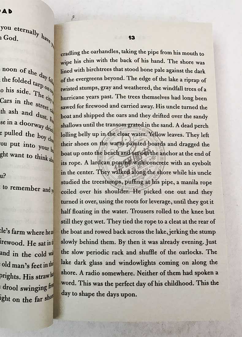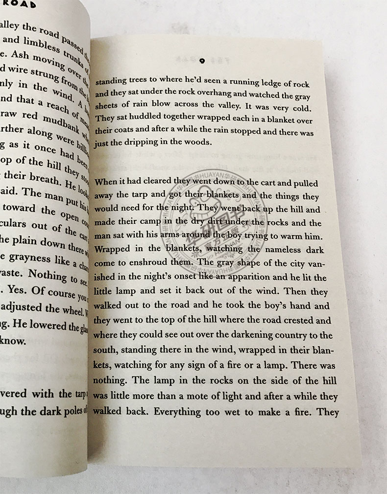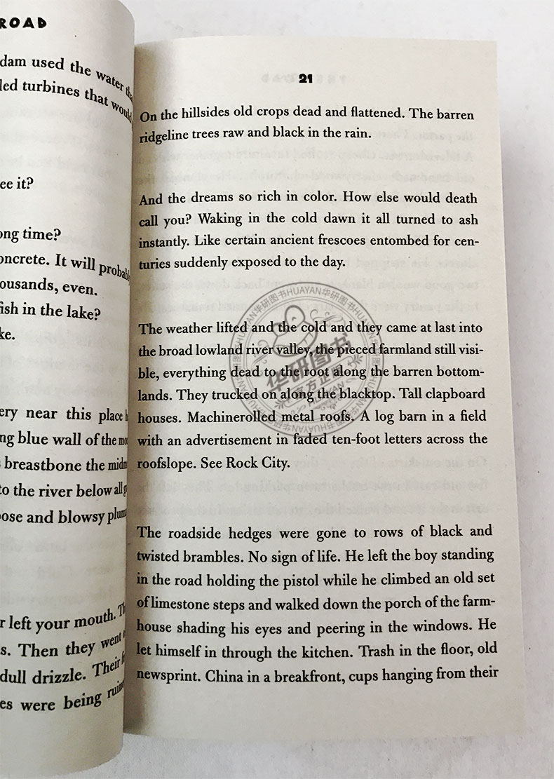 When he woke in the woods in the dark and the cold of the night he’d reach out to touch the child sleeping beside him. Nights dark beyond darkness and the days more gray each one than what had gone before. Like the onset of some cold glaucoma dimming away the world. His hand rose and fell softly with each precious breath. He pushed away the plastic tarpaulin and raised himself in the stinking robes and blankets and looked toward the east for any light but there was none. In the dream from which he’d wakened he had wandered in a cave where the child led him by the hand. Their light playing over the wet flowstone walls. Like pilgrims in a fable swallowed up and lost among the inward parts of some granitic beast. Deep stone flues where the water dripped and sang. Tolling in the silence the minutes of the earth and the hours and the days of it and the years without cease. Until they stood in a great stone room where lay a black and ancient lake. And on the far shore a creature that raised its dripping mouth from the rimstone pool and stared into the light with eyes dead white and sightless as the eggs of spiders. It swung its head low over the water as if to take the scent of what it could not see. Crouching there pale and naked and translucent, its alabaster bones cast up in shadow on the rocks behind it. Its bowels, its beating heart. The brain that pulsed in a dull glass bell. It swung its head from side to side and then gave out a low moan and turned and lurched away and loped soundlessly into the dark. With the first gray light he rose and left the boy sleeping and walked out to the road and squatted and studied the country to the south. Barren, silent, godless. He thought the month was October but he wasnt sure. He hadnt kept a calendar for years. They were moving south. There’d be no surviving another winter here. When it was light enough to use the binoculars he glassed the valley below. Everything paling away into the murk. The soft ash blowing in loose swirls over the blacktop. He studied what he could see. The segments of road down there among the dead trees. Looking for anything of color. Any movement. Any trace of standing smoke. He lowered the glasses and pulled down the cotton mask from his face and wiped his nose on the back of his wrist and then glassed the country again. Then he just sat there holding the binoculars and watching the ashen daylight congeal over the land. He knew only that the child was his warrant. He said: If he is not the word of God God never spoke. When he got back the boy was still asleep. He pulled the blue plastic tarp off of him and folded it and carried it out to the grocery cart and packed it and came back with their plates and some cornmeal cakes in a plastic bag and a plastic bottle of syrup. He spread the small tarp they used for a table on the ground and laid everything out and he took the pistol from his belt and laid it on the cloth and then he just sat watching the boy sleep. He’d pulled away his mask in the night and it was buried somewhere in the blankets. He watched the boy and he looked out through the trees toward the road. This was not a safe place. They could be seen from the road now it was day. The boy turned in the blankets. Then he opened his eyes. Hi, Papa, he said. I’m right here. I know. An hour later they were on the road. He pushed the cart and both he and the boy carried knapsacks. In the knapsacks were essential things. In case they had to abandon the cart and make a run for it. Clamped to the handle of the cart was a chrome motorcycle mirror that he used to watch the road behind them. He shifted the pack higher on his shoulders and looked out over the wasted country. The road was empty. Below in the little valley the still gray serpentine of a river. Motionless and precise. Along the shore a burden of dead reeds. Are you okay? he said. The boy nodded. Then they set out along the blacktop in the gunmetal light, shuffling through the ash, each the other’s world entire.
