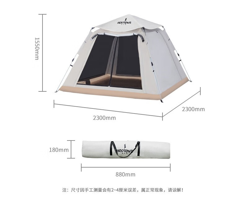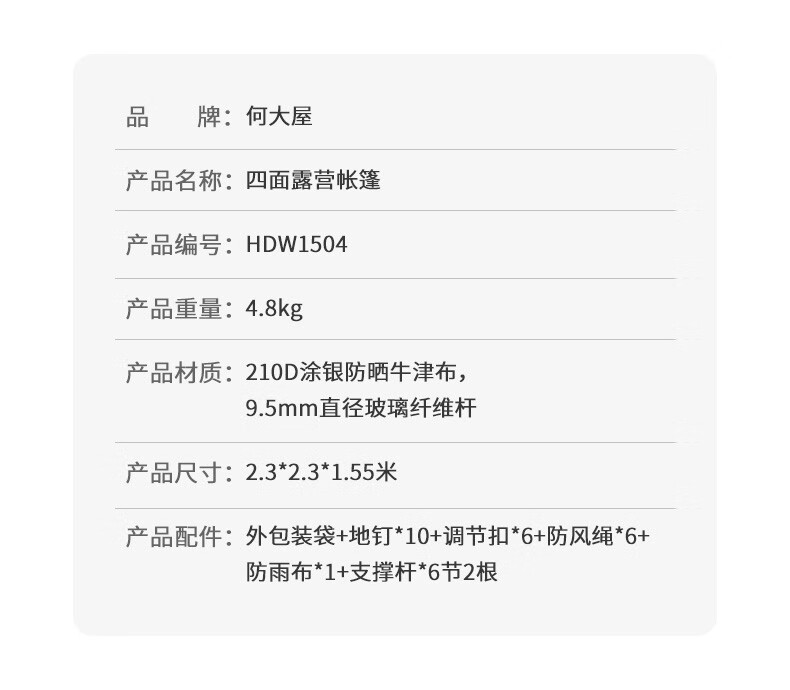商品配件:外包装袋+地钉*10+调节扣*6+防风绳*6+防雨布*1+支撑杆*6节2根