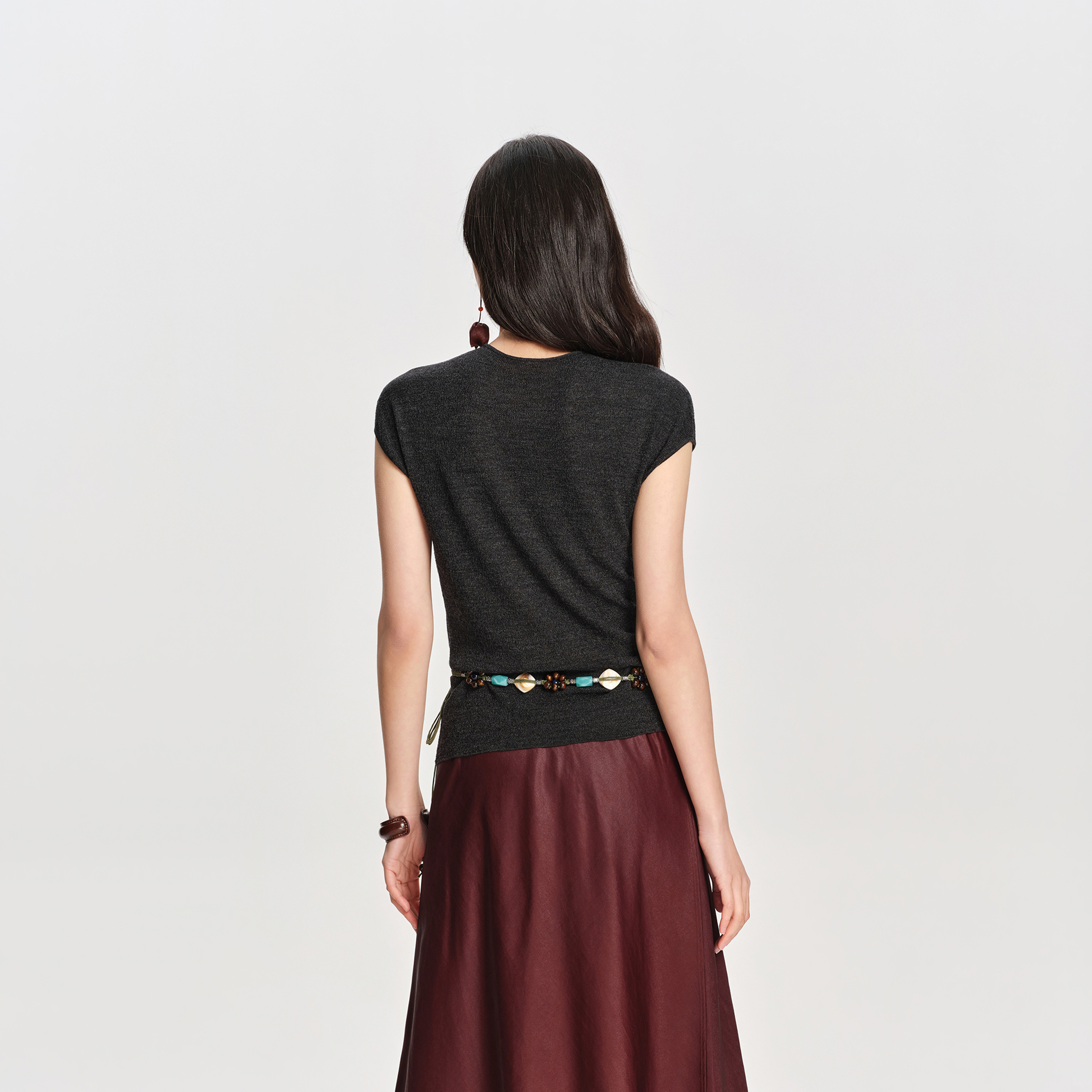 3.【独特肌理针法】针法独特,面料有强烈立体感与收缩性,打破常规针织衫的单调感。