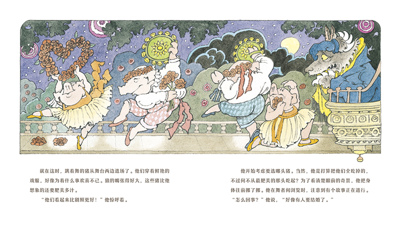 《仙猪湖》图画作者桑达克曾经参与过芭蕾舞剧的制作,还经常和文字作者马歇尔一起观看戏剧演出。因此,芭蕾表演的美妙、演员的忘情和观众的沉浸被描绘得生动异常。然而,美妙之中潜藏危机,时刻让读者提心吊胆,直到后一页。