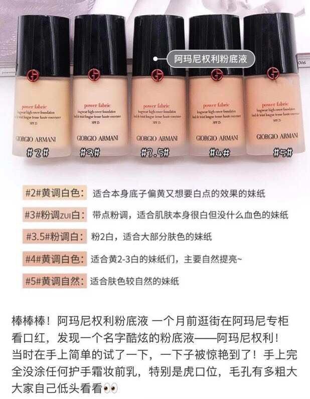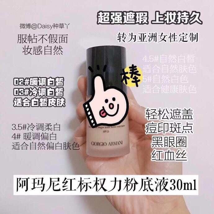 丝芙兰折扣❗️【阿玛尼权力粉底液30ml】自带SPF25,最近很多博主推荐的,明星圈也超级火爆,秦岚狠狠推荐过,阿玛尼新款power fabric粉底,也叫“权力粉底液” ,遮瑕力度一级棒,油皮混油皮真爱 ,吃完火锅也仍然服帖光泽,哑光感遮瑕一级棒,可以10小时带妆不花,对于夏天来说持久性太重要了,终于可以不用出门就花脸啦!530包邮