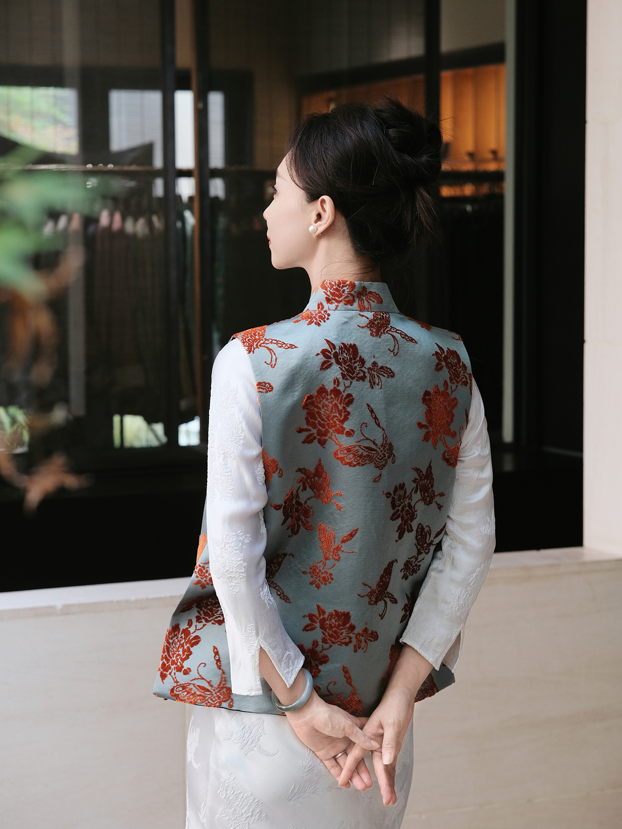 盛唐牡丹|铁锈红绒色真丝漳缎马甲(里料蝶恋花)