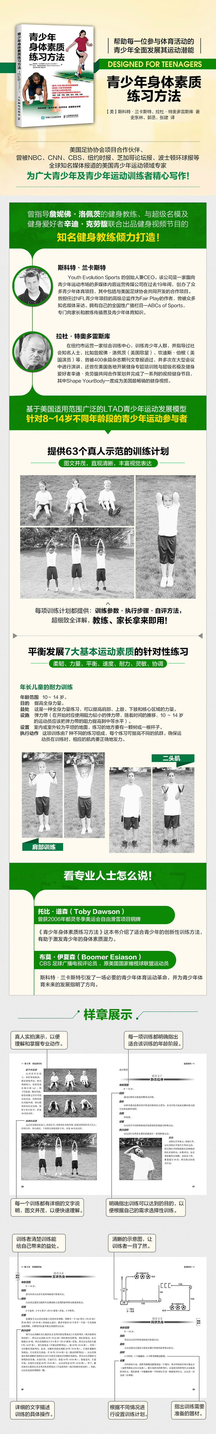 作者简介 斯科特·兰卡斯特 斯科特·兰卡斯特是Youth Evolution Sports 的创始人兼CEO。该公司是一家面向青少年运动市场的多媒体内容运营传媒公司,专门服务于儿童、家长、教练、公司以及各大职业体育联盟和机构。在过去19 年间,斯科特·兰卡斯特创办了众多青少年体育项目,其中包括与美国足球协会共同开发的合作项目。他曾担任过NFL 青少年项目的高级总监。作为Fair Play 的作者,他曾被众多知名媒体采访,其中包括美国国家广播公司(NBC)的Today Show 栏目、CNN 有线电视网、美国哥伦比亚广播公司(CBS)的Early Show 栏目、纽约时报、芝加哥论坛报、波士顿环球报、美国国家广播电台(NPR),以及Woman’s Day 和Ladies’ Home 这两本女性时尚期刊。同时,他在天狼星广播台(Sirius Radio)的123频道拥有自己的全国性广播栏目—ABCs of Sports,专 门向家长和教练传播普及青少年体育知识。 拉杜·特奥多雷斯库 拉杜·特奥多雷斯库在纽约市运营一家综合训练中心。他既训练青少年人群,也指导过一些社会知名人士,比如詹妮佛·洛佩茨(美国歌星)、坎迪斯·伯根(美国演员)、马修·布罗德里克(美国演员)、瓦妮萨·威廉姆斯(美国歌星)等。他曾被400 余 篇杂志期刊文章报道过,并多次在大型会议中进行演讲,还曾在美国各地开展健身专题培训班。他与超级名模及健身爱好者辛迪·克劳馥共同合作策划并完成了一系列的视频健身节目,其中Shape YourBody 更是一度成为美国最畅销的健身视频。 译者简介 史东林 研究员,硕士生导师,乌克兰哈尔科夫国立体育科学院奥林匹克与职业体育专业博士,北京体育大学博士后。现任河北省体育科学研究所所长,学术带头人;兼任河北省体育科学学会副理事长、中国体育科学学会运动训练学分会田径专业委员会常委、全田径理论研究会委员。长期从事运动训练方面的研究工作,作为第一负责人主持省部级课题六项,获省部级进步三等奖三项;有著作三部,在国内外专业核心期刊发表论文十余篇。 郭丞 沈阳体育学院运动人体科学硕士;备战2016 里约奥运会身体功能训练团队物理治疗组组长;为跳水、举重、乒乓球、羽毛球、田径等多支国家队提供过身体功能评估和物理治疗服务;在河北省体育科学研究所长期参与青少年运动员选材与研究工作,曾获两次省部级科技进步奖,在国内多家期刊和国内外会议发表运动科学、医学相关论文十余篇;主要研究方向:体能康复研究、物理治疗、运动生理学。 张建 河北师范大学体育硕士;备战2016里约奥运会身体功能训练团队中方体能执行教练;主要负责备战里约奥运会期间中国自行车队场地短距离国家队的体能测评与训练指导服务;长期参与河北省体育科学研究所的青少年运动员选材与研究工作;在国内多家期刊和国内外会议发表运动科学相关论文十余篇;主要研究方向:运动训练、体能训练。