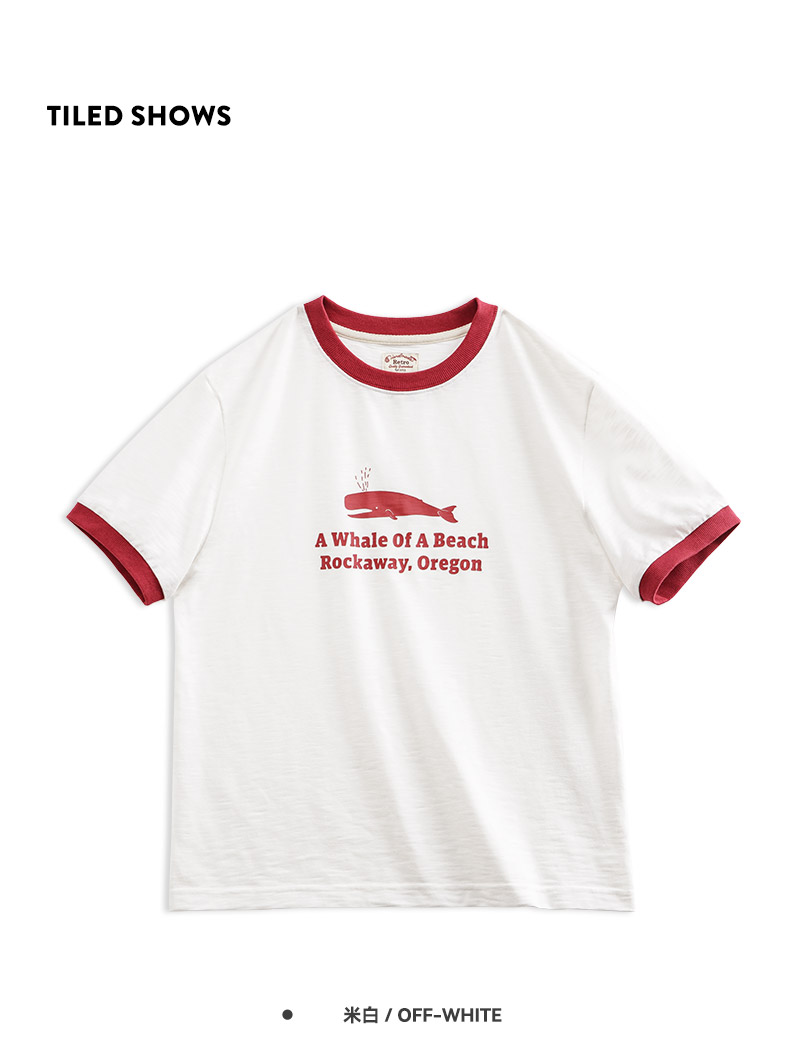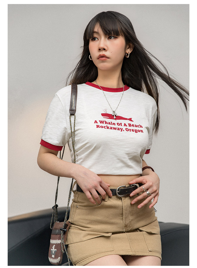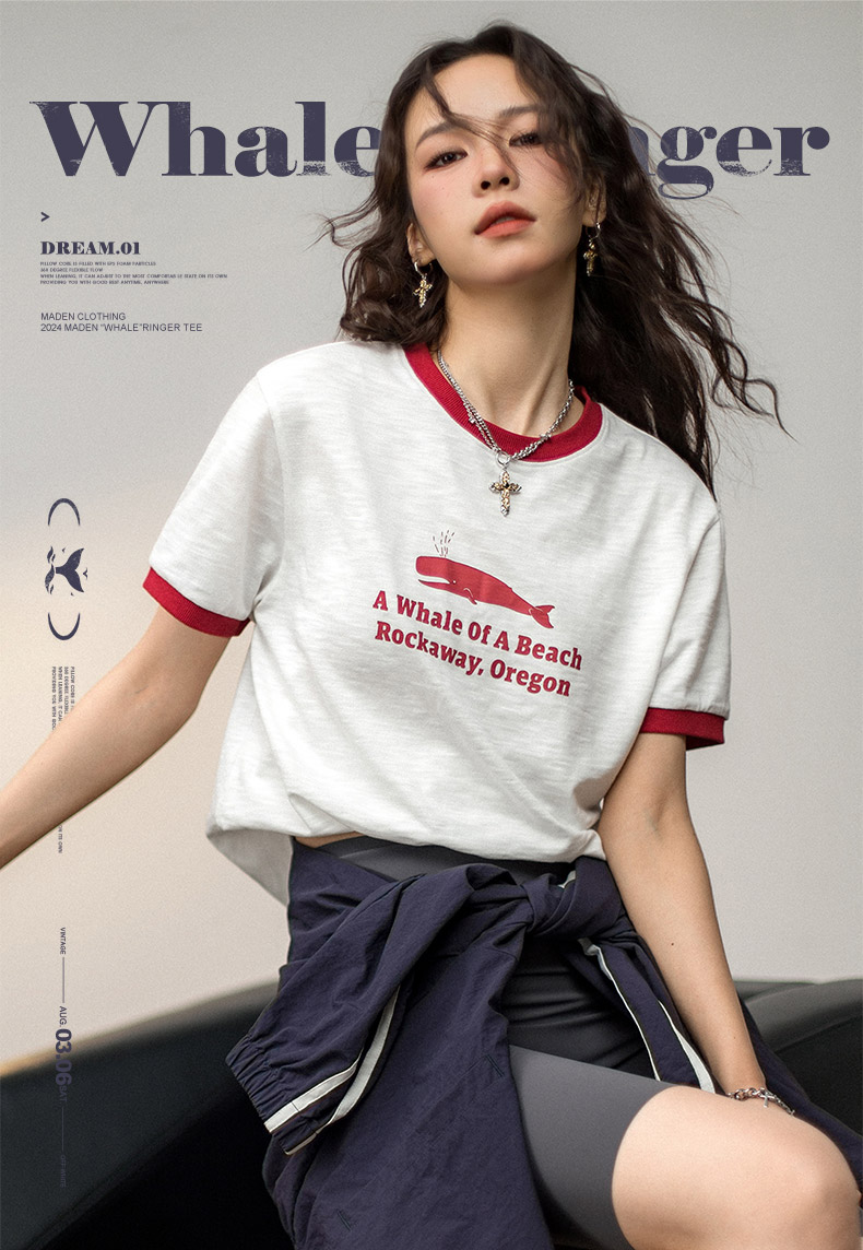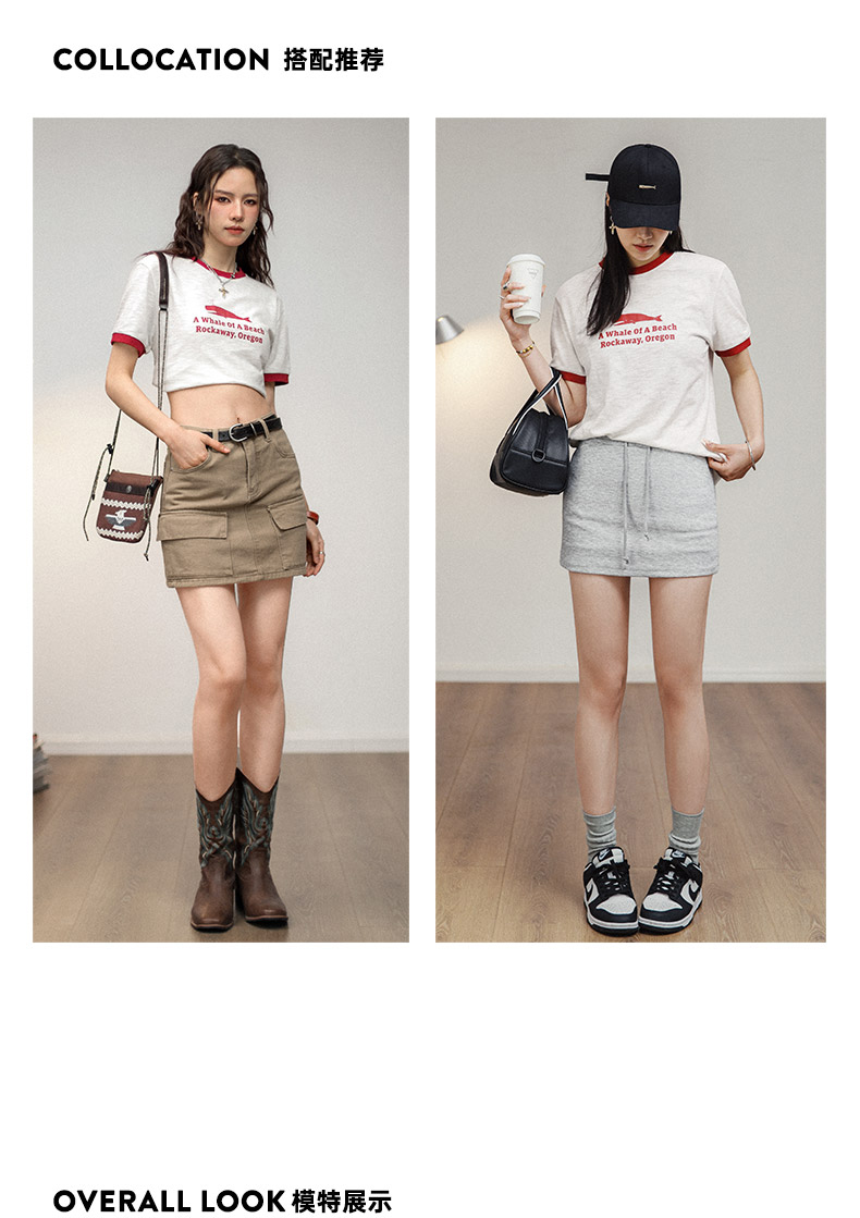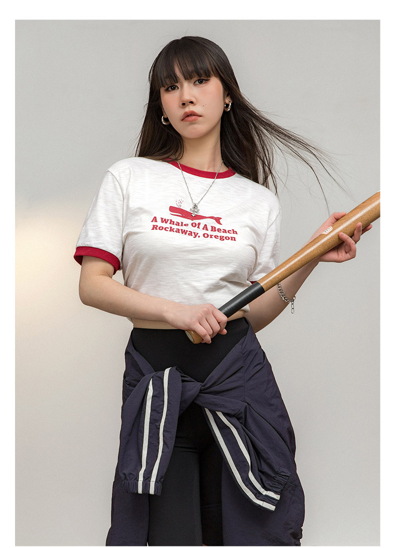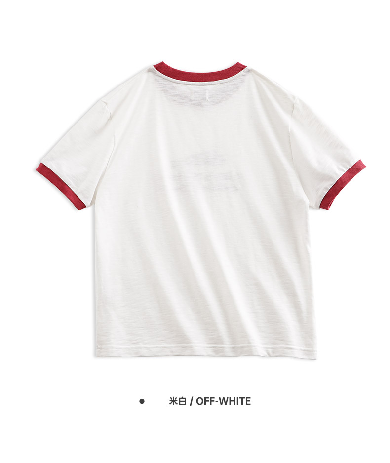 马登印花字母短袖休闲宽松圆领上衣正肩T恤撞色罗纹显瘦打底衫女