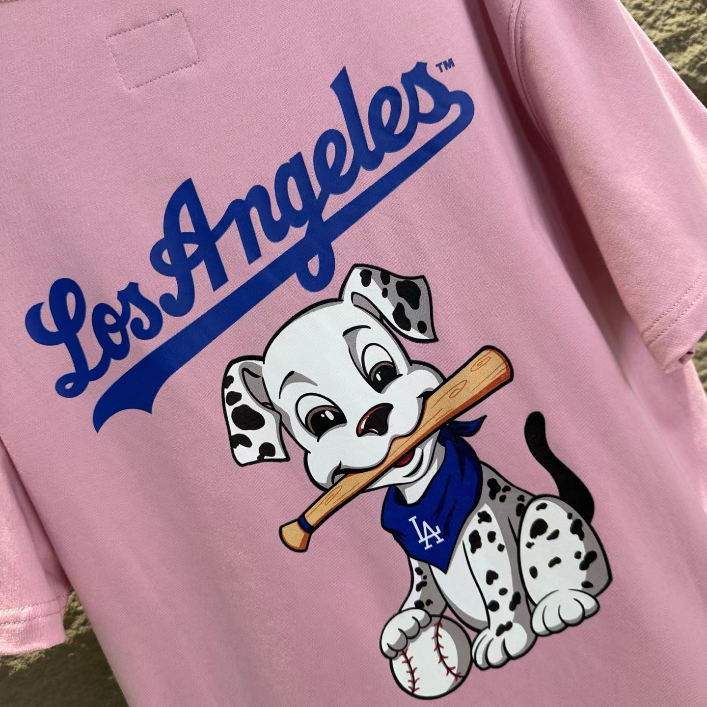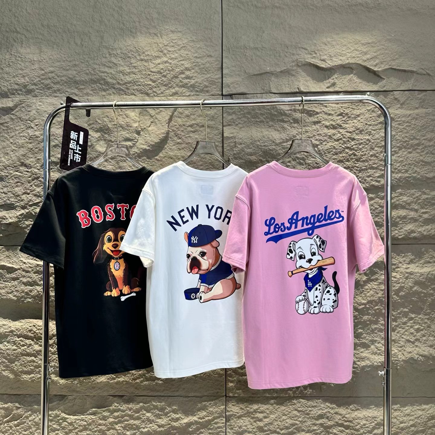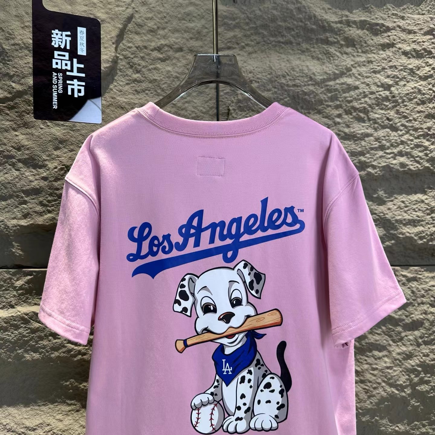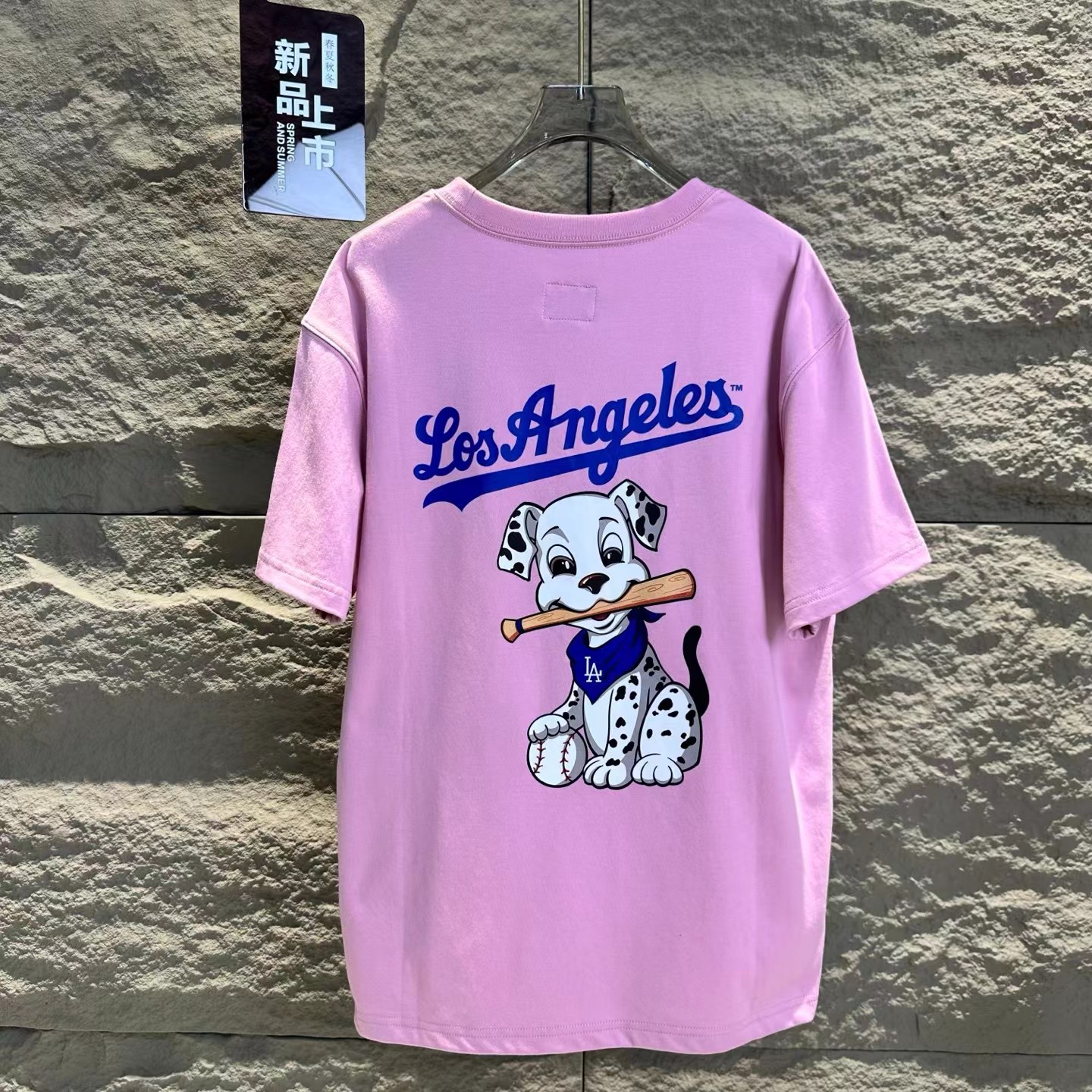 春季新款萌宠印花短袖T恤运动透气上衣男女。 萌宠系列短袖,主打趣味运动风格。背面图案:粉色背面印有字样与斑点狗(大麦町犬)卡通形象,小狗叼着棒球棒、抱着棒球,充满棒球运动趣味。黑色背面的是腊肠犬的卡通形象长耳粽狗。白色背面的是法国斗牛犬的卡通演绎。正面:左胸有字母/队徽设计,袖口带有小徽标点缀。版型:宽松直筒常规版型,适合日常休闲与运动穿搭,面料与穿着,,面料:棉+涤纶混纺,兼顾柔软亲肤 透气鞋与挺括不易变形 厚度:适中,适合夏季穿着。追求时尚舒适运动风,男女都可以。